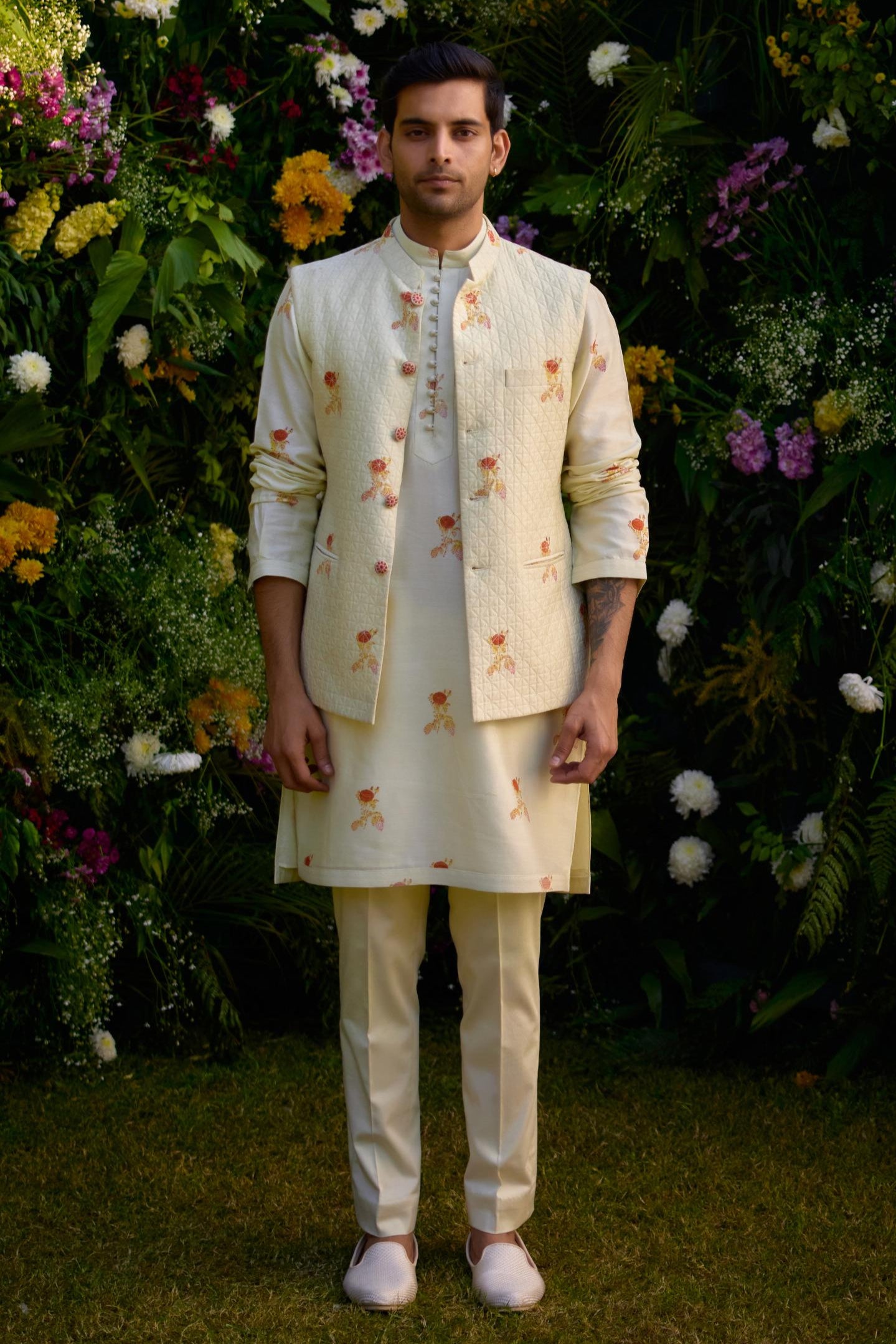 This winter white kurta set by Shyam Narayan Prasad is designed for festive weddings and formal celebrations. The quilted silk chanderi waistcoat adds refinement while the hand block printed kurta enhances cultural elegance. Ideal for winter weddings, evening receptions, or engagement ceremonies, this kurta set balances style and comfort. The lightweight fabric allows easy movement, while the tailored waistcoat ensures a polished look. Perfect for groomsmen or wedding guests, this set blends heritage craftsmanship with modern appeal, making it a must-have for men who appreciate timeless festive fashion.