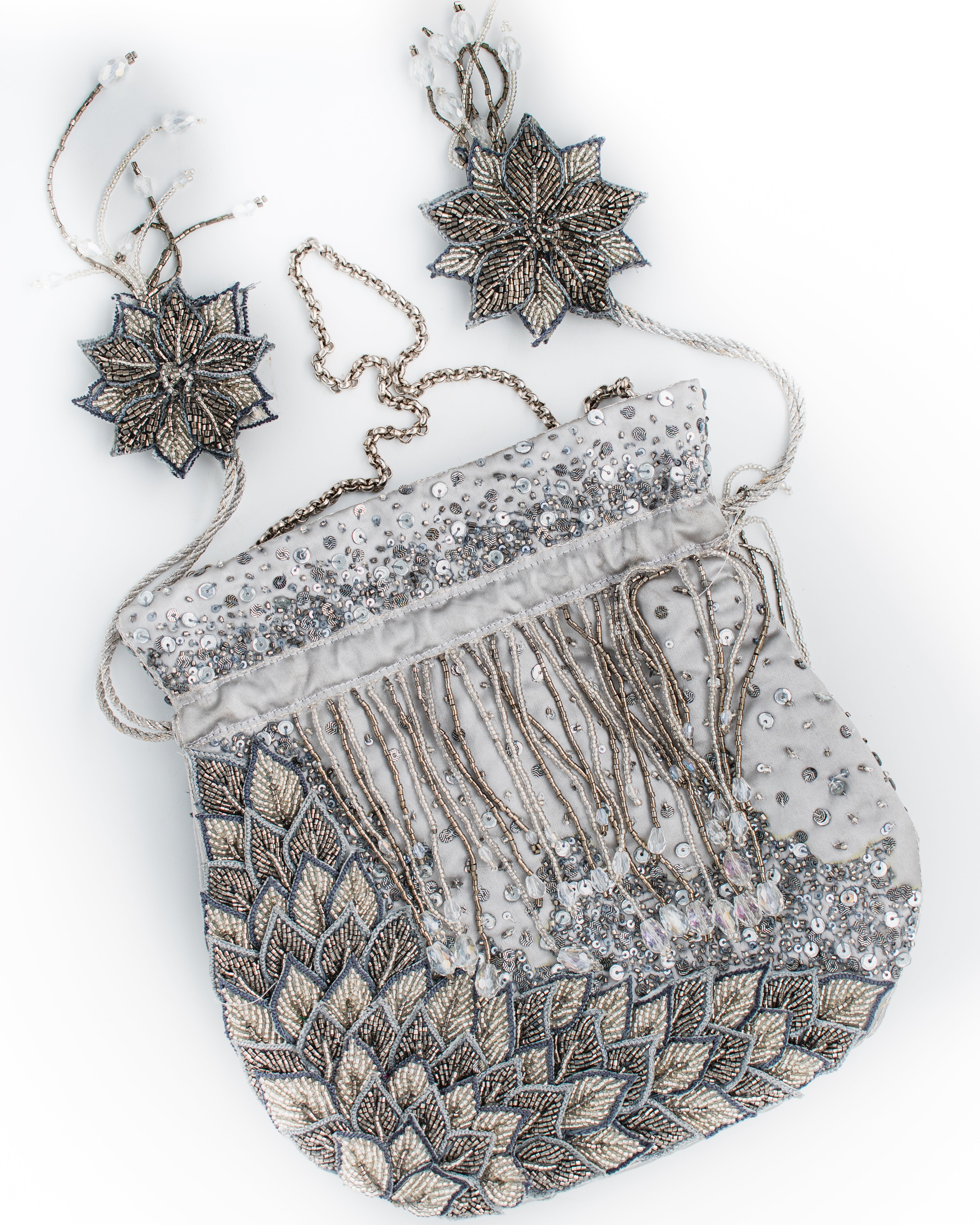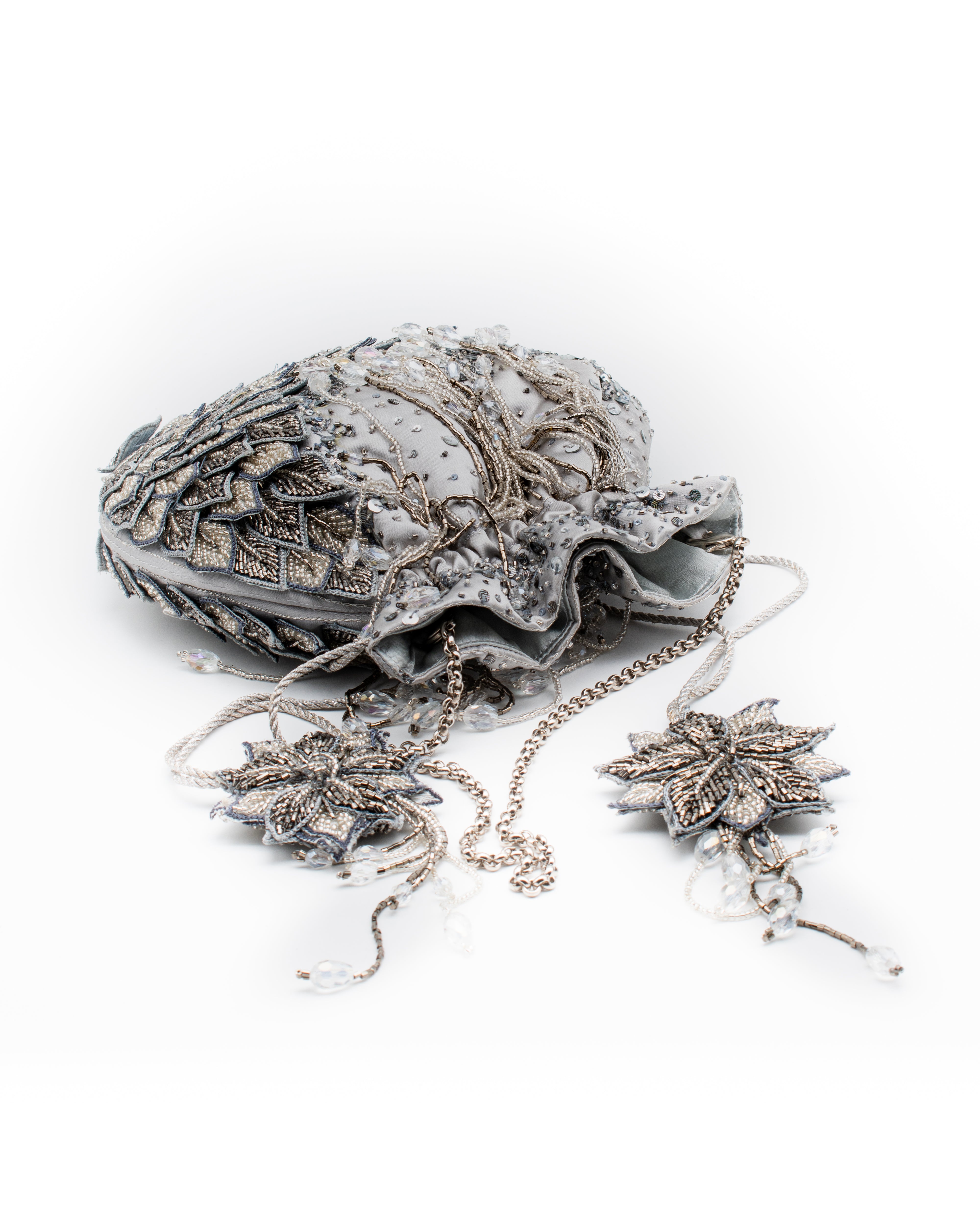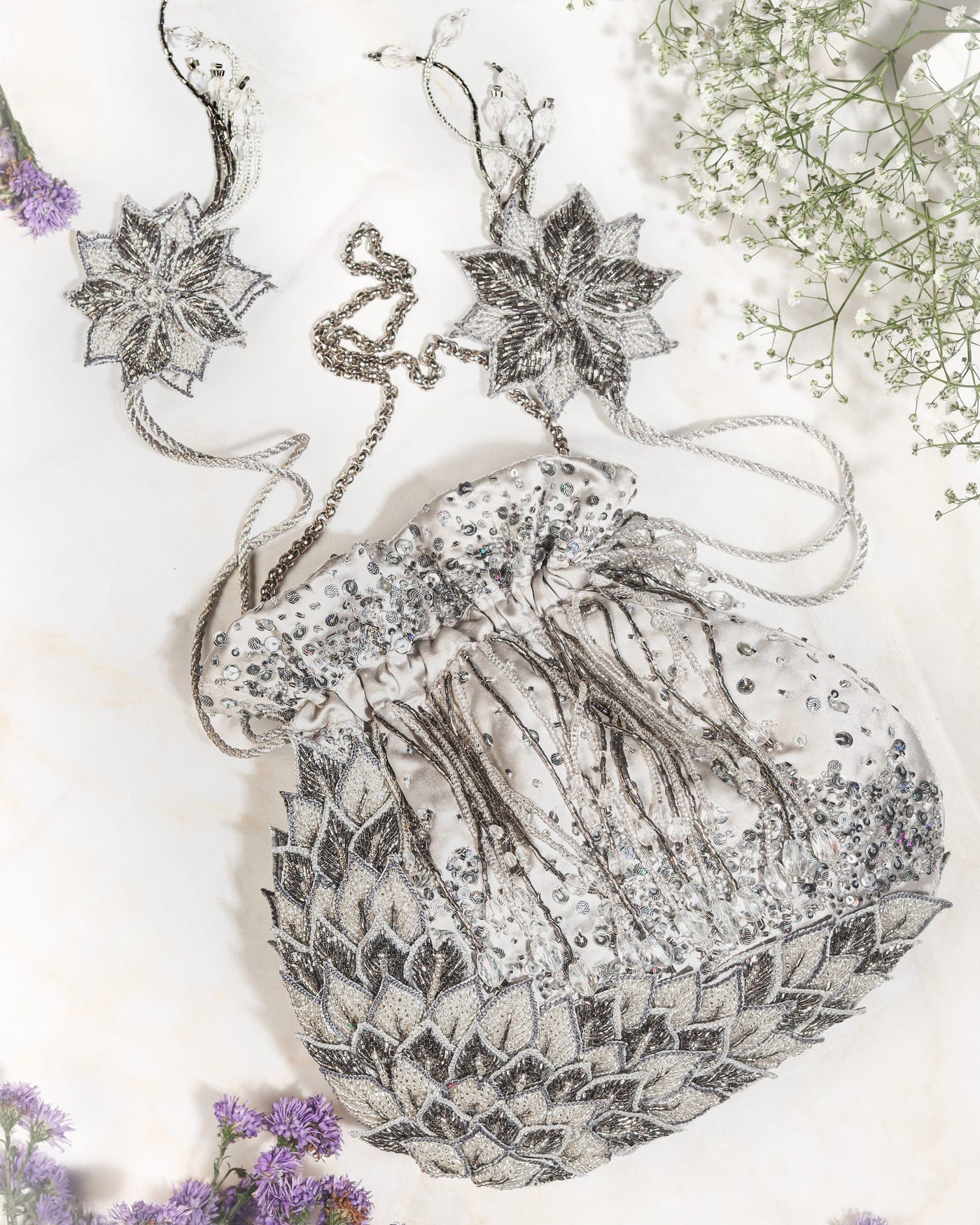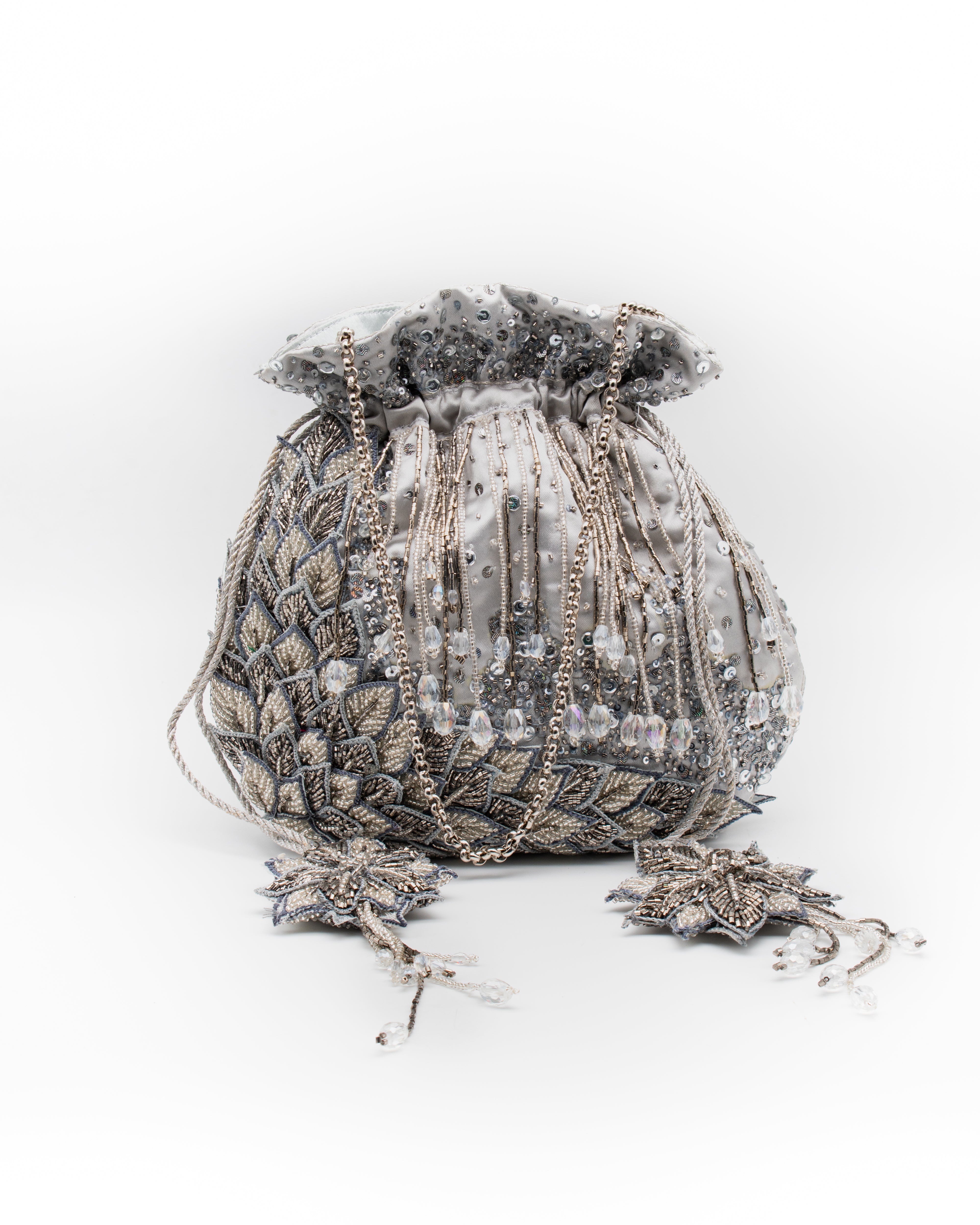 This exquisite silver potli features intricate applique green leaf work at the corners, adding a unique contrast and elegance. Embellished with shimmering sequins and kathdana bead embroidery, it radiates festive charm. The delicate tassels, adorned with beads and crystals, create a mesmerizing shimmer as you walk or dance. A perfect statement piece for weddings, celebrations, and grand occasions!