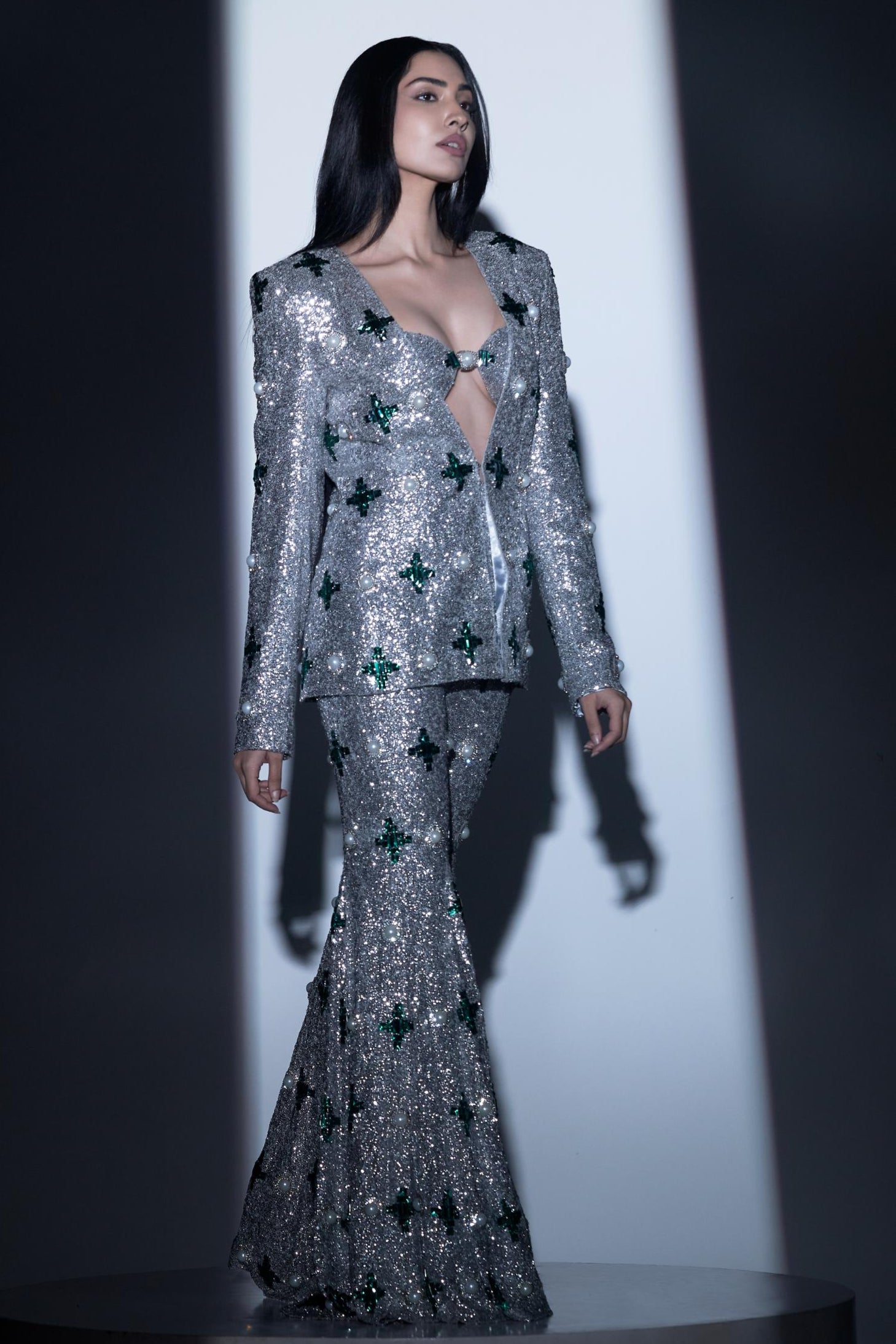 Radiant and effortlessly glamorous, the Silver Bralet with Jacket and Sharara redefines festive sophistication. The shimmering bralet adds a bold, contemporary edge, while the flowy sharara brings graceful movement to every step. Finished with a statement jacket for added drama and polish, this ensemble is perfect for sangeets, receptions, or evening soirées. Crafted for the modern woman who embraces sparkle and silhouette, this look is equal parts elegance and impact.