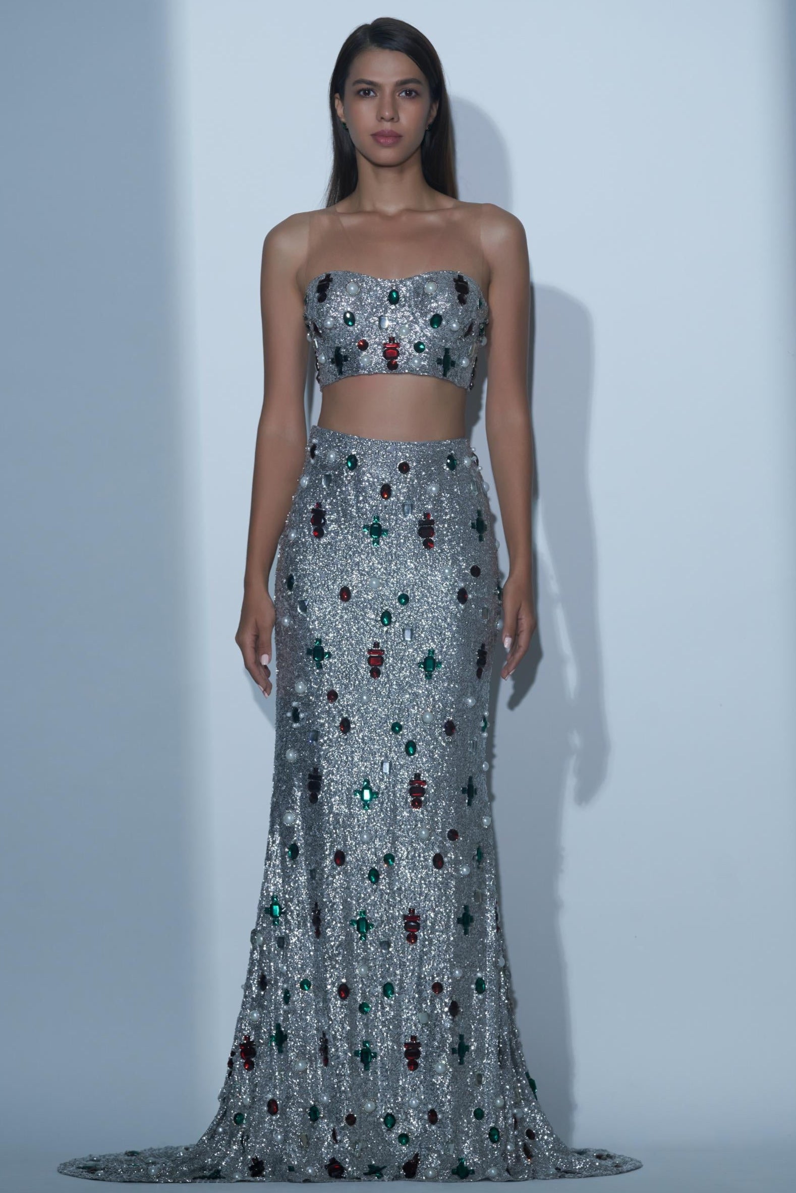 Sculpted glamour meets contemporary elegance in this Silver Bustier with High-Waisted Skirt Set. The structured bustier enhances the neckline and contours the silhouette, while the high-waisted skirt offers a sleek, elongated look that moves with effortless grace. Crafted in a luminous silver tone, this co-ord set is perfect for cocktail parties, festive evenings, or reception celebrations. Designed for the modern muse who embraces shine and sophistication, this ensemble is a showstopper in every sense.