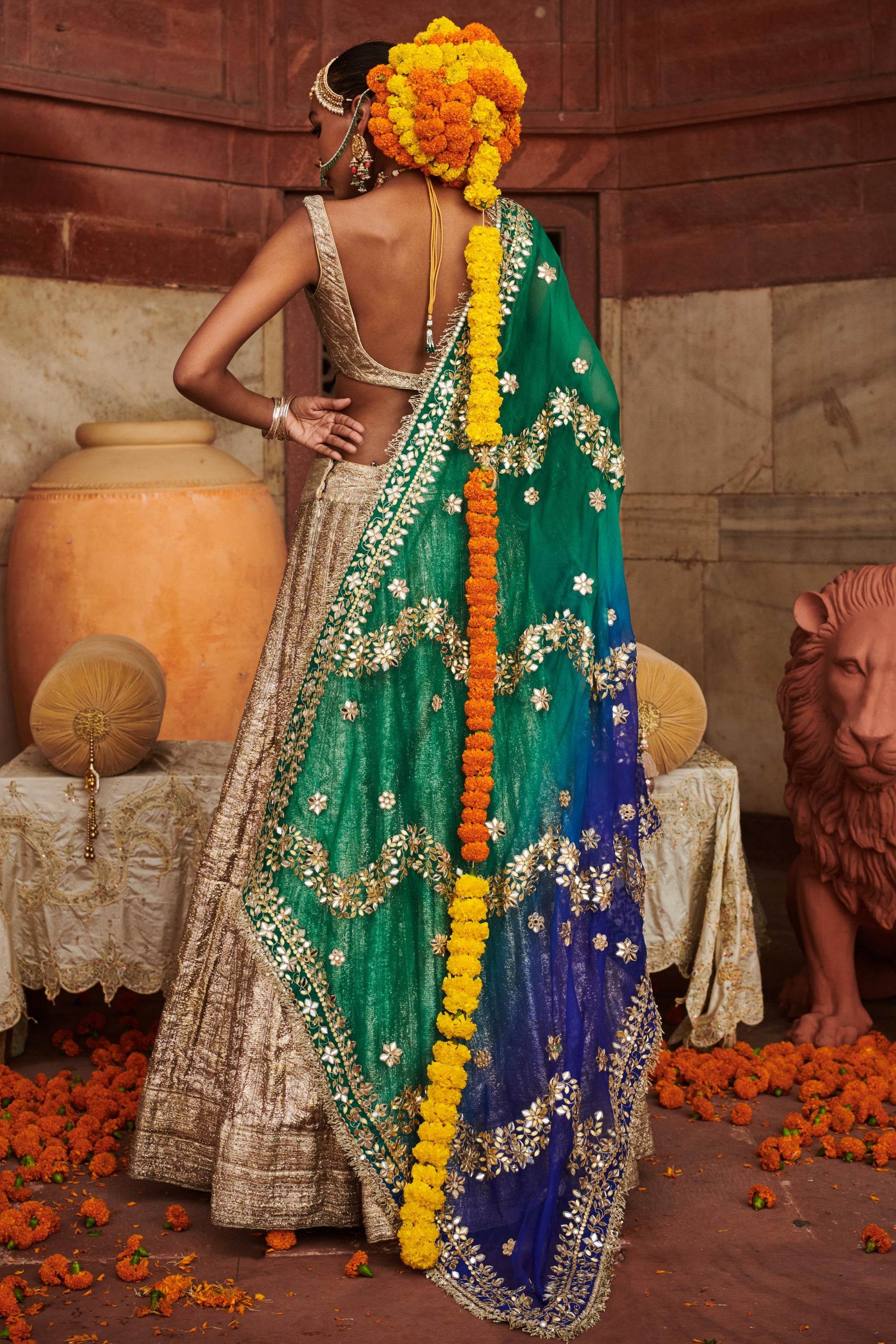 This silver lampi lehenga is paired with a delicate lampi work blouse, exuding elegance and sophistication. Complemented by a green-blue dupatta adorned with intricate gota patti work, this ensemble is a perfect blend of timeless craftsmanship and modern charm, ideal for weddings and festive occasions.