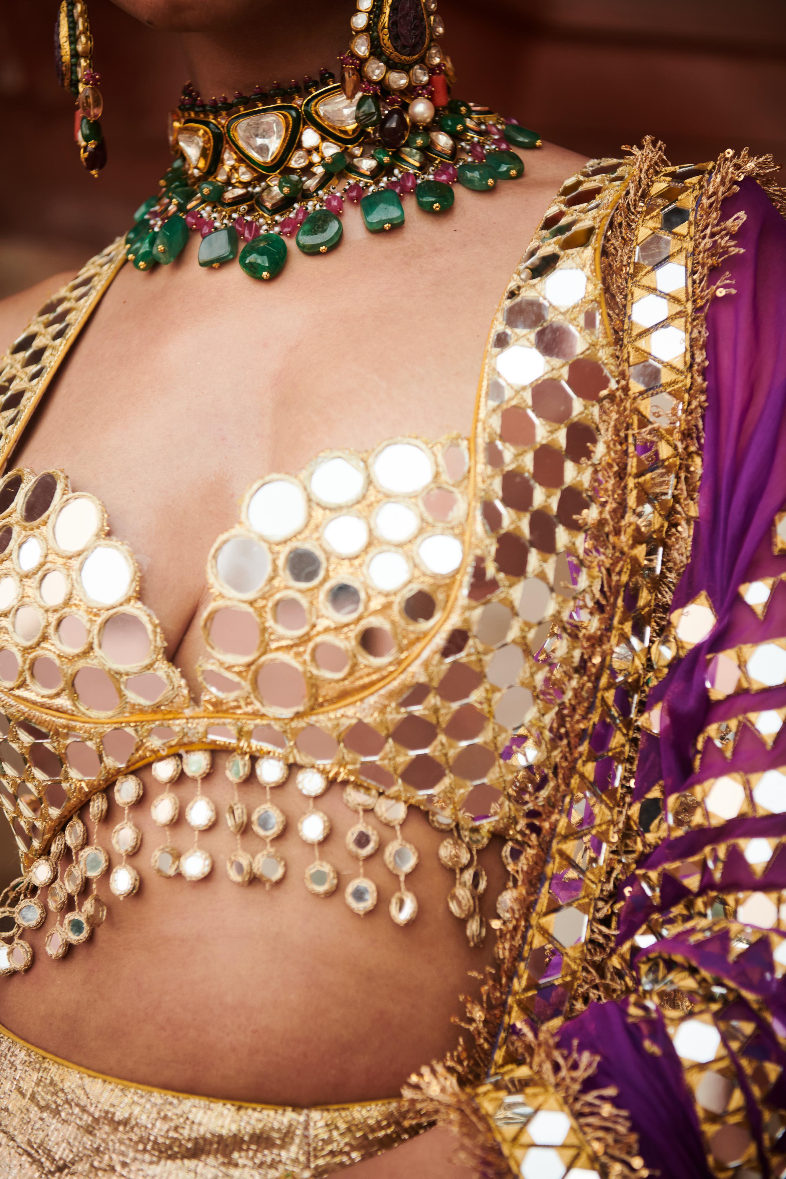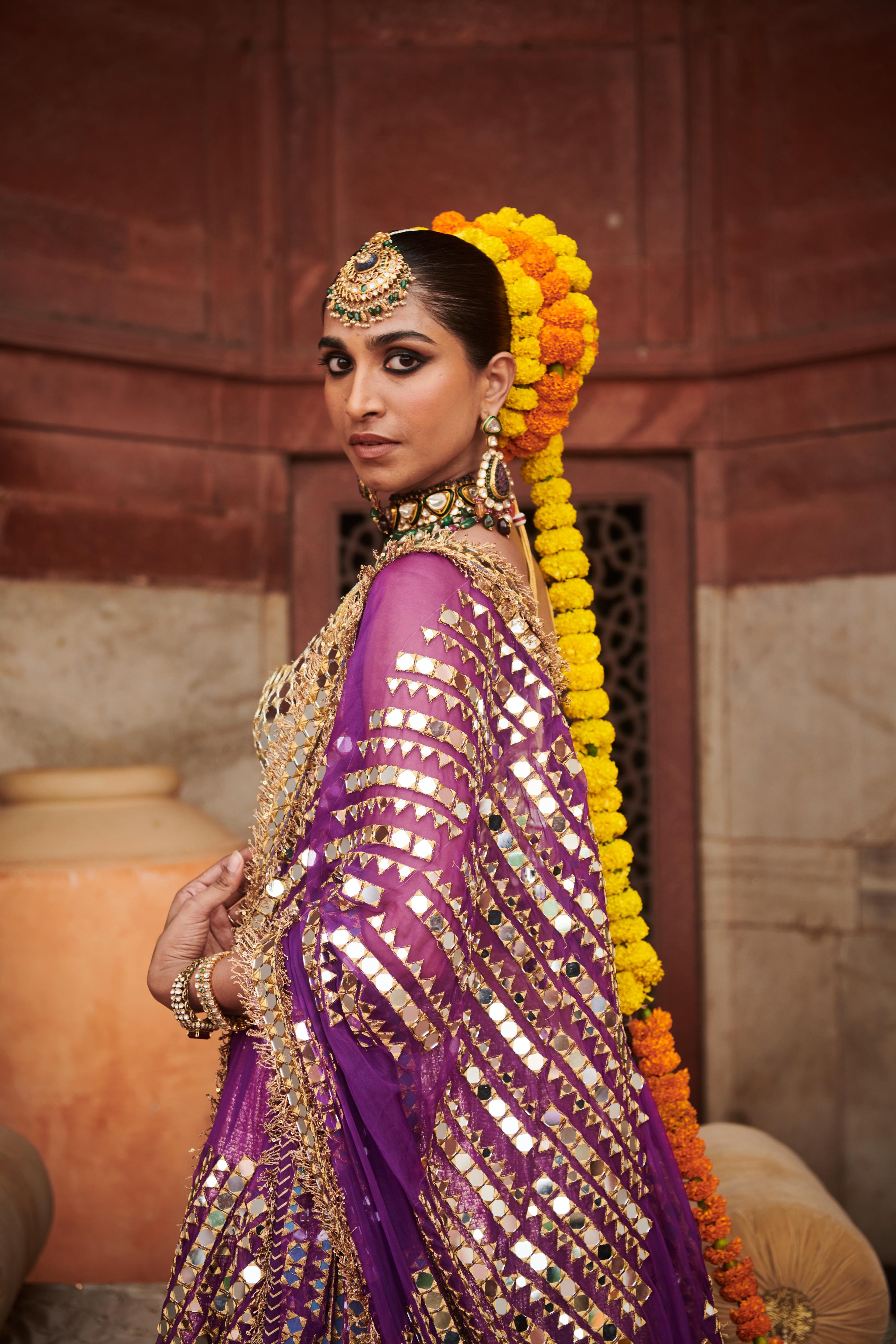 The skirt showcases a striking design with contrasting silver and gold halves creating a bold and unique statement. Paired with a mirror work blouse on gota lined with luxurious chanderi silk it is elevated by a vibrant purple organza dupatta adding a pop of color and charm to the ensemble. Perfect for weddings and festive celebrations.