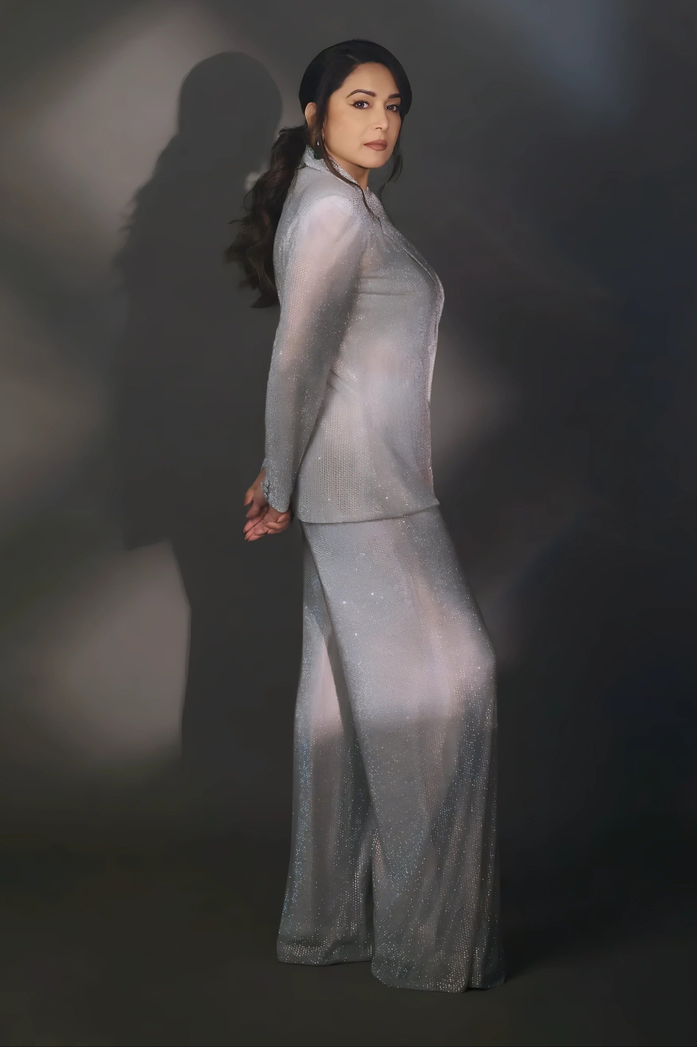 Shine bright in the Boxy Crystal Studded Jacket Set featuring a silver single-button jacket adorned with dazzling crystals paired with wide-legged pants for a modern chic silhouette. This ensemble combines edgy glamour with sophisticated tailoring perfect for cocktail parties fashion events or upscale gatherings. Effortlessly bold and stylish it's designed to make a confident statement wherever you go.