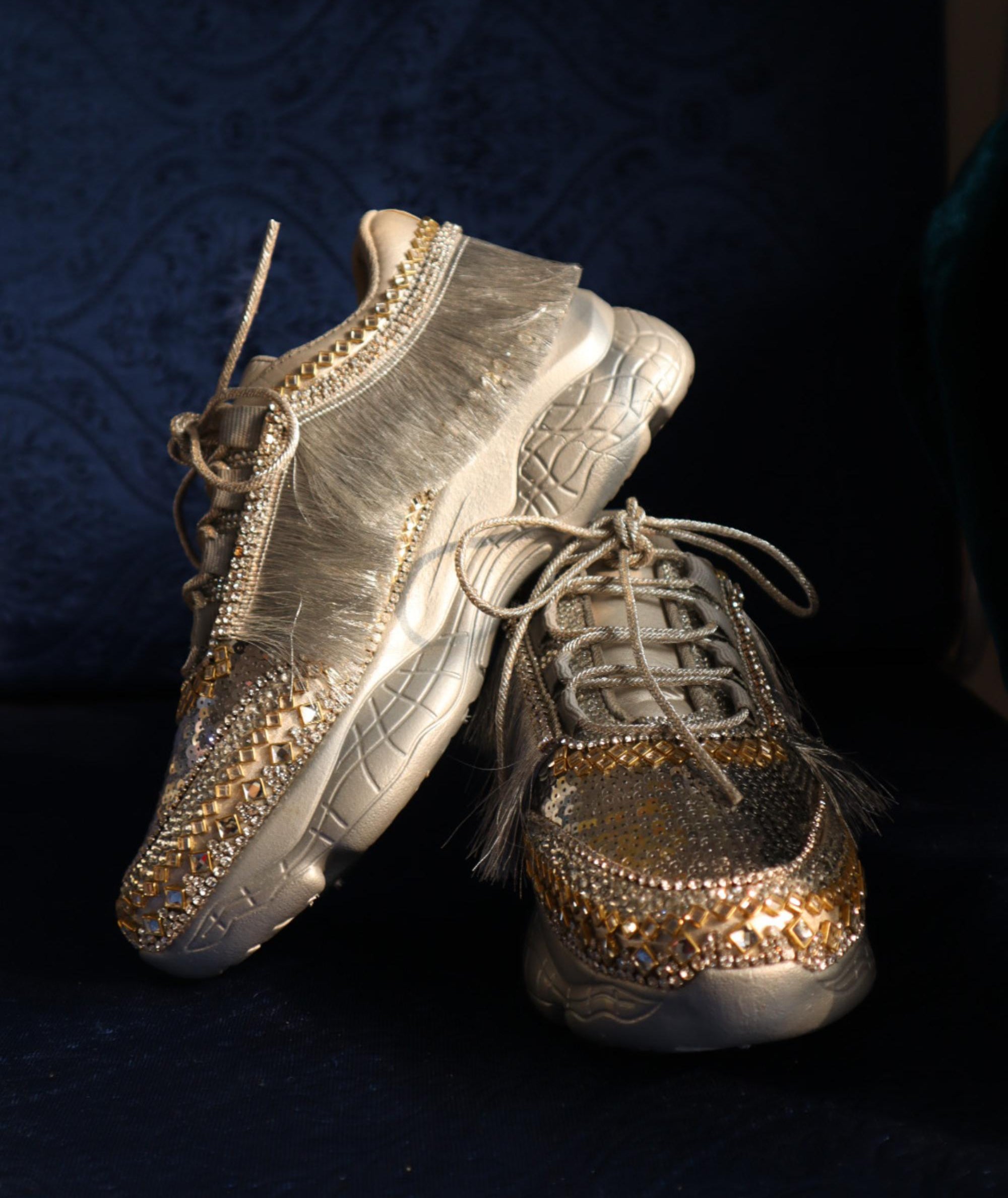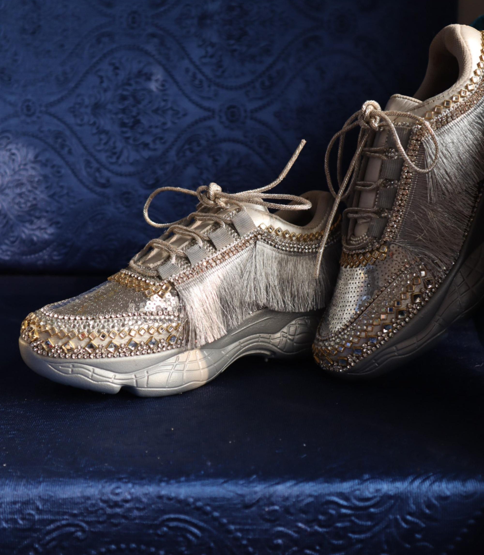 Shine with every step in these silver blingy sneakers, designed for the modern bride and fashion-forward divas. Adorned with shimmering sequins, intricate mirrorwork, and luxe fringe details, they offer the perfect blend of glamour and comfort. With plush memory foam insoles, they're ideal for sangeet dances, cocktail parties, and receptionsÑmade for twirling, dancing, and stealing the spotlight!