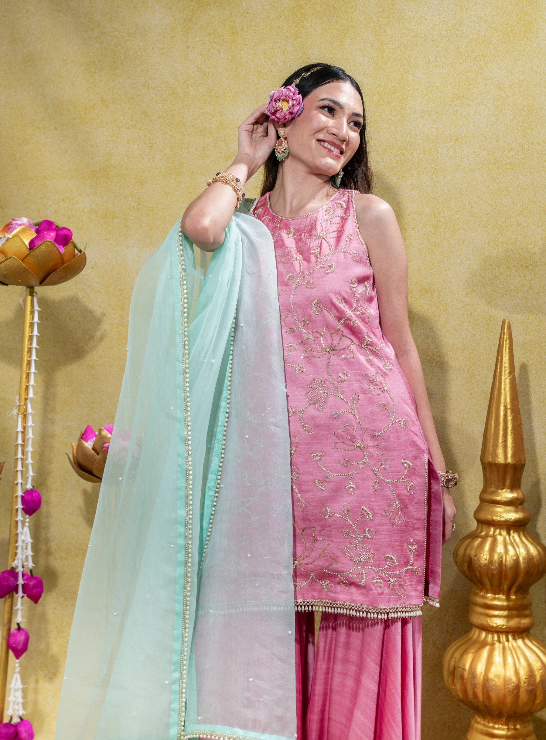 Embrace timeless elegance with our enchanting soft pink kurti, paired with graceful gharara pants and an aqua embroidered silk organza dupatta. The kurti, crafted from delicate fabric and adorned with intricate embroidery, radiates a subtle charm that perfectly complements the flowing silhouette of the gharara pants. The ensemble is beautifully finished with a luxurious aqua silk organza dupatta, featuring detailed embroidery that adds a vibrant touch and an ethereal quality. Ideal for any festive or formal occasion, this outfit seamlessly blends classic beauty with contemporary sophistication, offering a look that is both refined and captivating.