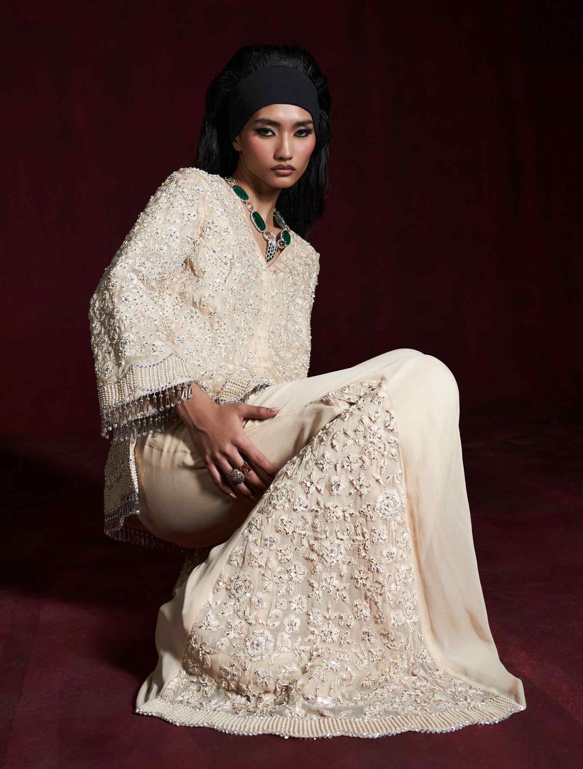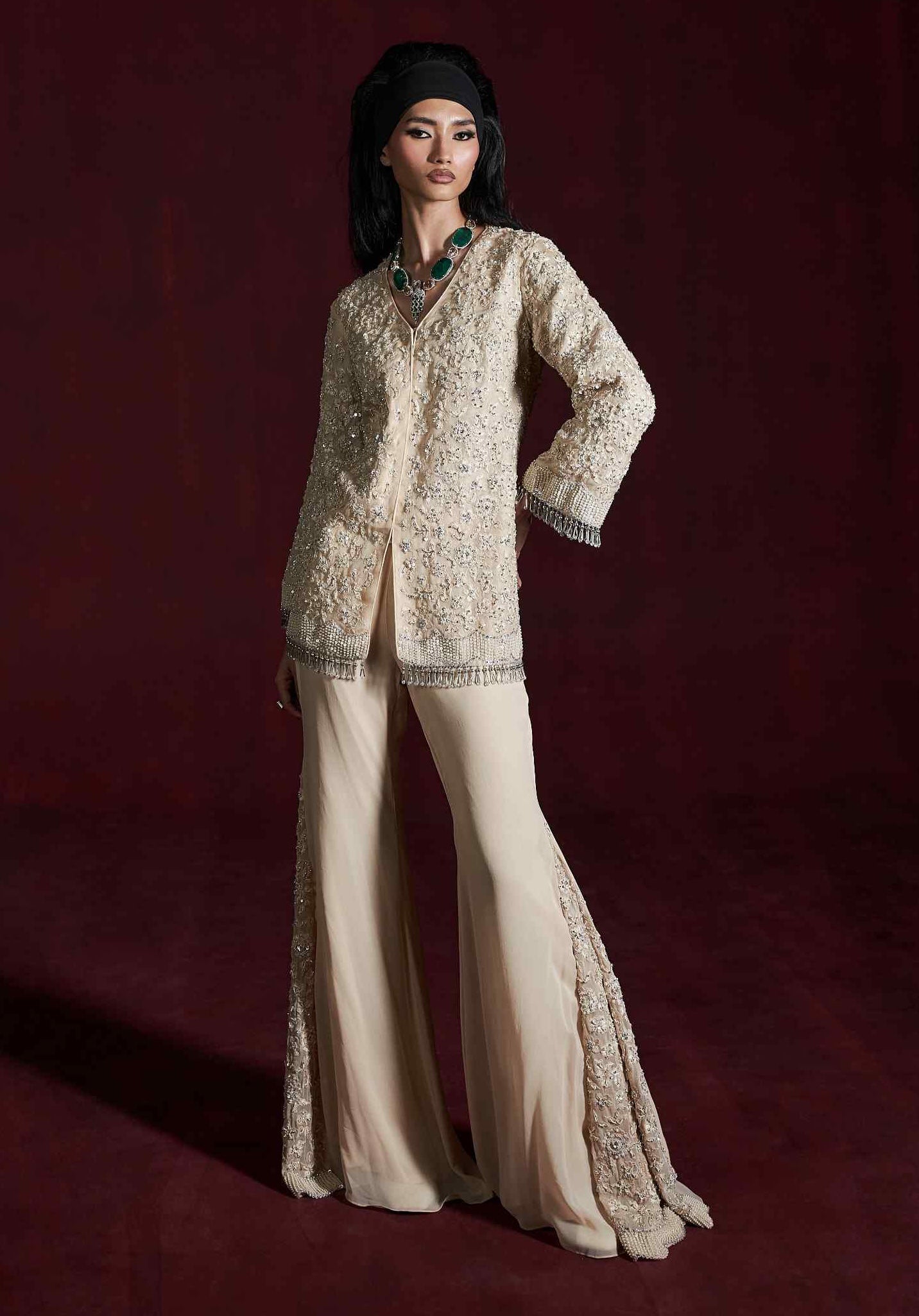 The jacket is paired with kali bellbottoms, designed to flow gracefully and enhance your silhouette. The bellbottoms echo the jacket's intricate detailing, ensuring a cohesive and polished look. This ensemble combines traditional craftsmanship with contemporary flair, making it a perfect choice for special occasions where you wish to make a memorable impression.