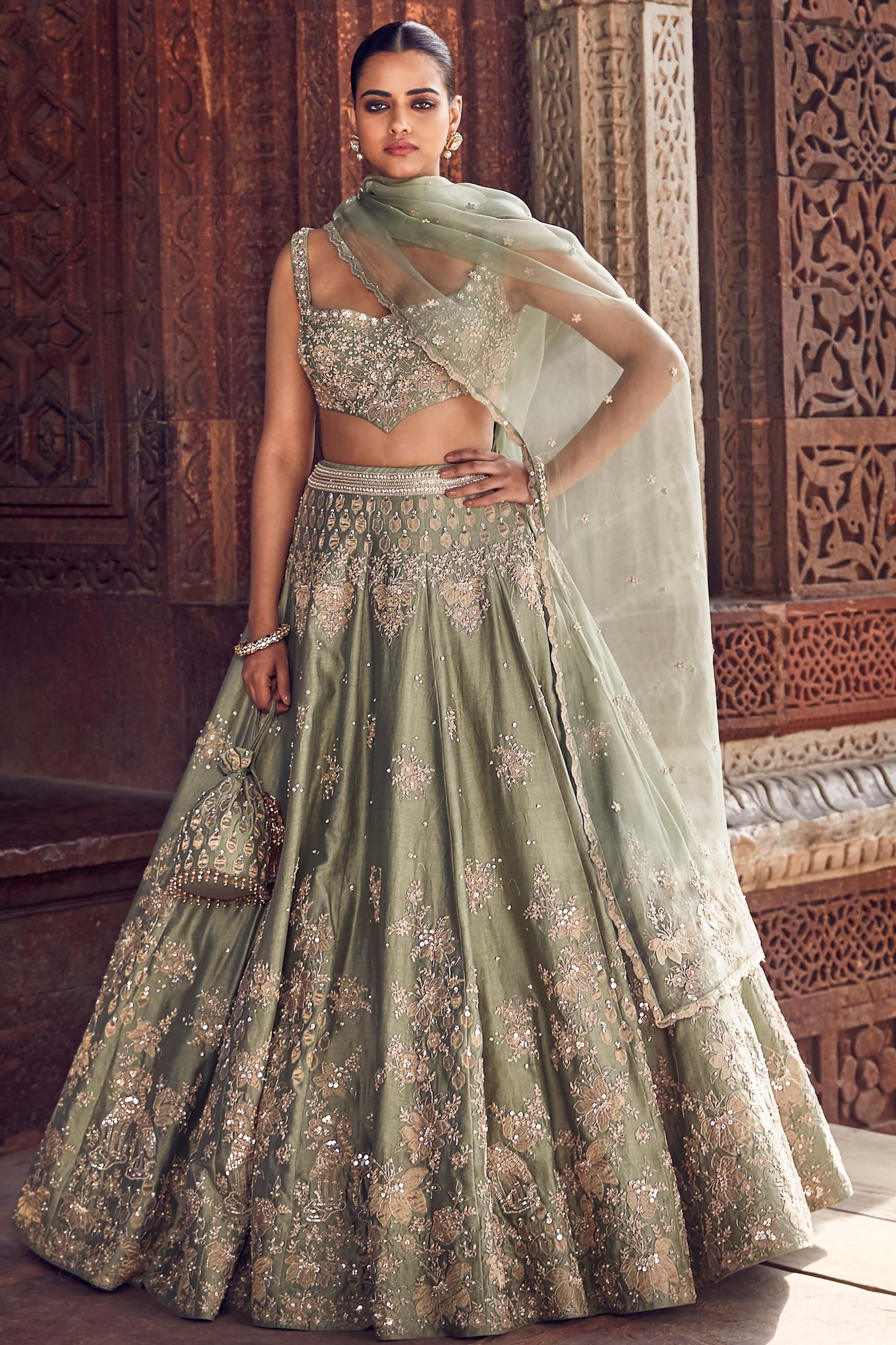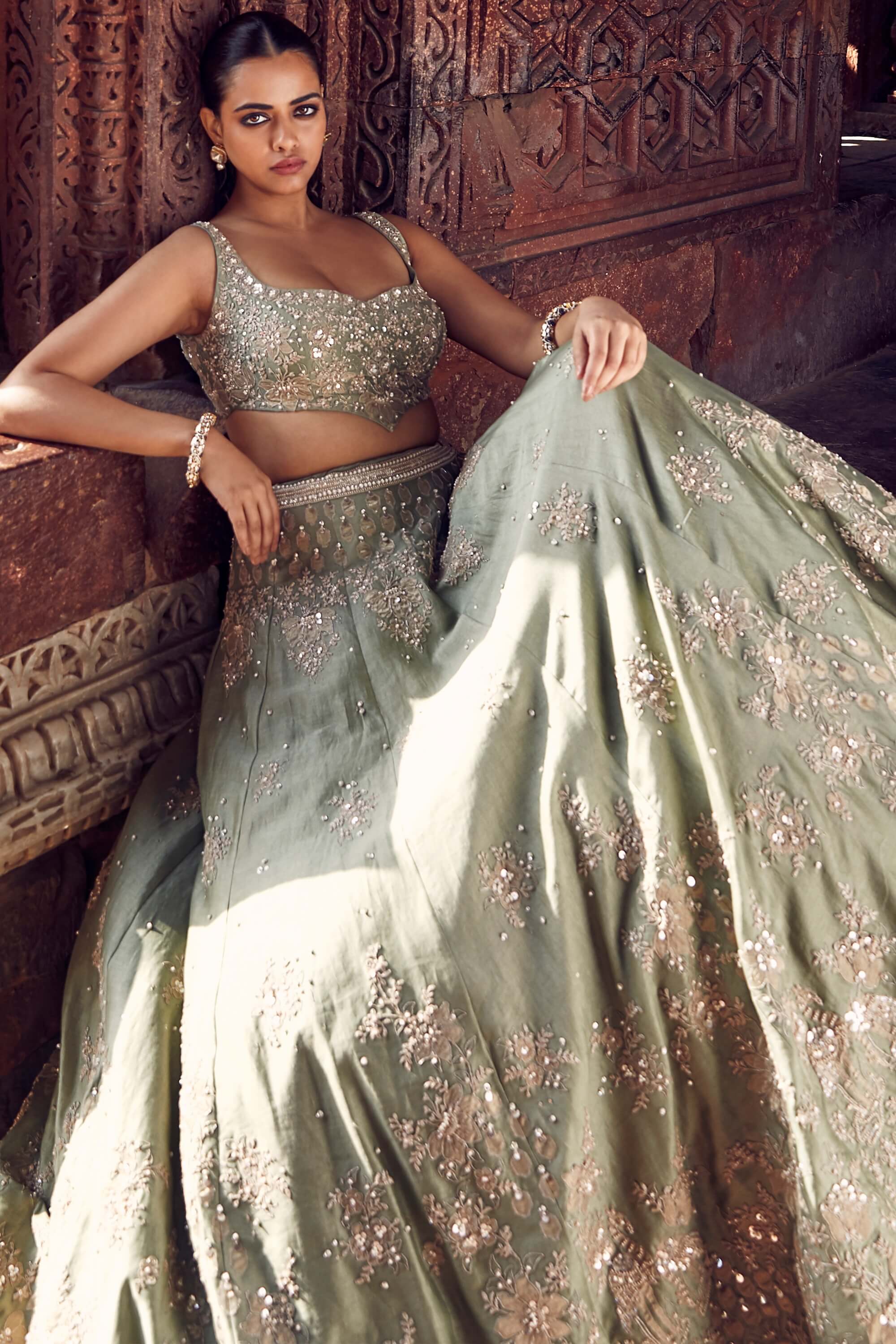 The Sona Patti Jade Bow Lehenga in a neoteric shade of pista green reflects an unconventional yet distinctive choice. Made from a decadent chanderi fabric, the lehenga is designed to incorporate our classic V-wing choli paired with a voluminous applique-lined skirt. The jade bow design and intricate floral and paisley applique work elevate the luxurious fabric, creating a set that can be passed down the generations.