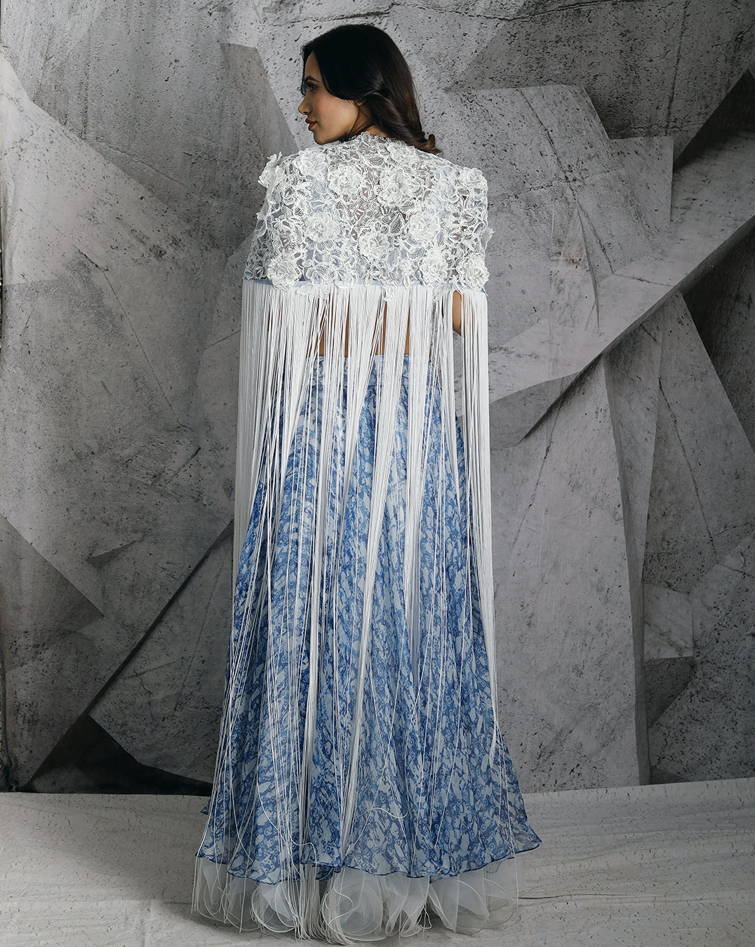 Immerse yourself in the allure of this statement fringe blue lehenga, where cool hues of blue harmonize with delicate lace for a look of refined elegance. This exquisite ensemble features a hand block-printed organza lehenga, adding a touch of artisanal charm. The textured lycra blouse offers a modern contrast, while the net and fringe jacket introduces a playful and sophisticated twist. Together, these elements create a stunning statement piece perfect for any special occasion.
