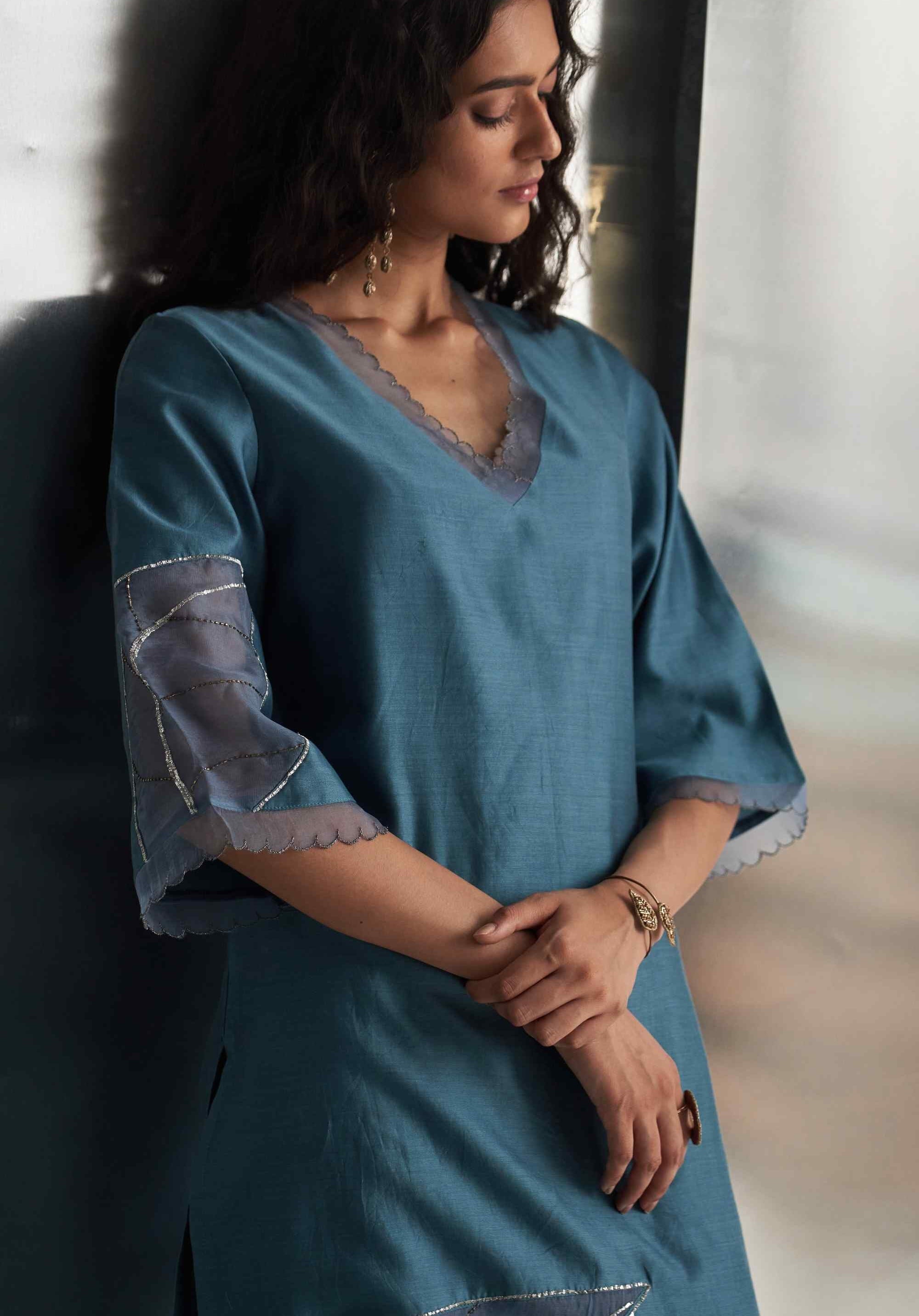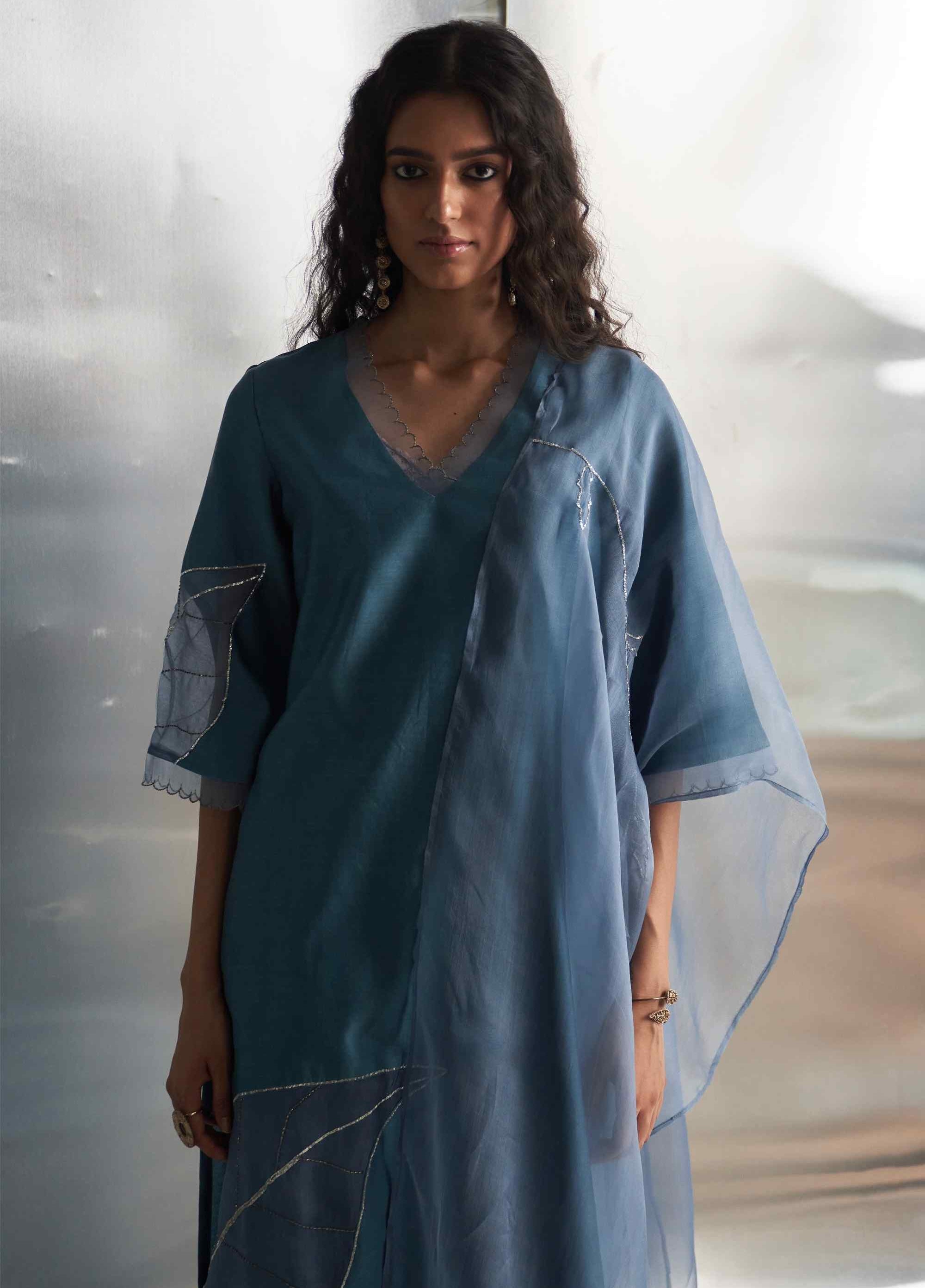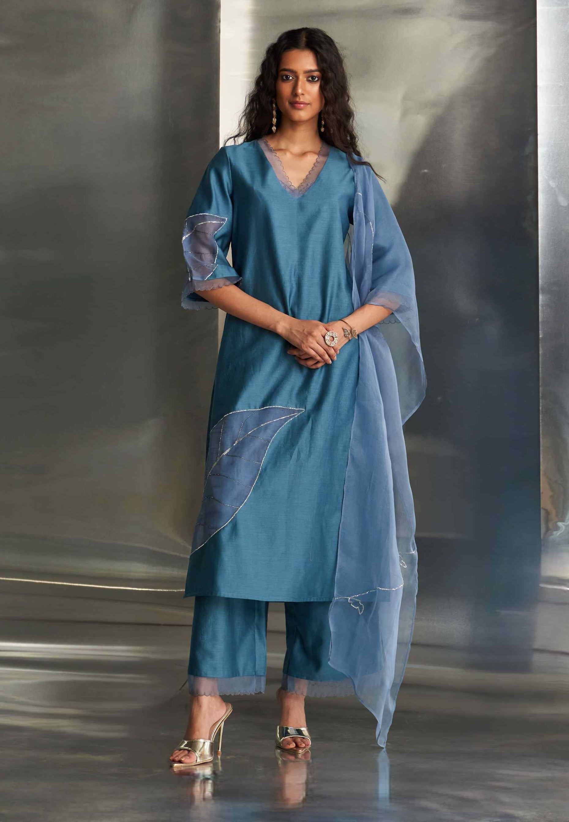 This stunning blue steel kurta set features a straight silhouette with side slits and a scalloped neckline. The intricate nakshi and zari hand embroidery adds a touch of glamour, perfect for festive occasions. Paired with matching elasticated palazzo pants and a pure organza dupatta adorned with nakshi handwork, this ensemble exudes contemporary elegance.