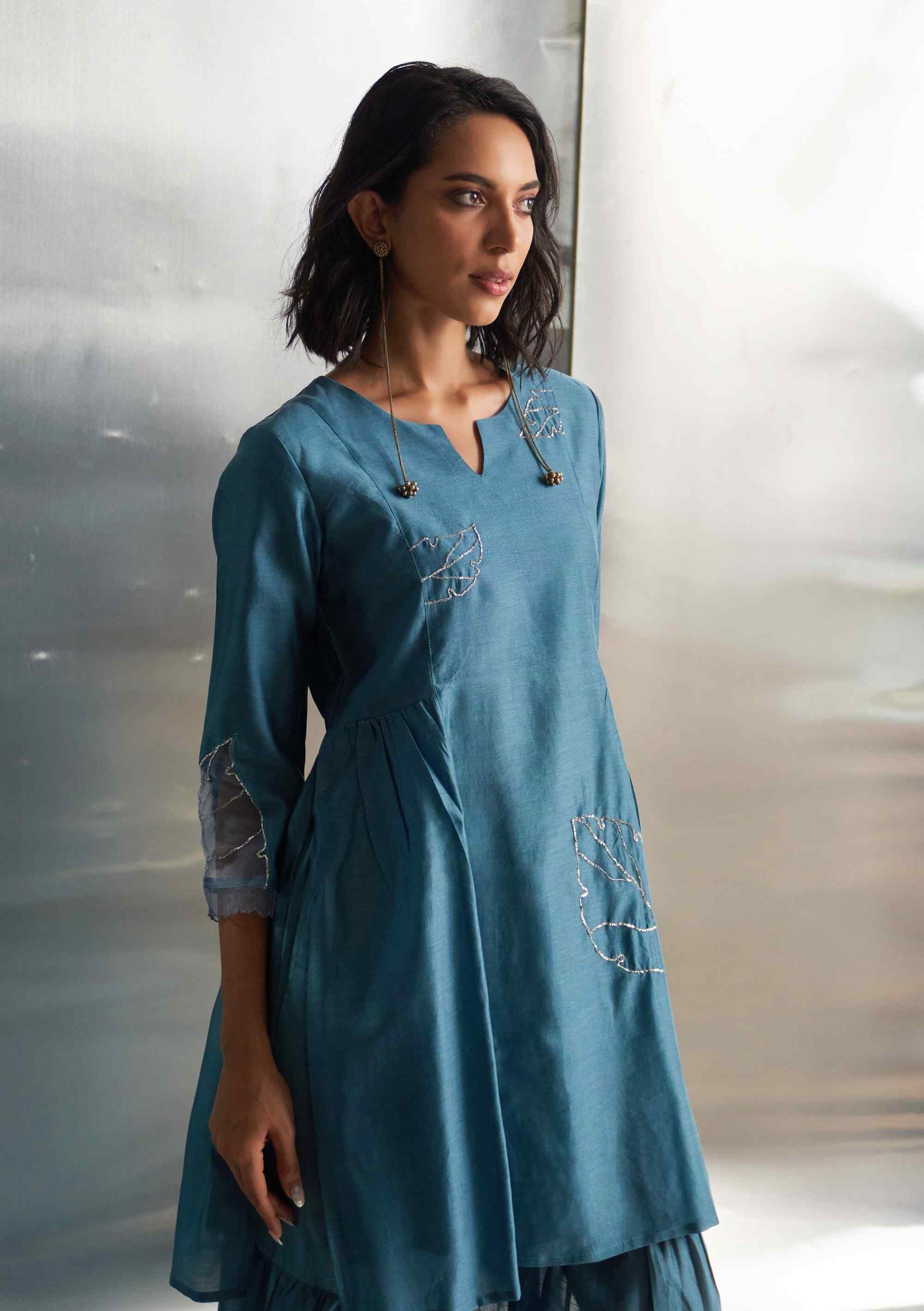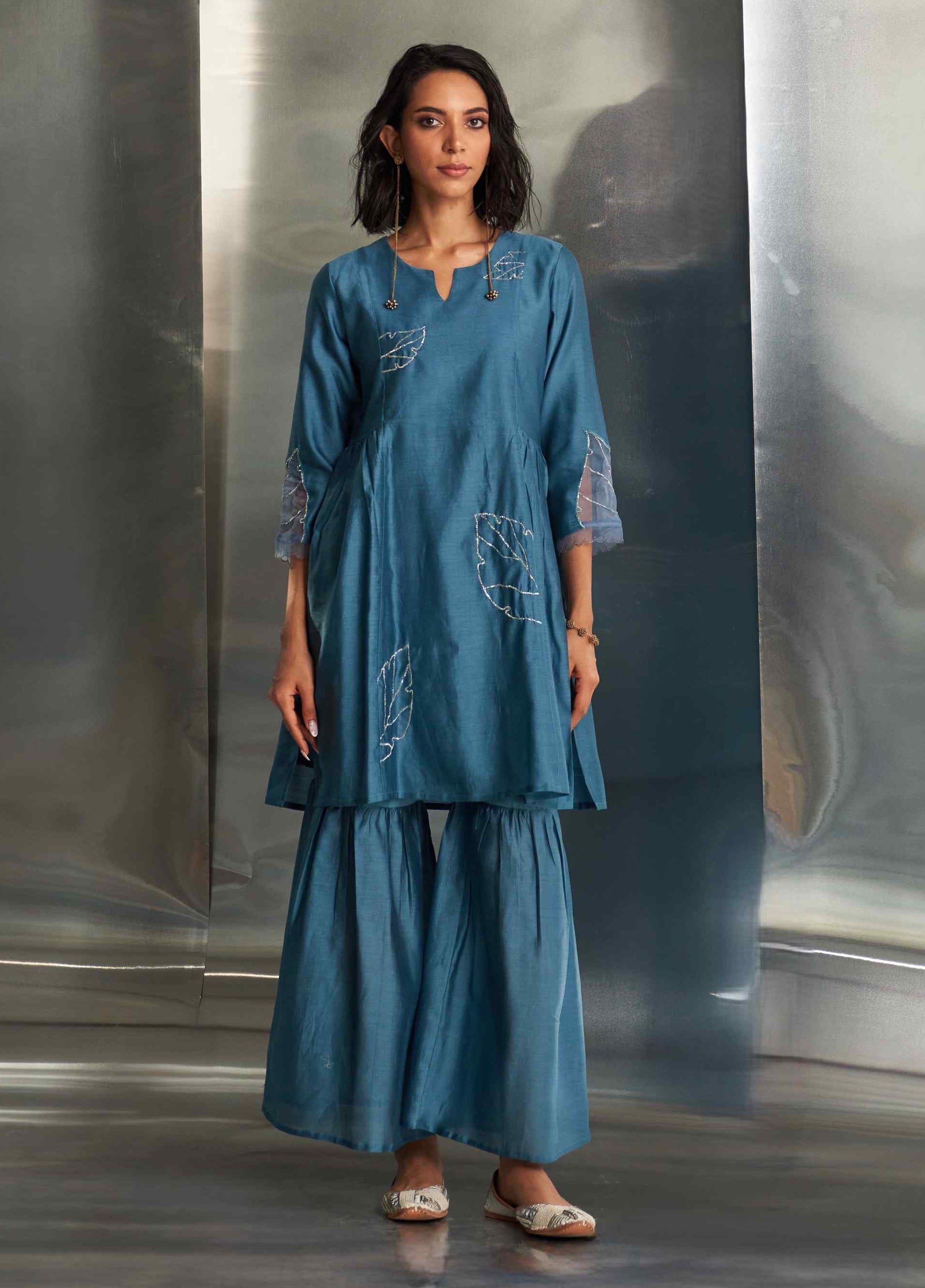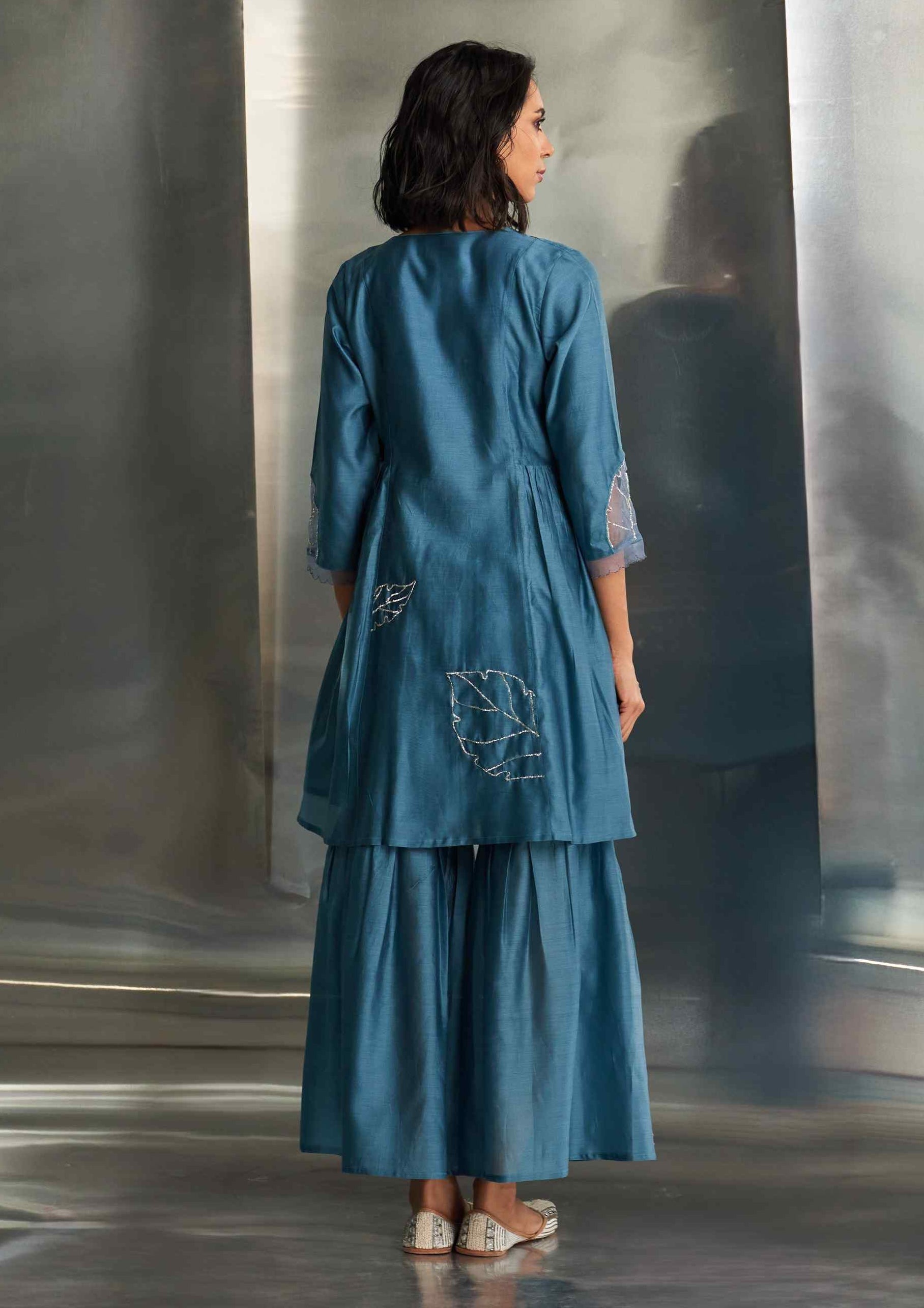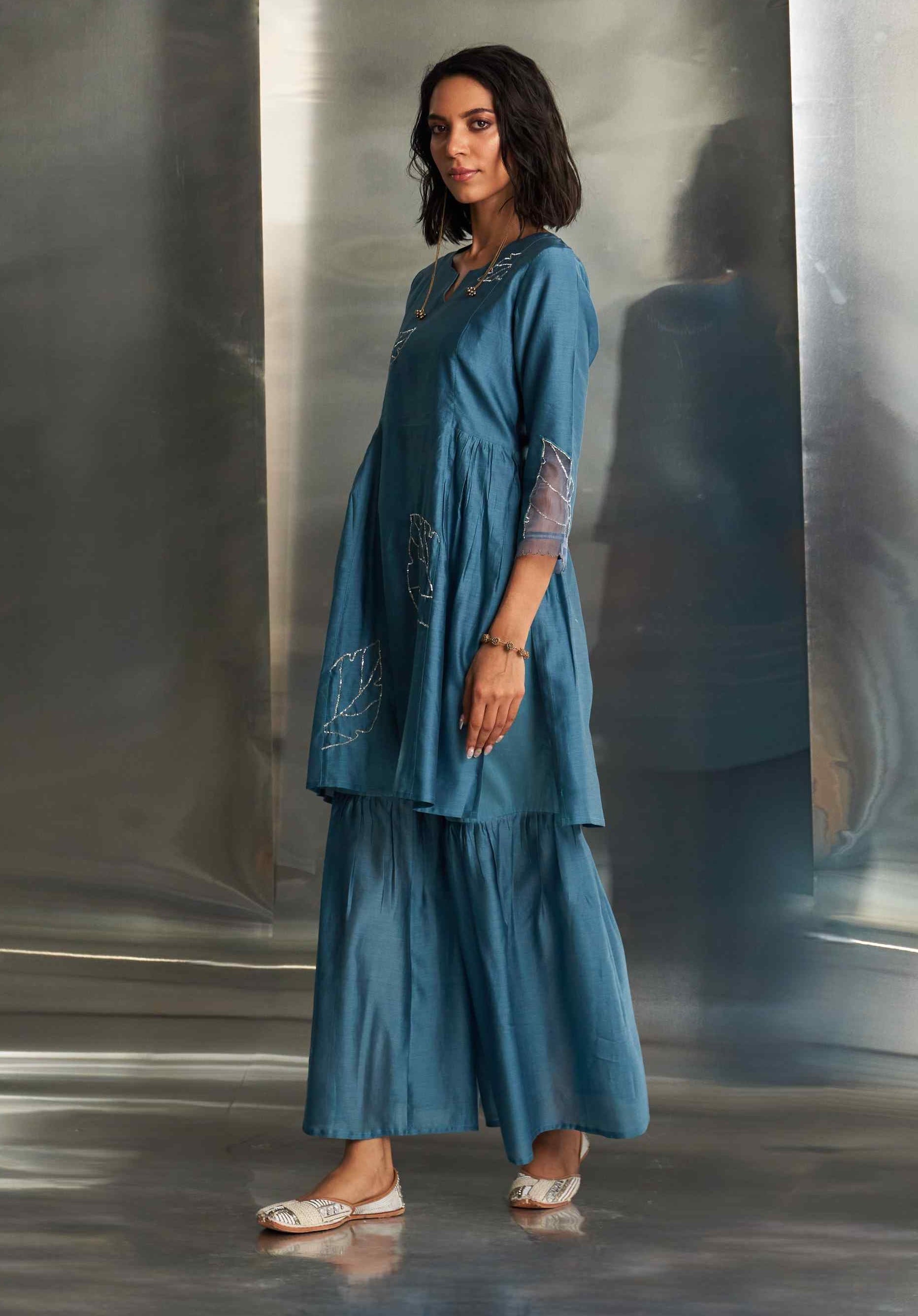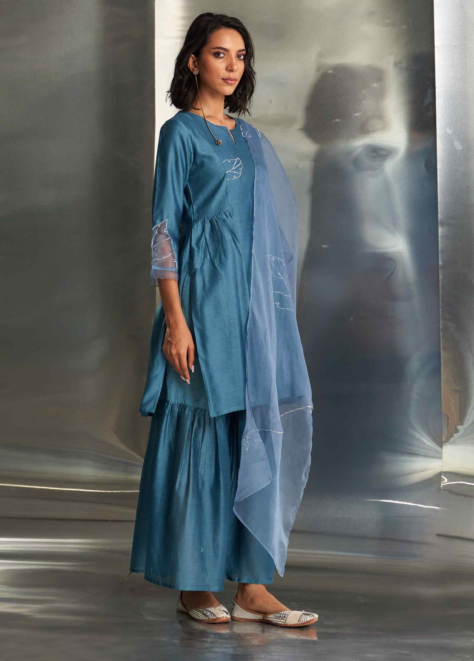 In a striking blue steel hue, this Chanderi sharara set showcases intricate nakshi embroidery, epitomizing elegance and grace. The kurta features a flowy silhouette that exudes sophistication, while the sharara perfectly complements the embroidered design. Enhanced by a lightweight organza dupatta adorned with matching nakshi handwork, this ensemble adds a refined touch of sophistication to your wardrobe.