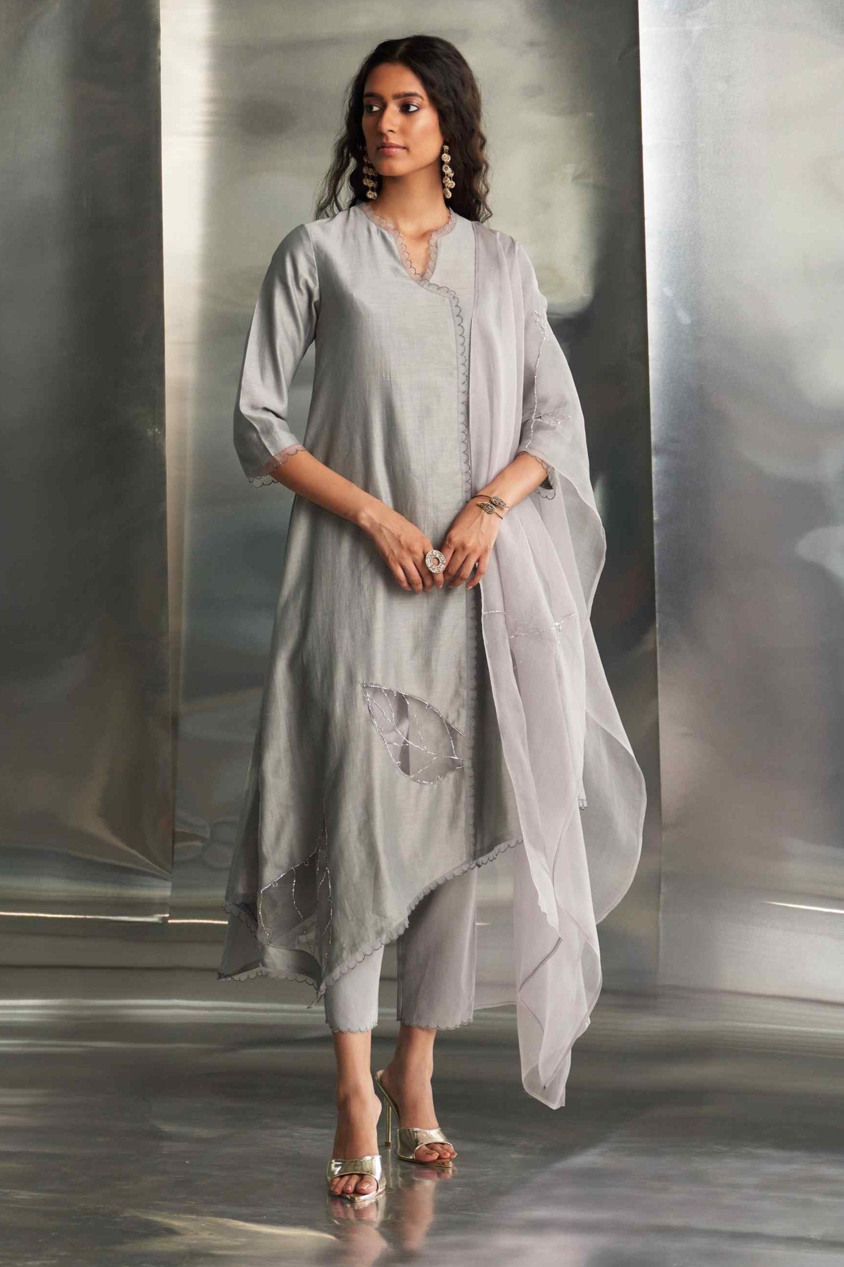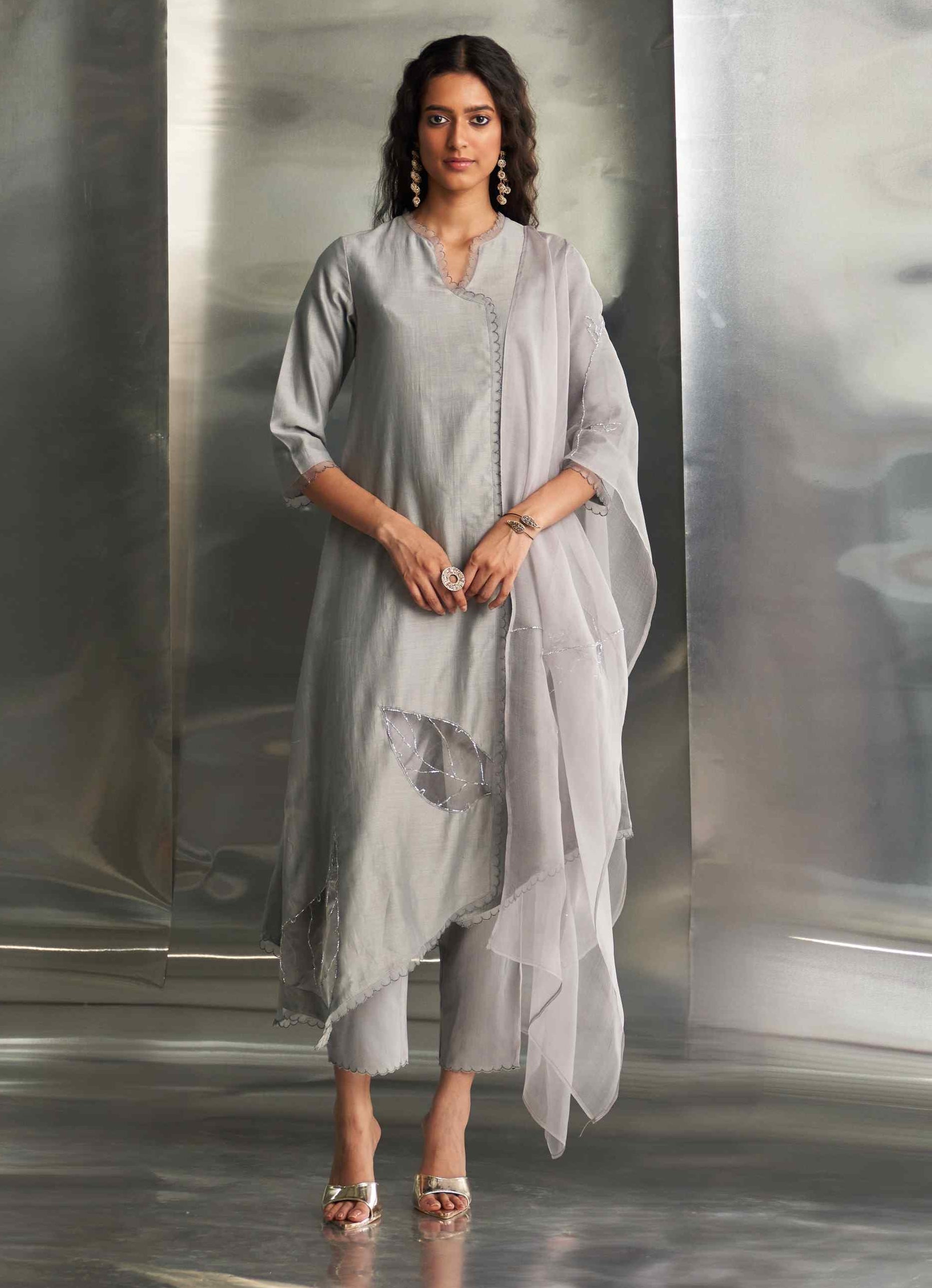 Embrace the modern elegance of steel gray with this Chanderi asymmetrical kurta set. Featuring feather-light pure organza patchwork, intricate golden nakshi hand embroidery, and a delicate scalloped border, this kurta exudes sophistication. Complete with a dreamy pure organza dupatta and scalloped-edge narrow bottoms, this ensemble offers a touch of glamour. The bottoms are elasticated with a drawstring for a perfect fit.
