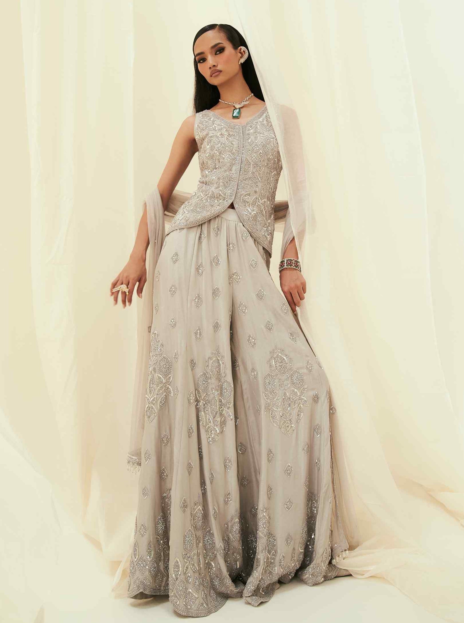 Experience timeless sophistication with our gray sharara set, which includes a sharara, top, and dupatta, all aesthetically embellished with square geometrical booties and a floral pattern. The intricate detailing combines modern geometric designs with delicate floral motifs, creating a refined and elegant look.