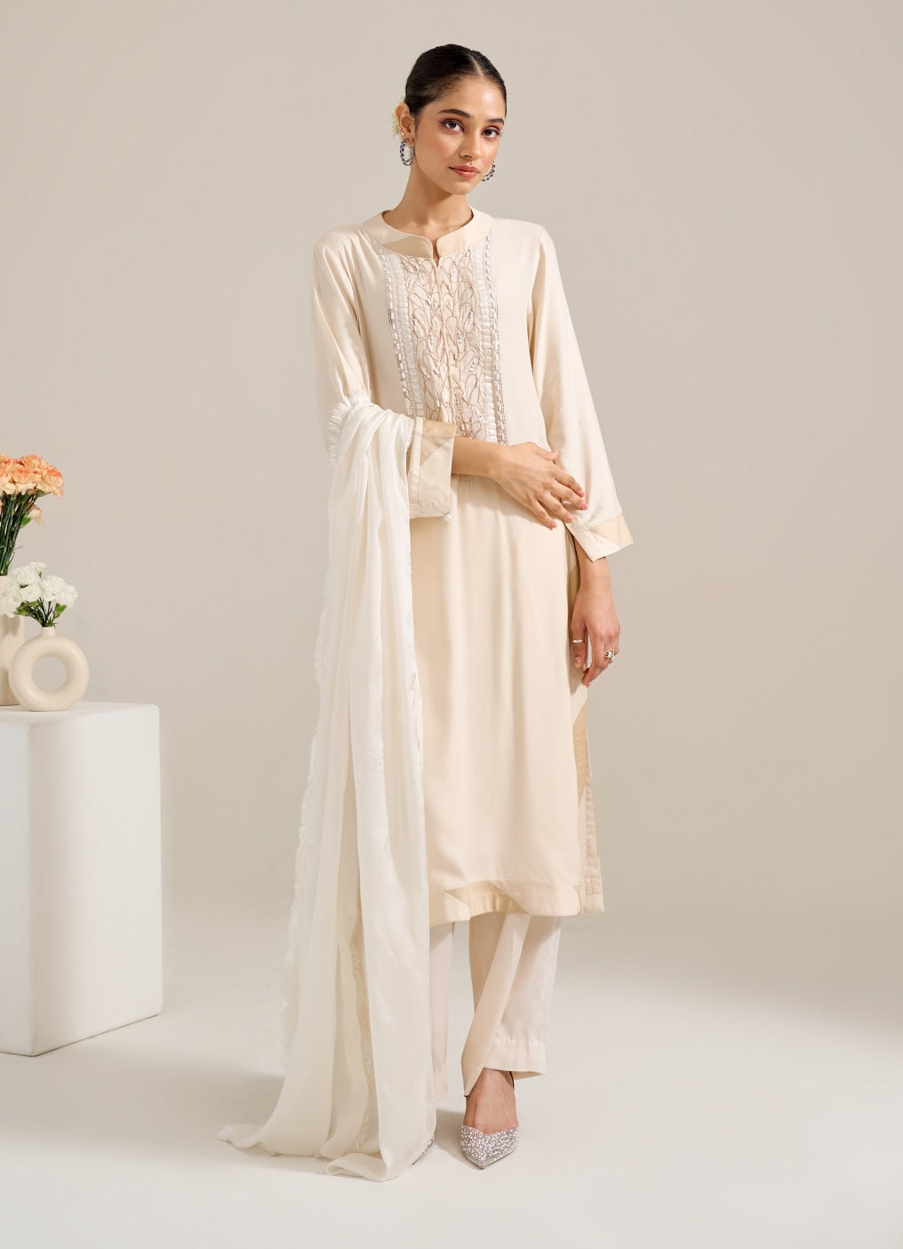 Elevate your elegance with our Long Kurta, featuring a meticulously hand-embellished neckline that adds a touch of intricate artistry to your ensemble. The kurta’s classic design is beautifully complemented by matching pants and a coordinating dupatta, creating a refined and cohesive look. Ideal for festive events and formal gatherings, this outfit combines exquisite craftsmanship with timeless sophistication, ensuring you stand out with grace and style.