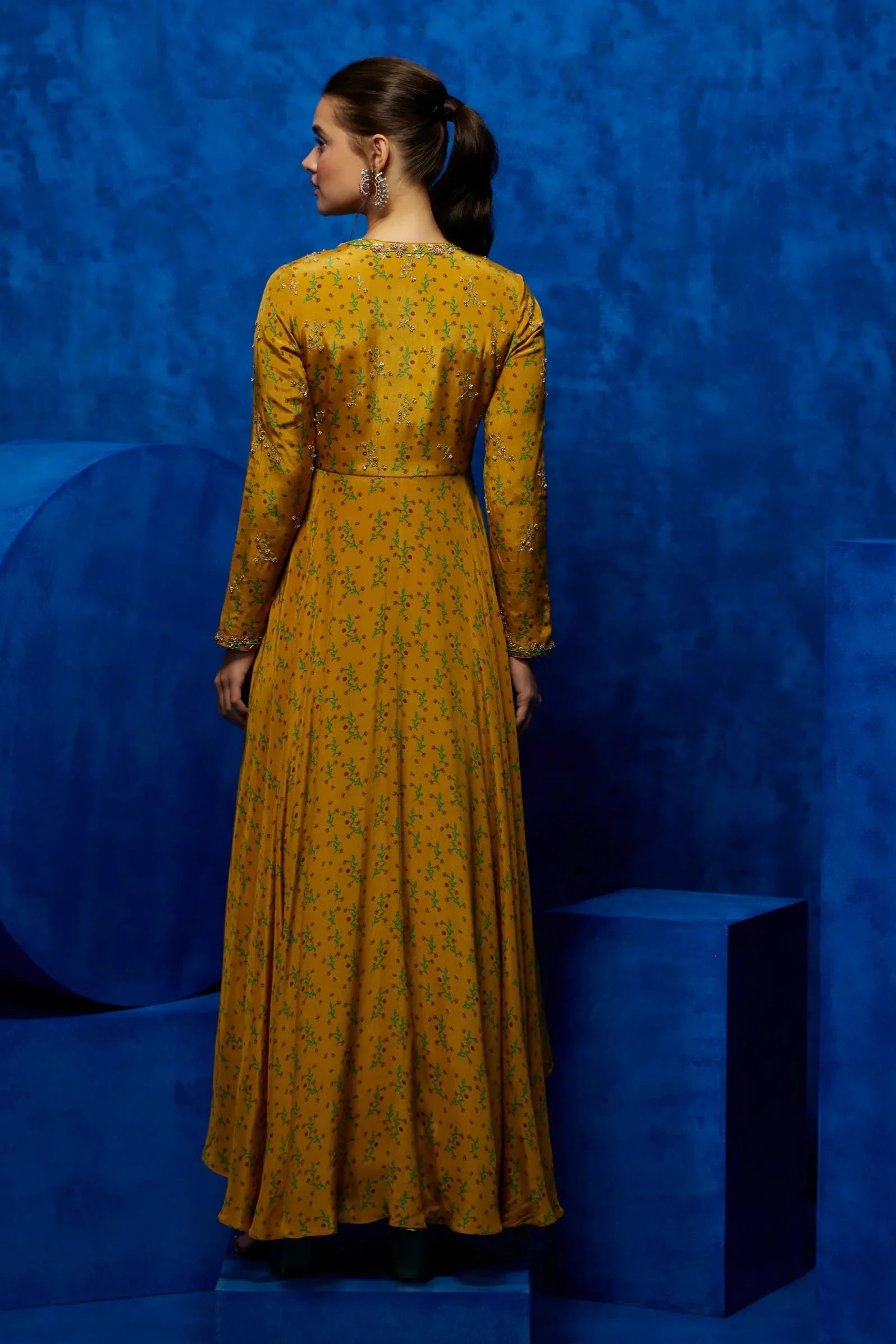 Radiate sunshine and elegance in this sunflower yellow floral printed gown. The vibrant yellow hue, paired with delicate floral prints, creates a fresh and lively look. The flowing silhouette offers a flattering fit, perfect for weddings, garden parties, or evening events. This gown blends femininity and bold style, making it an ideal choice for those looking to make a statement with timeless charm.