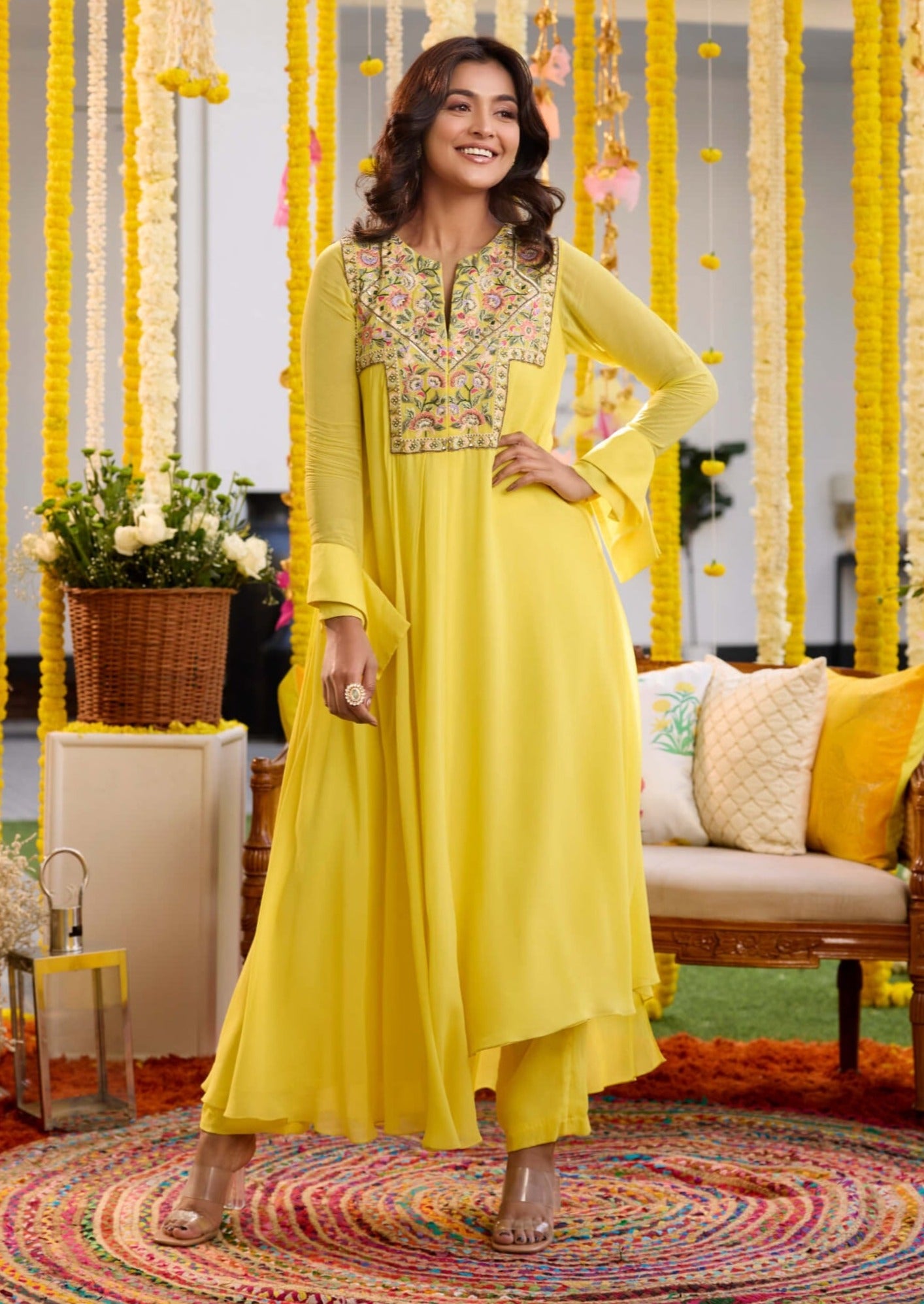 Illuminate your look with our sunshine yellow asymmetric bias-cut kurta, a striking piece that features vibrant thread embroidery on the yoke and elegant double cuff detailing at the wrists. This sophisticated kurta is paired with matching straight pants in georgette, creating a seamless and chic ensemble. Perfect for making a bold yet refined statement, this outfit combines contemporary design with intricate details to offer a fresh, stylish approach to modern elegance.