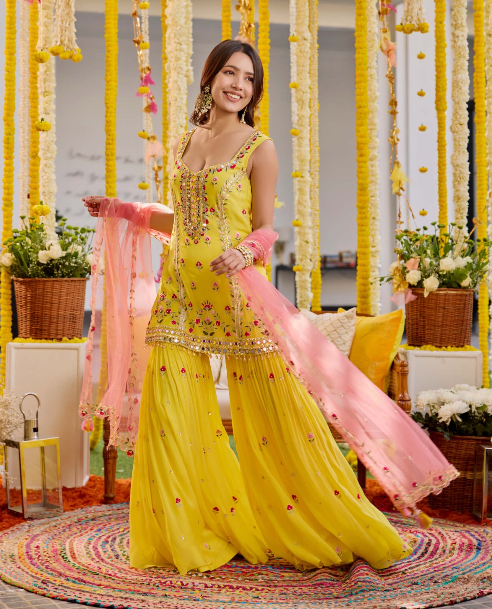 Brighten your ensemble with our sunshine yellow kurta, featuring vivid thread embroidery and playful tassel detailing at the hemline. This vibrant kurta is elegantly paired with a matching sharara, adorned with colorful thread bootis embroidery that adds a touch of intricate charm. The look is completed with a delicate pink net dupatta, enhancing the outfit with a soft, complementary hue. Perfect for special occasions, this ensemble offers a striking blend of vibrant color and refined elegance, ensuring you stand out with grace and style.