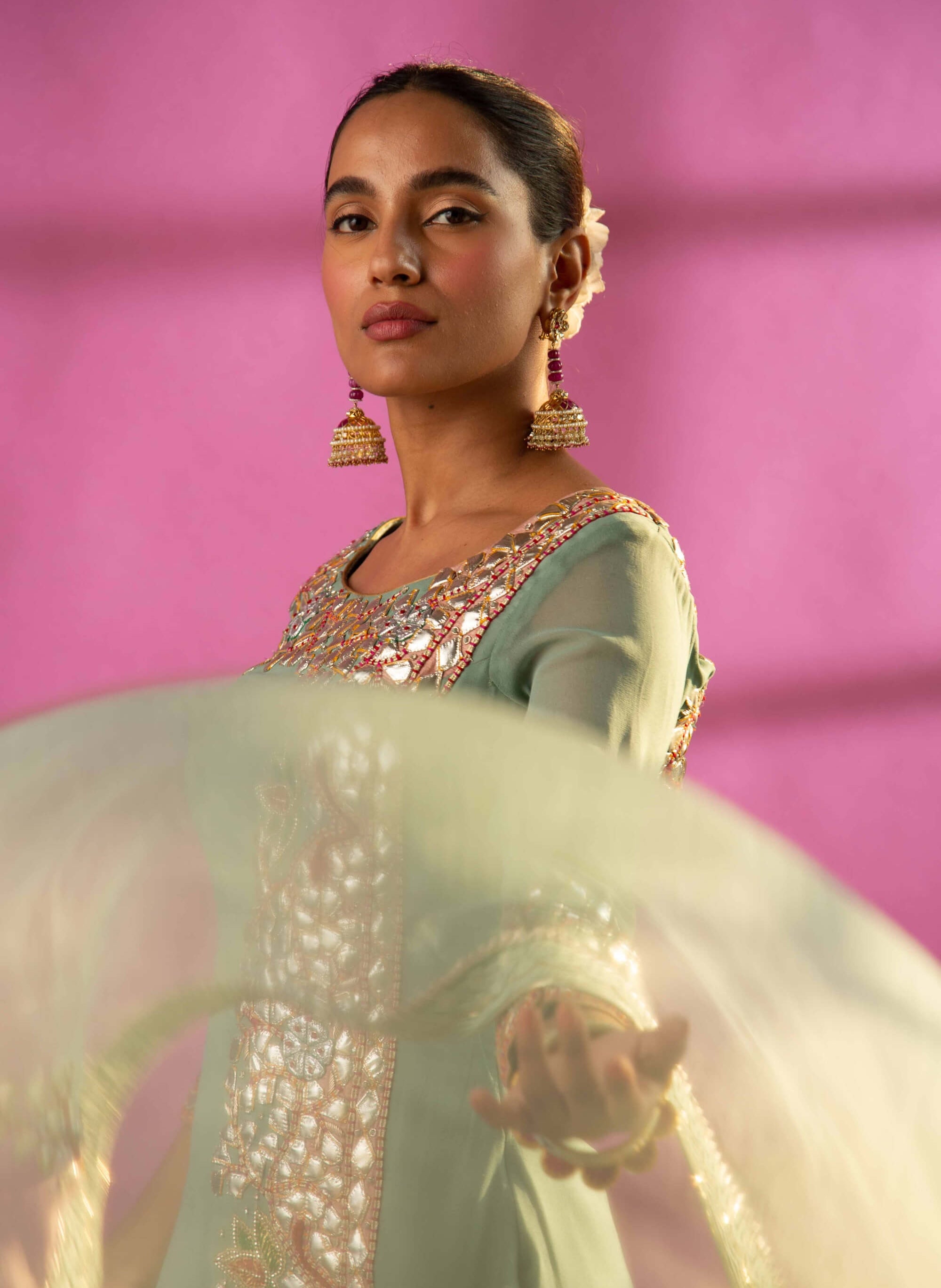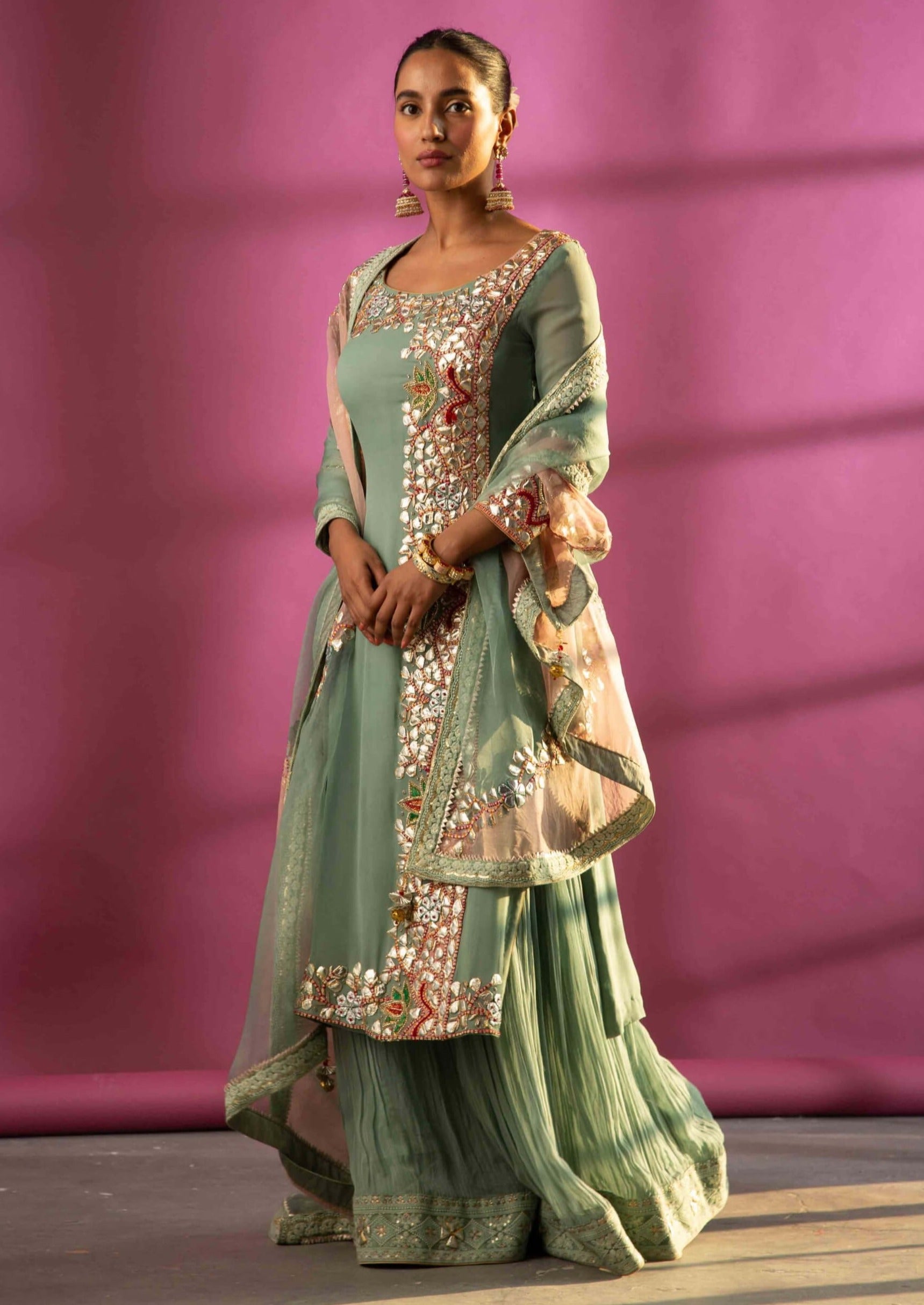 Elevate your festive wardrobe with our teal blue gota patti suit, an ensemble that seamlessly blends traditional charm with contemporary elegance. This striking outfit features a teal blue suit adorned with intricate gota patti embroidery, creating a rich and textured appearance. The suit is paired with a matching sharara that offers a flowing and graceful silhouette. Completing the look is a coordinating dupatta in georgette, which adds a light and airy touch to the ensemble. Ideal for weddings and special occasions, this set ensures a sophisticated and stylish statement with its vibrant color and exquisite craftsmanship.