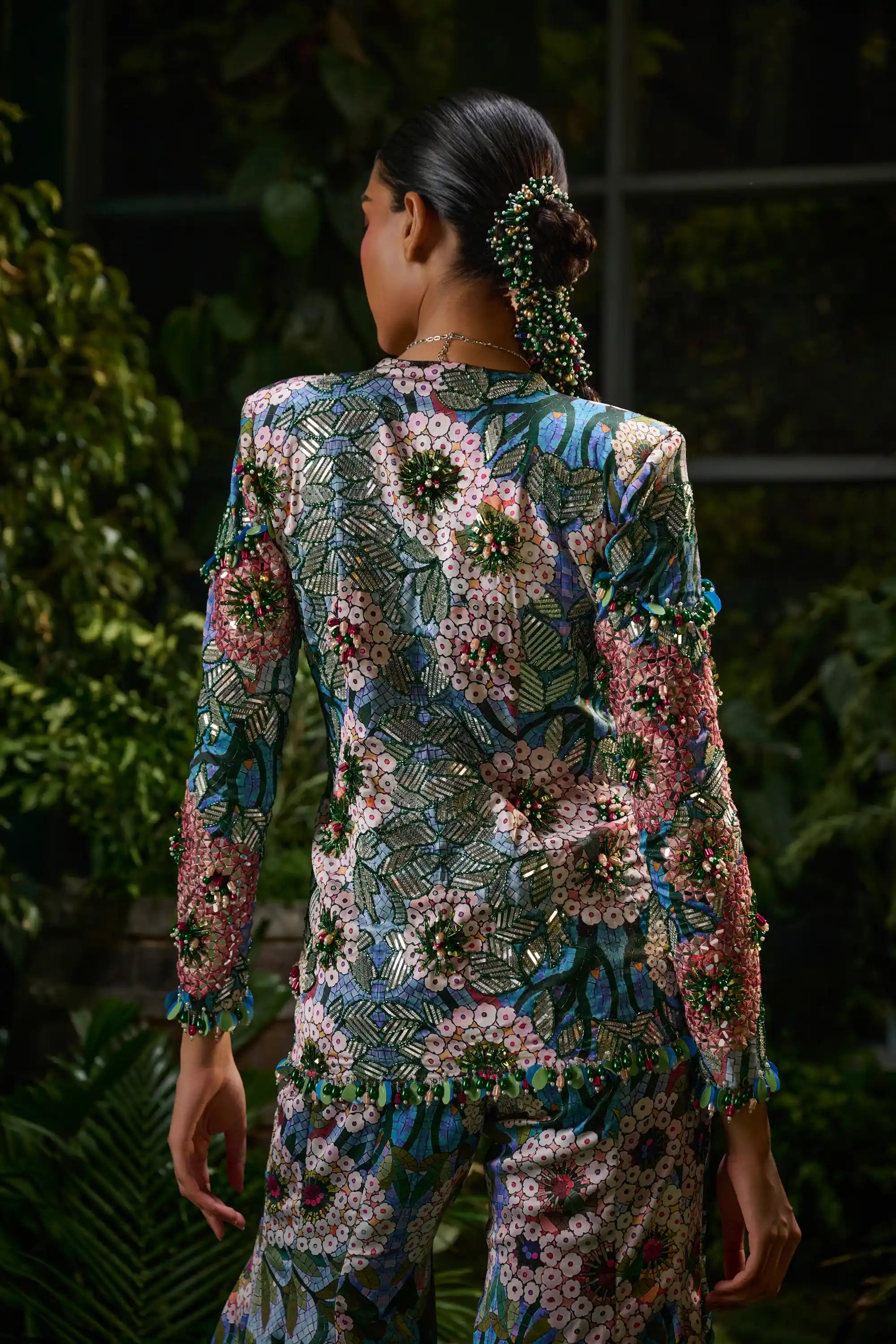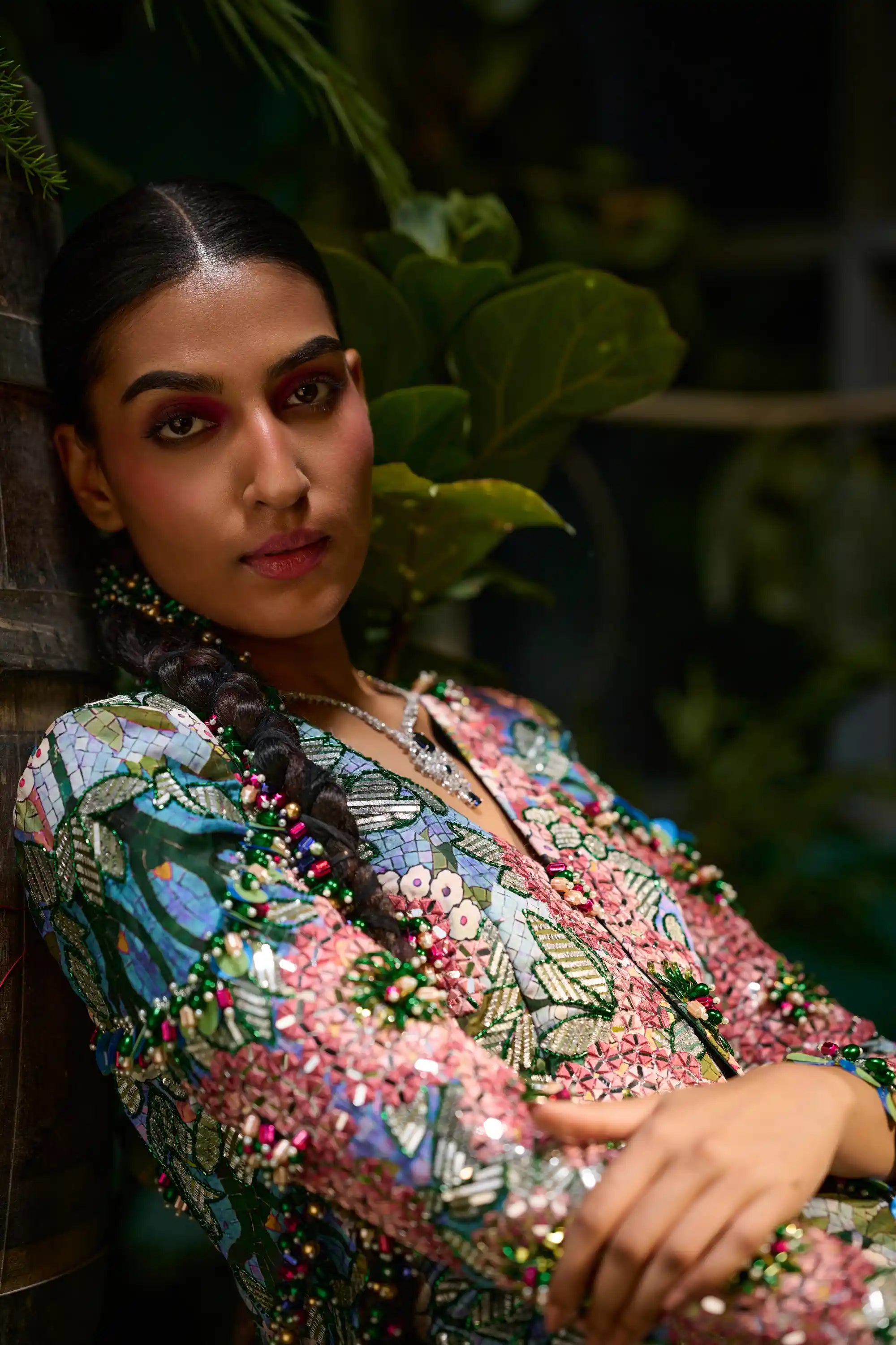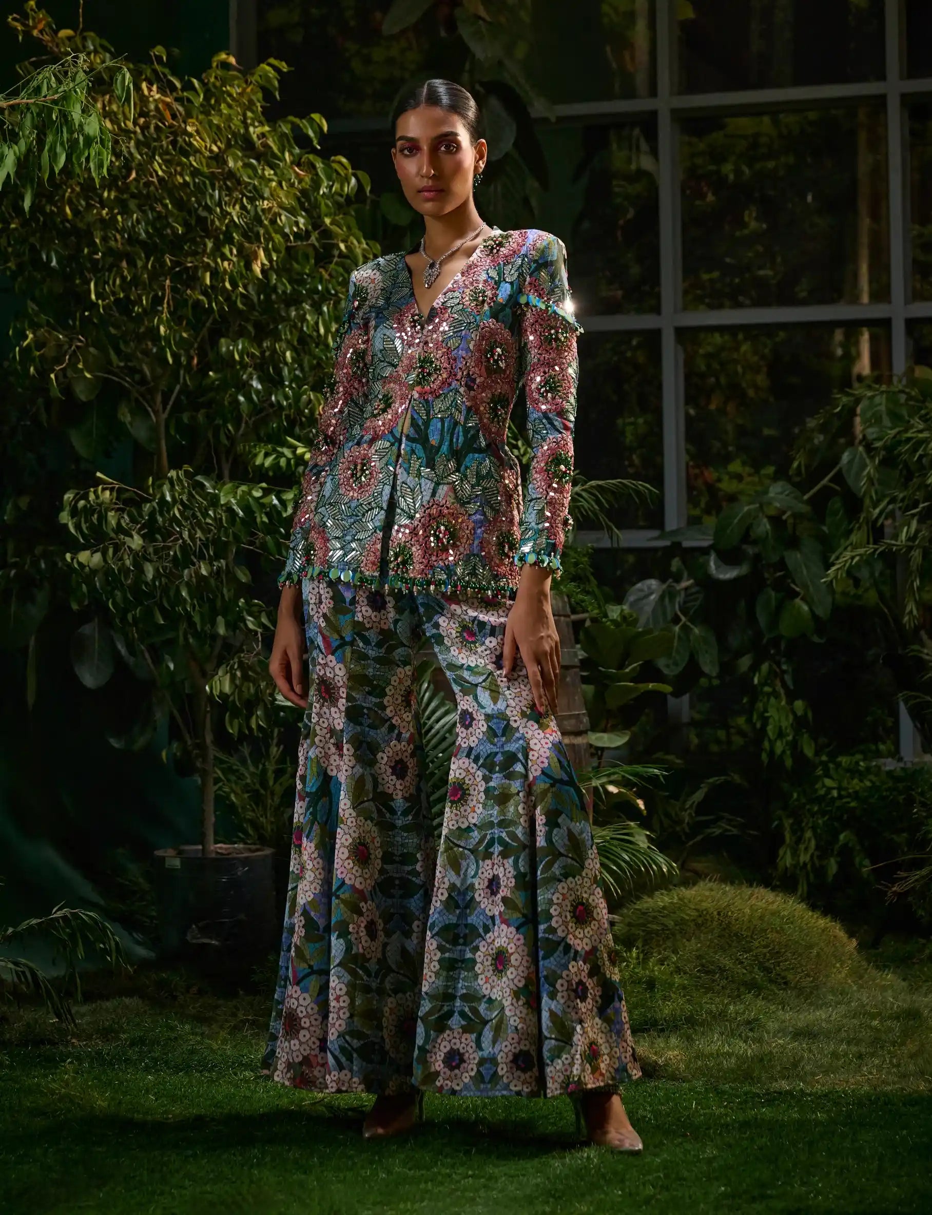 Elevate your style at the cocktail soirée with this stunning peplum top and flared pants ensemble. The handcrafted peplum top dazzles with intricate sequins, mirror, and crystal work, featuring full sleeves and a chic v-neckline. Thoughtfully designed with front and side slits for ease of movement, it also boasts elegant drop tassels at the hem. The straight-cut pants hug the body until the knee before flaring out beautifully to the feet, creating a captivating silhouette. Perfect for making a memorable entrance!
