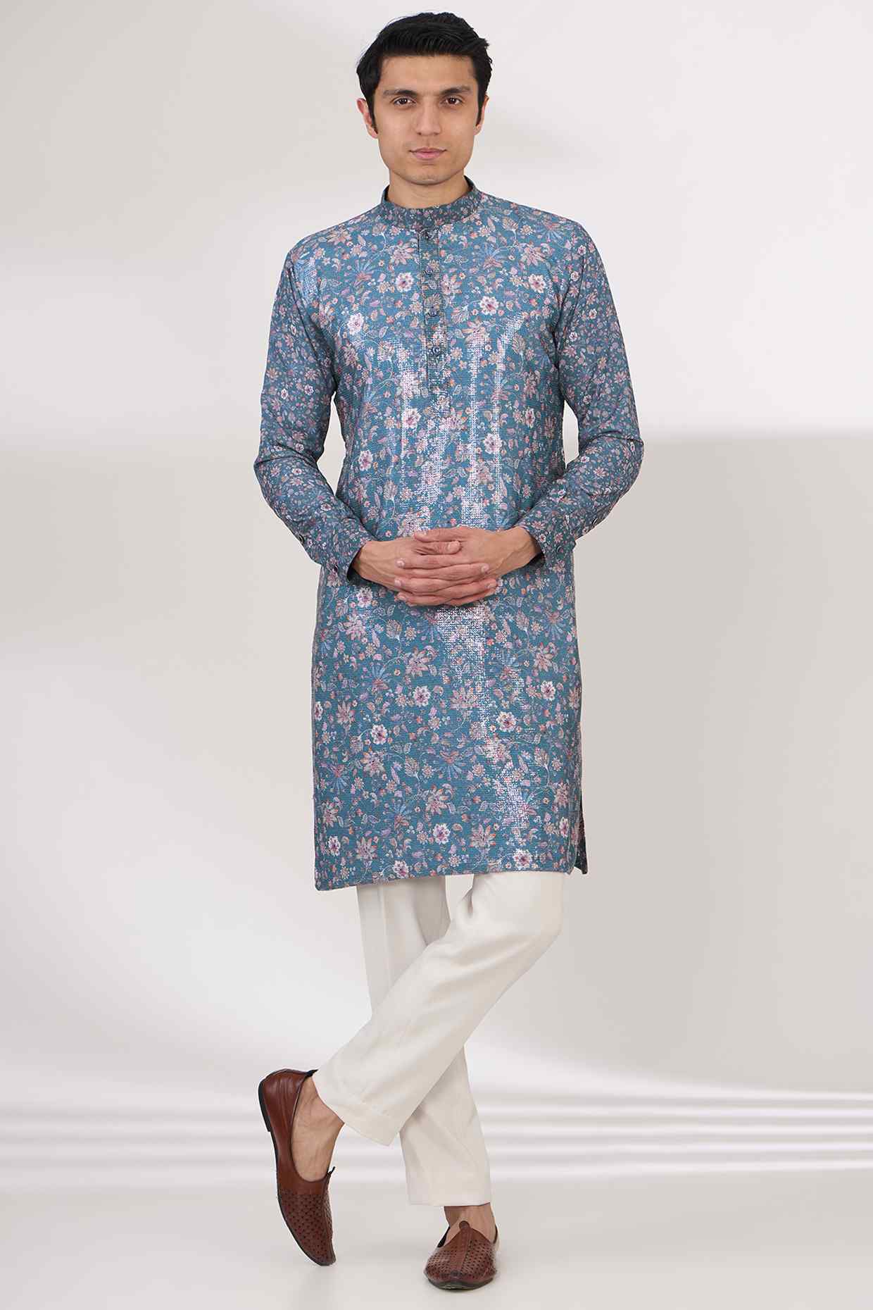 Enhance your style with our teal blue kurta and pant set, featuring a sophisticated blend of textures and hues. The kurta, in a captivating teal blue, is crafted from a luxurious mix of sheeting and georgette, and lined with smooth crepe for an elegant drape and superior comfort.