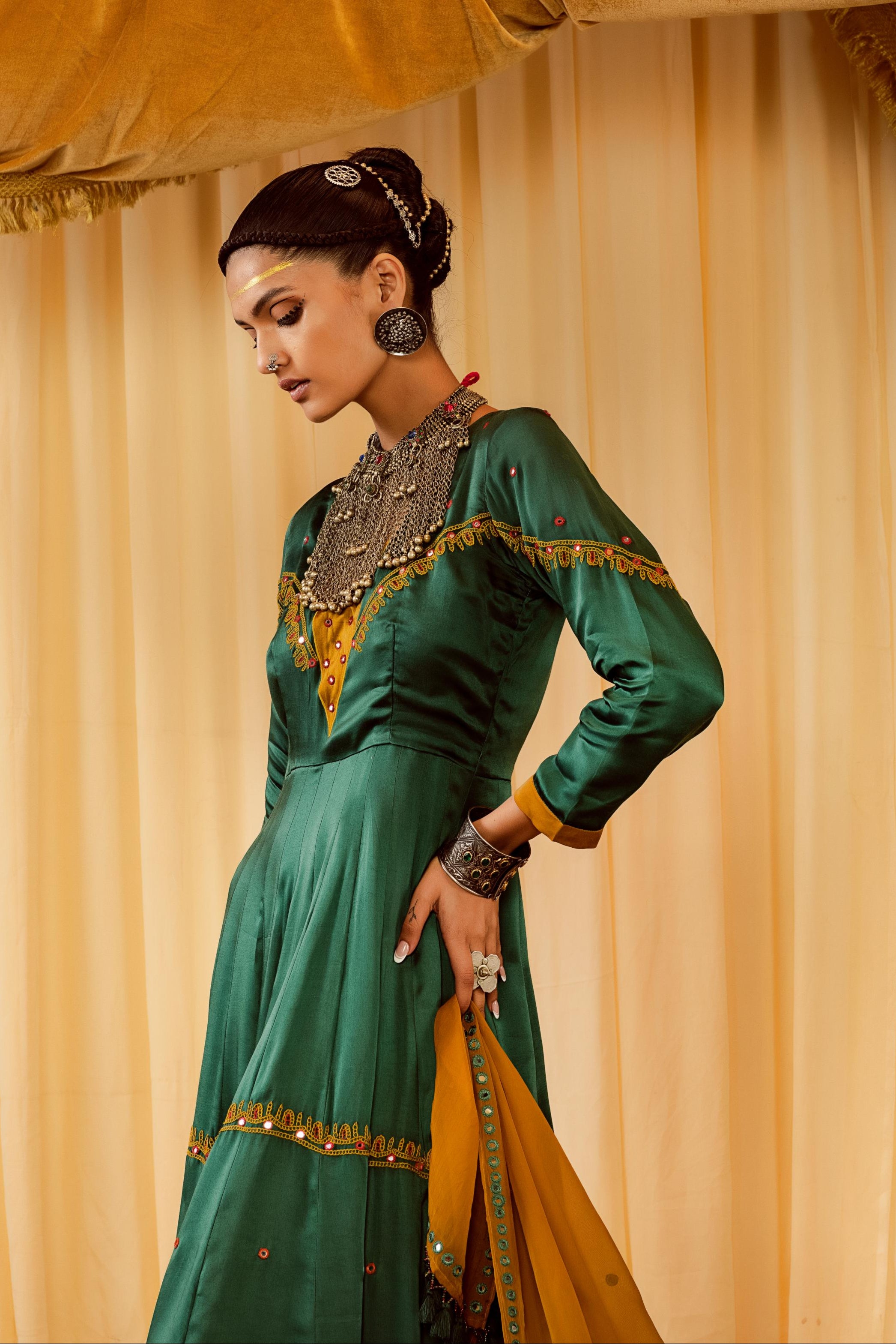This exquisite Sacramento teal Anarkali suit showcases intricate hand embroidery and mirror work adorning the sleeves, upper bust, and flowing down from the knees to the hem. Delicate mustard accents add a subtle contrast. Paired with a mustard dupatta featuring mirror work and tassel details, this ensemble is a perfect blend of elegance and tradition, ideal for festive occasions.