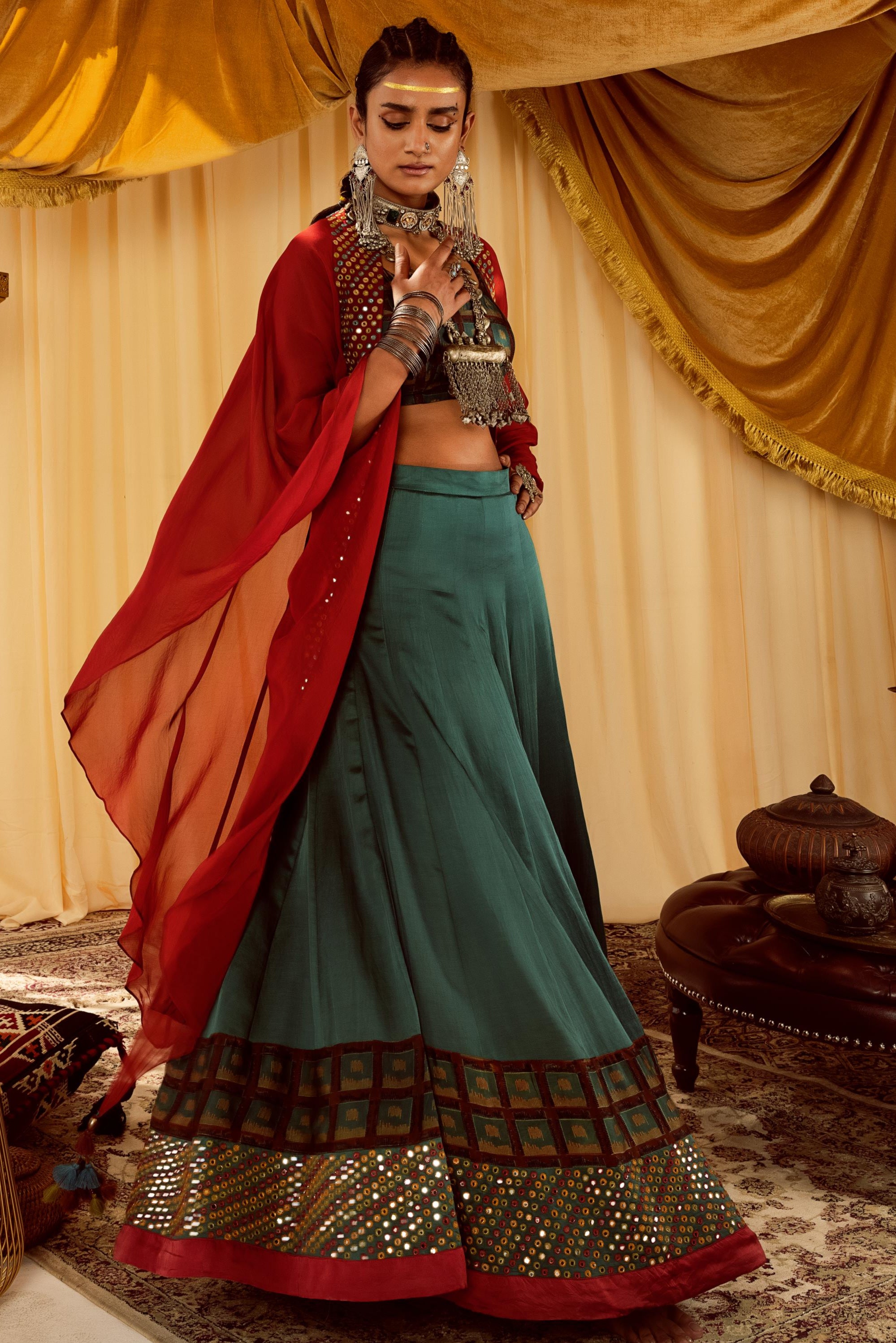 This striking lehenga set features intricate heavy mirror work embellishing the flare and cape borders. The blouse showcases a beautiful Vanaspati print, which is also reflected in the lehengaÕs border for a cohesive look. Completing the ensemble is a contrasting rust-hued cape, adding a bold yet elegant touchÑperfect for festive and celebratory occasions.