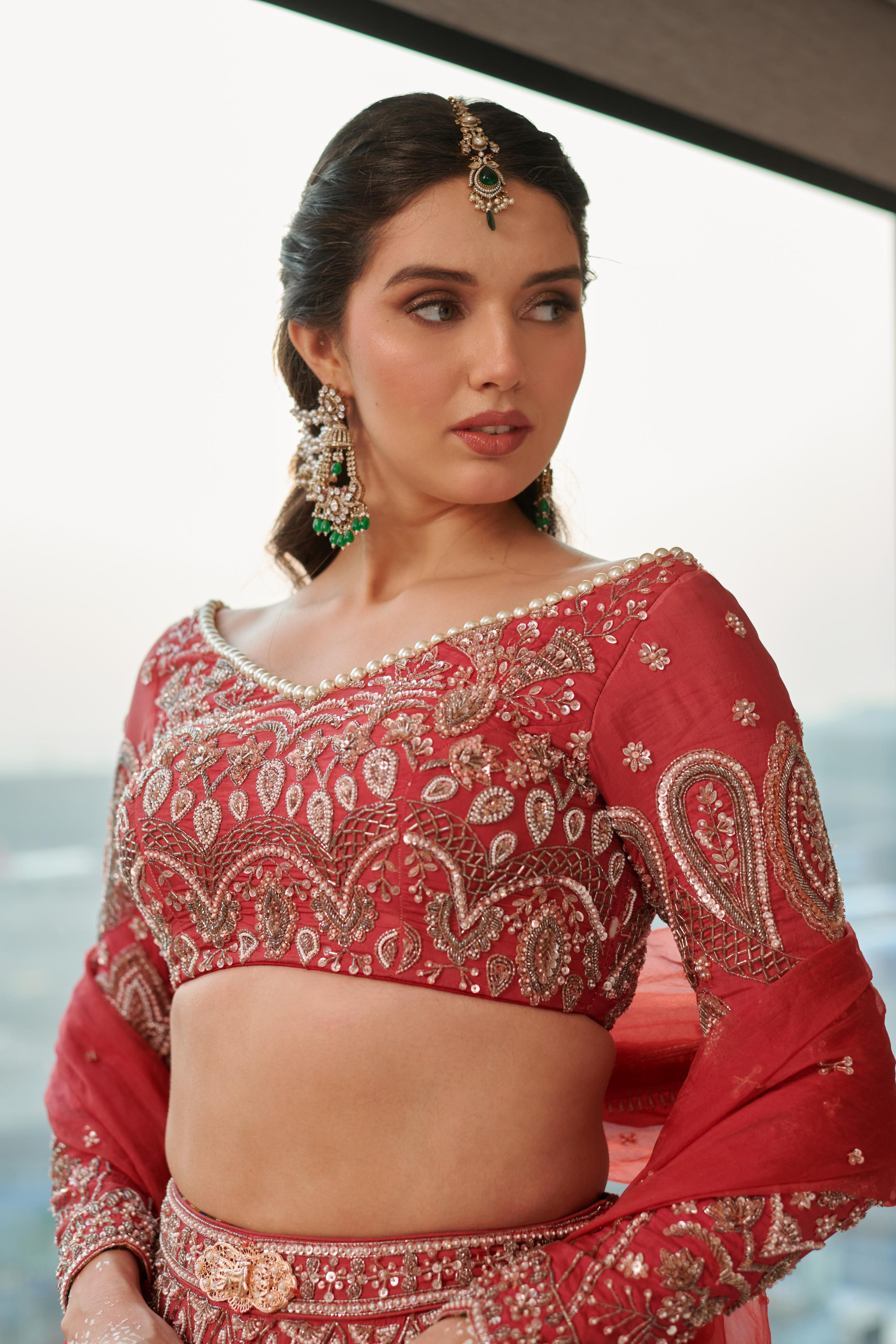 Radiating regal charm this tomato red hitch lehenga set is adorned with antique gold embroidery shimmering sequins and intricate cutdana work. The full-sleeve V-neck blouse detailed with pearl embellishments enhances the sophistication while a sheer organza dupatta with delicate buttis and pearl tassels adds a dreamy elegant finish.