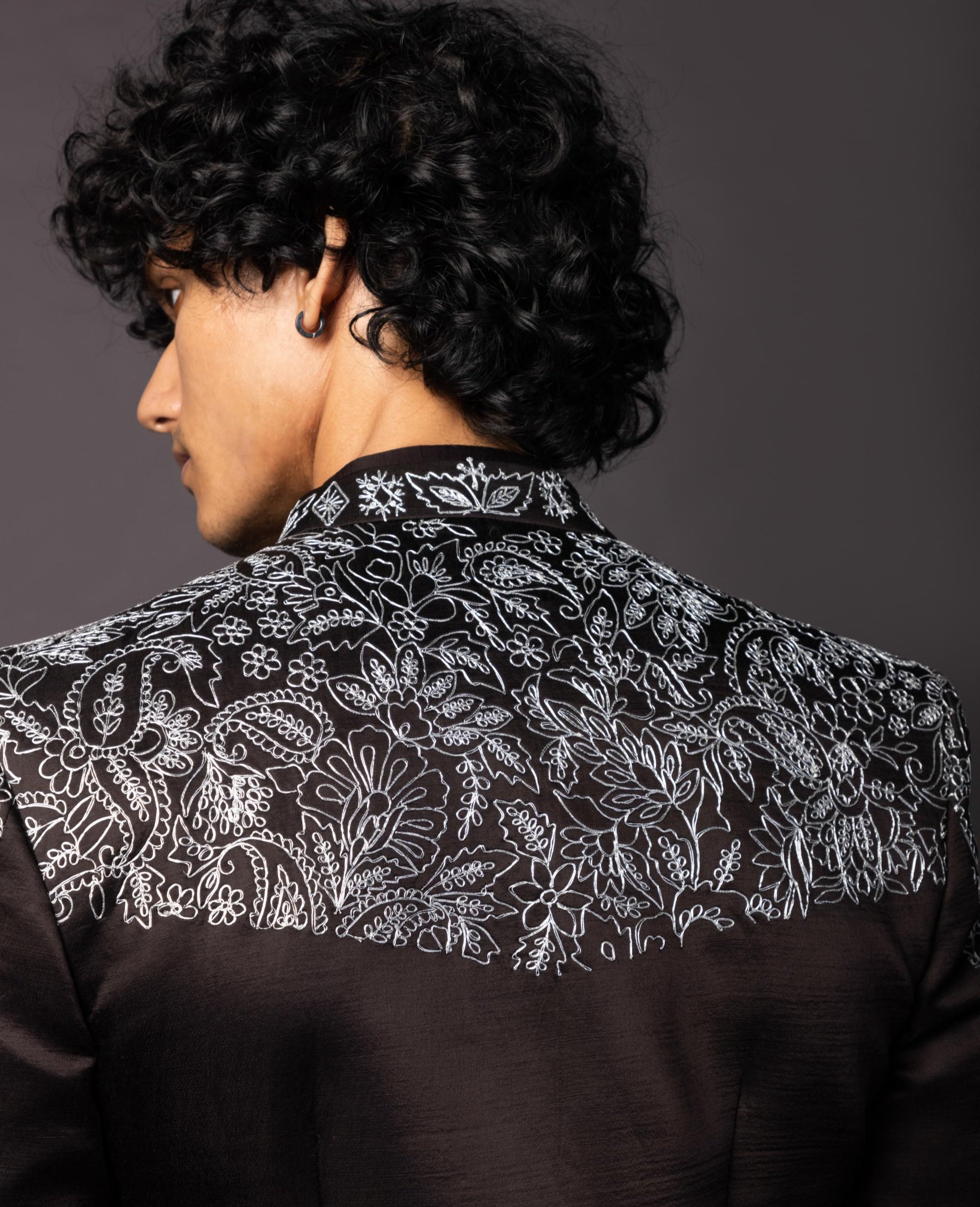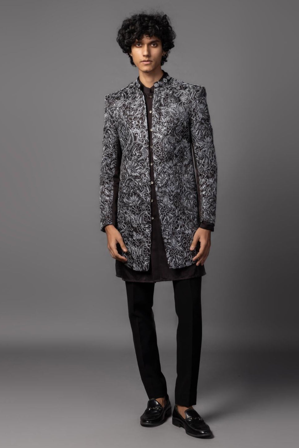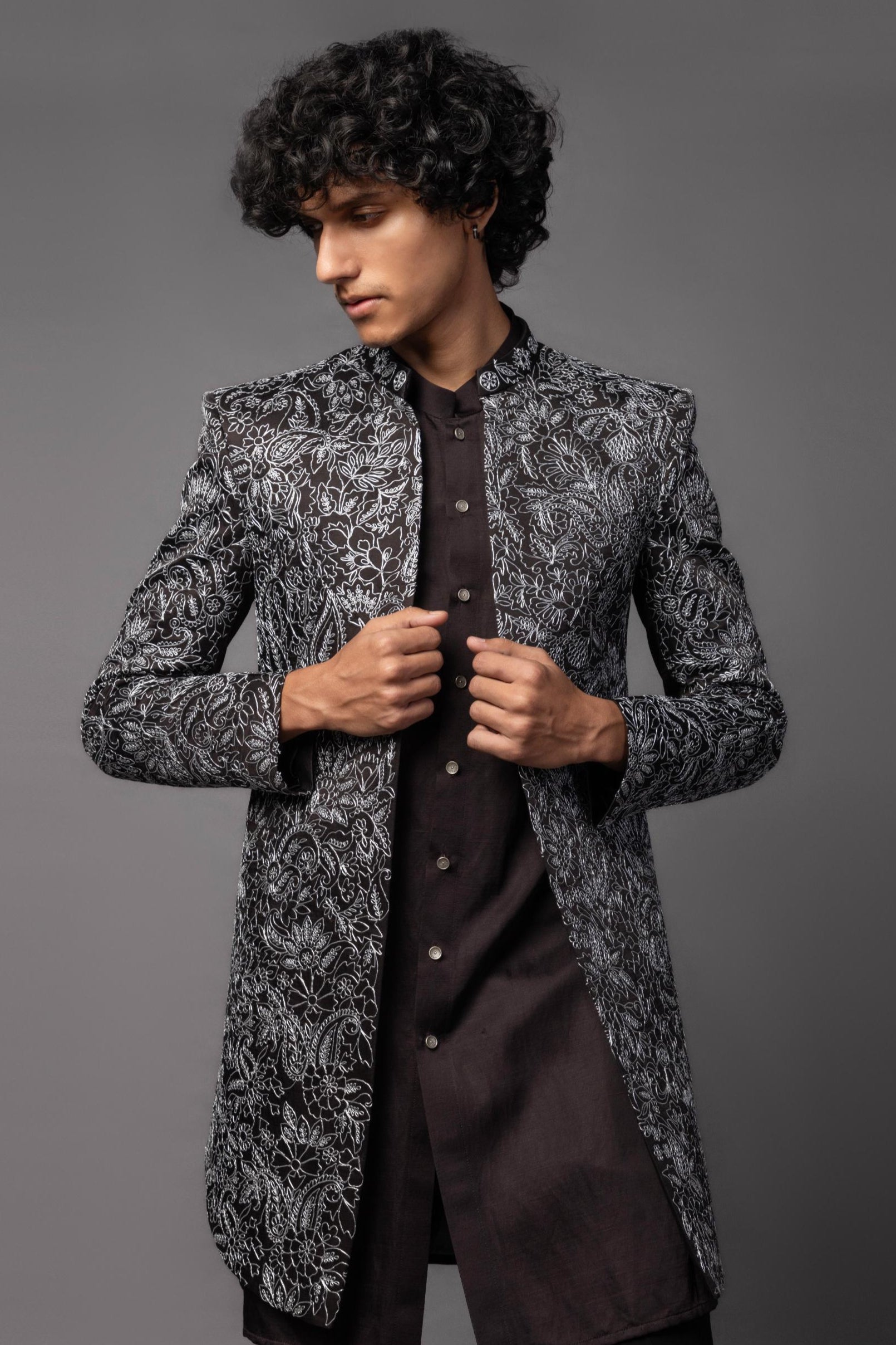 A truffle brown open achkan, exquisitely embroidered with silver zari, exudes understated luxury. Paired with a matching pintucked kurta, this ensemble strikes the perfect balance between tradition and modern sophistication. The rich earthy tone, intricate detailing, and fluid silhouette make it an ideal choice for elegant celebrations, ensuring a refined and regal presence.