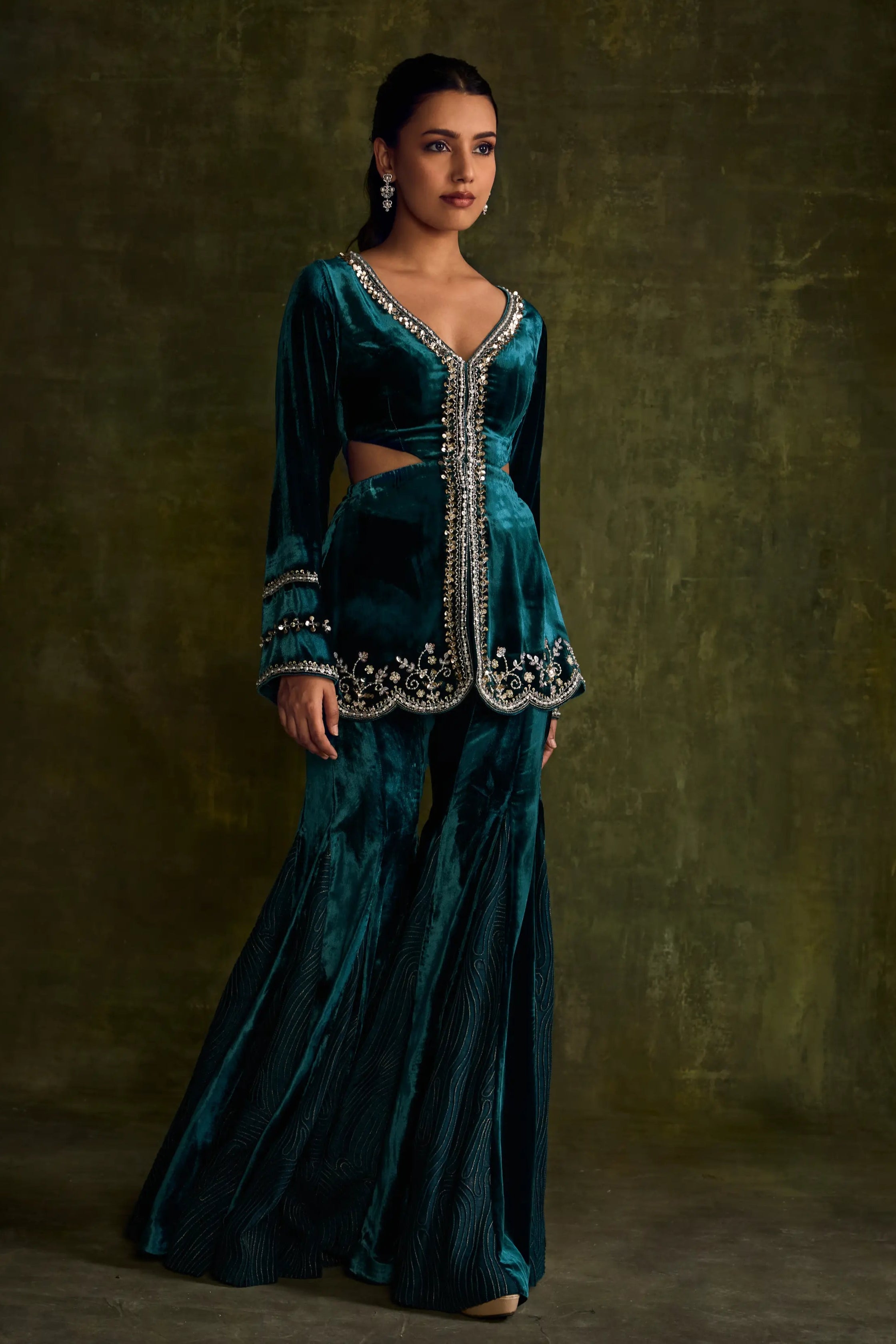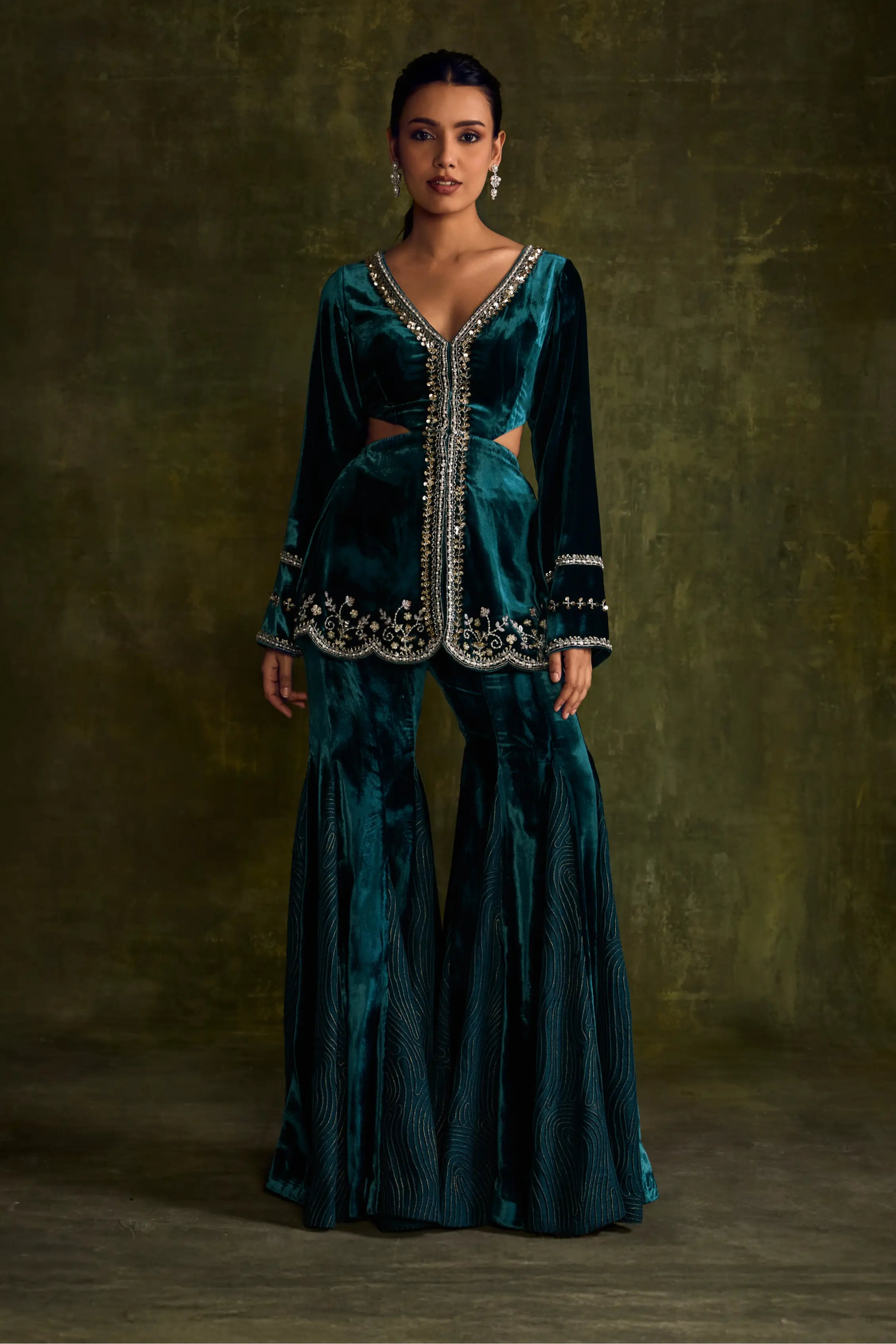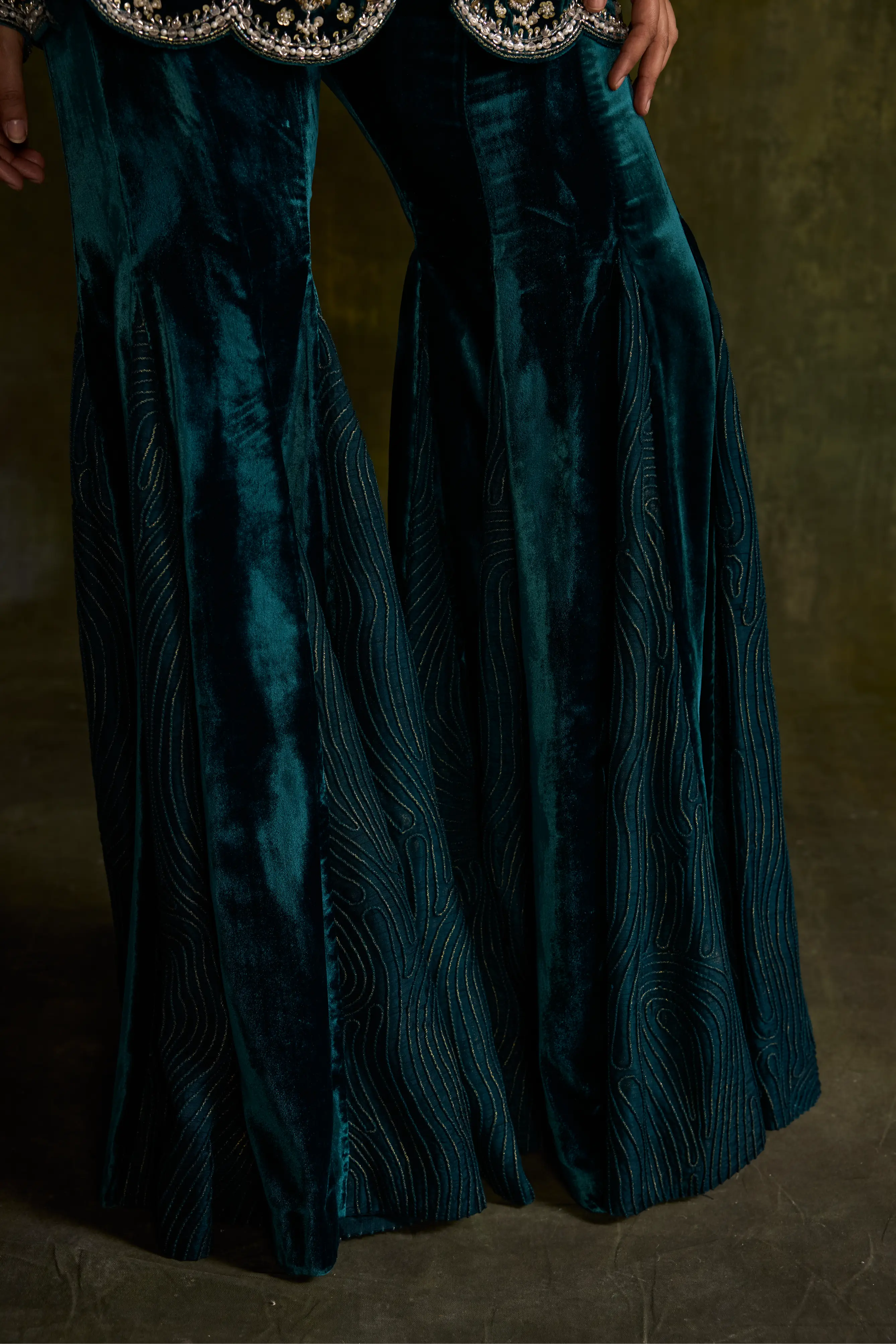 Turn heads with this teal silk velvet cut-out detail peplum, featuring a scalloped, hand-embroidered hem and sleeves. Paired with godet flared pants in velvet and silk, this ensemble exudes modern elegance with a touch of traditional craftsmanship, perfect for festive soirŽes or glamorous celebrations.