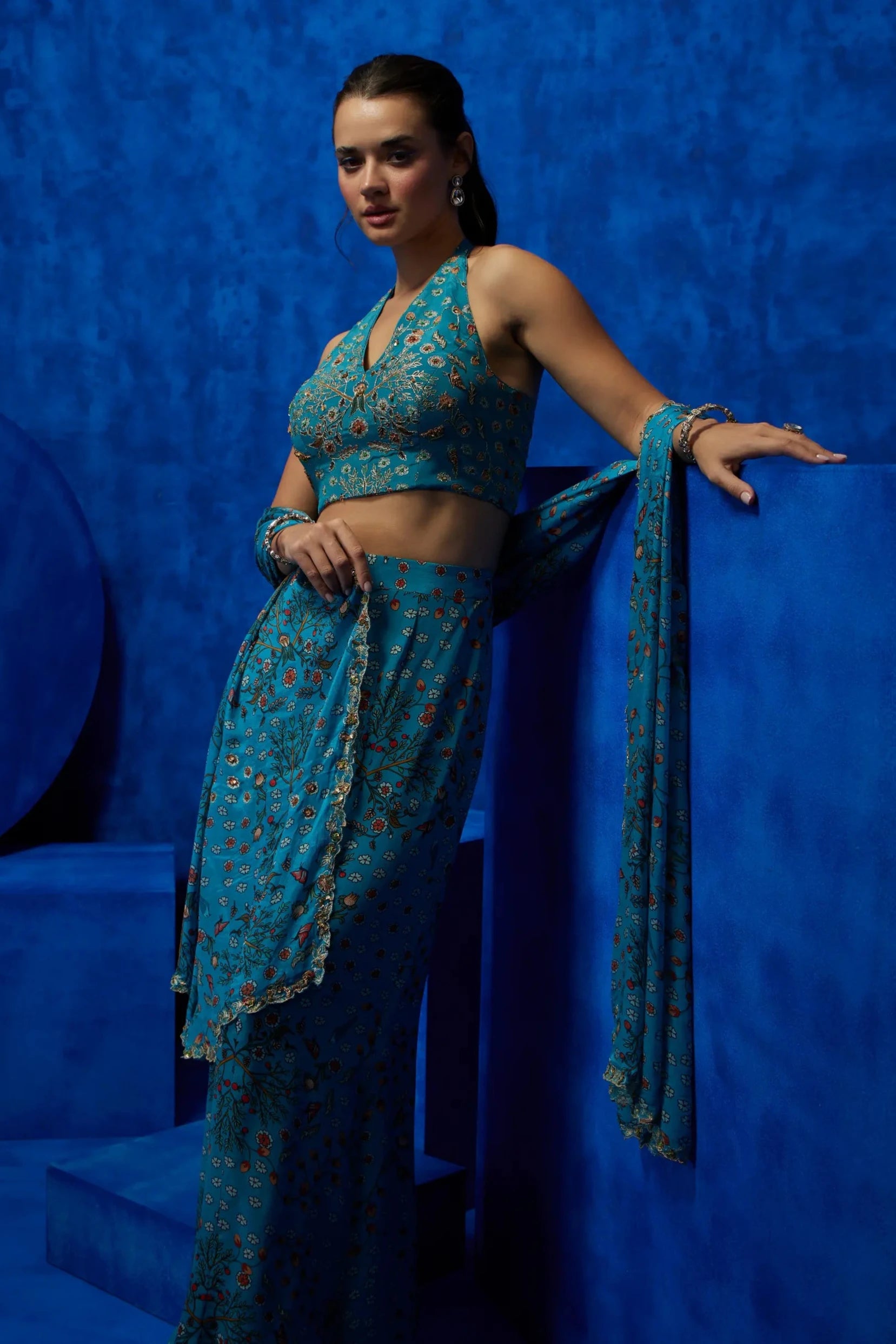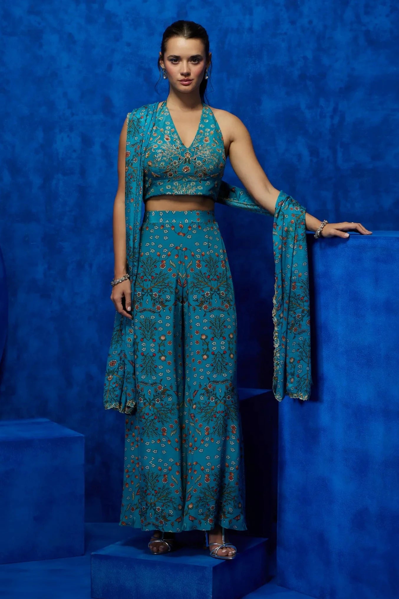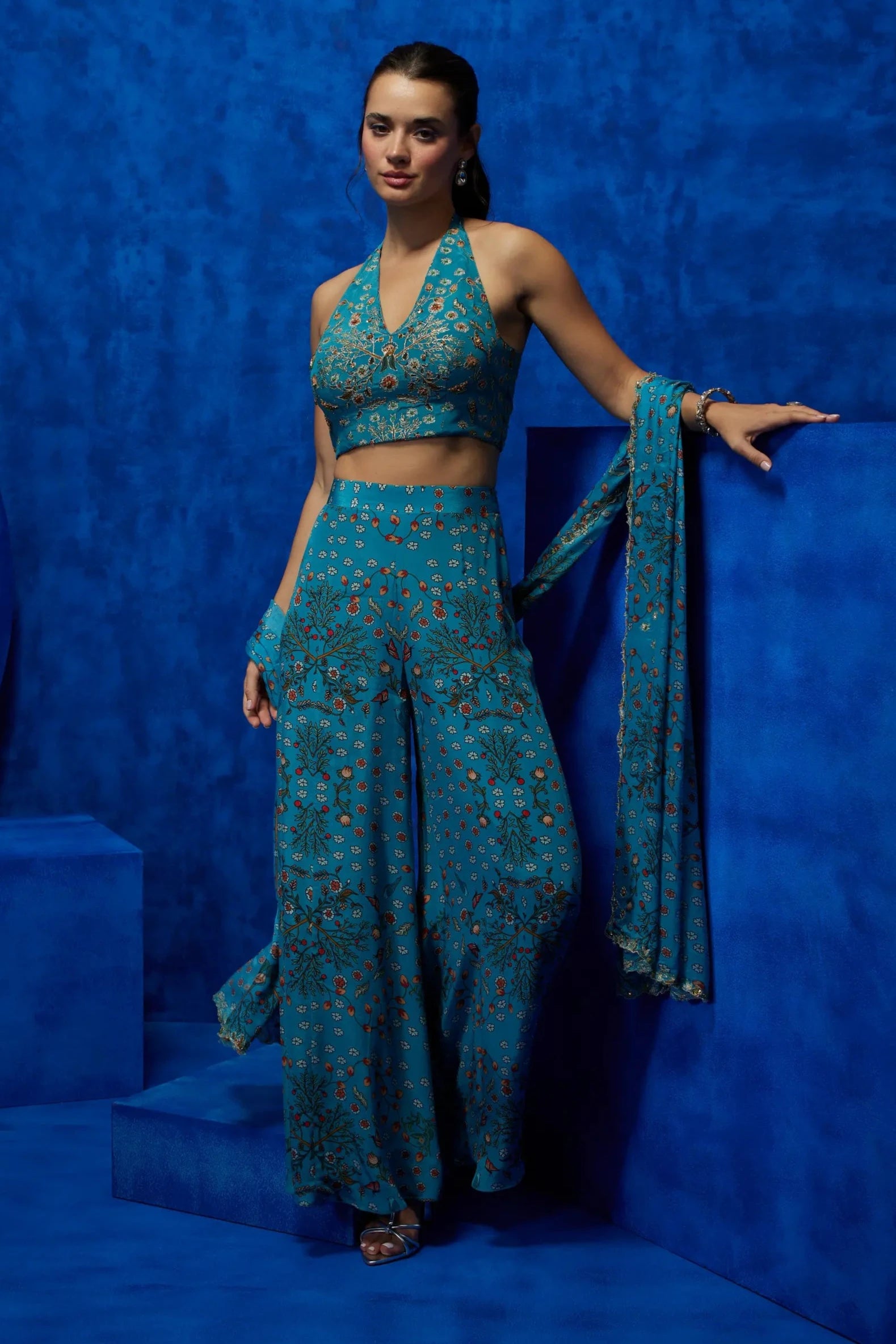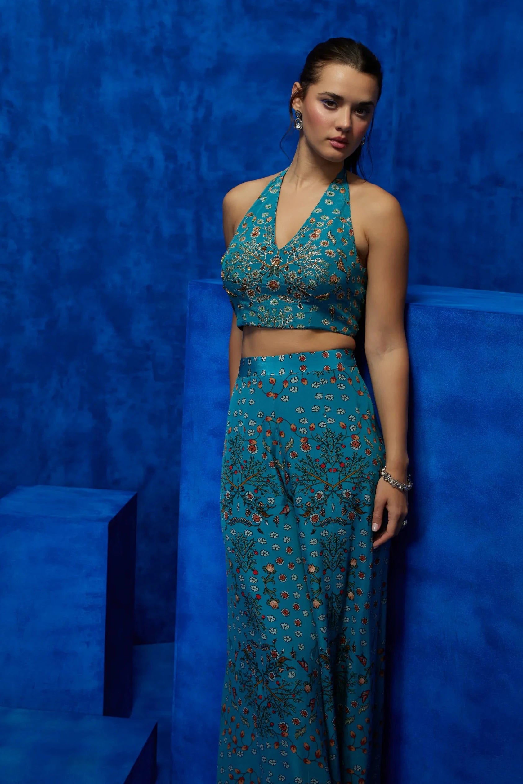 Add a splash of color to your wardrobe with this blue floral printed halter top with pants. The vibrant turquoise hue, paired with delicate floral prints, creates a fresh and lively look, while the halter neckline adds a touch of elegance. The matching pants provide a comfortable and flattering fit, making this set perfect for casual outings, brunches, or vacation getaways. Effortlessly stylish and versatile, this ensemble is a must-have for your summer wardrobe.