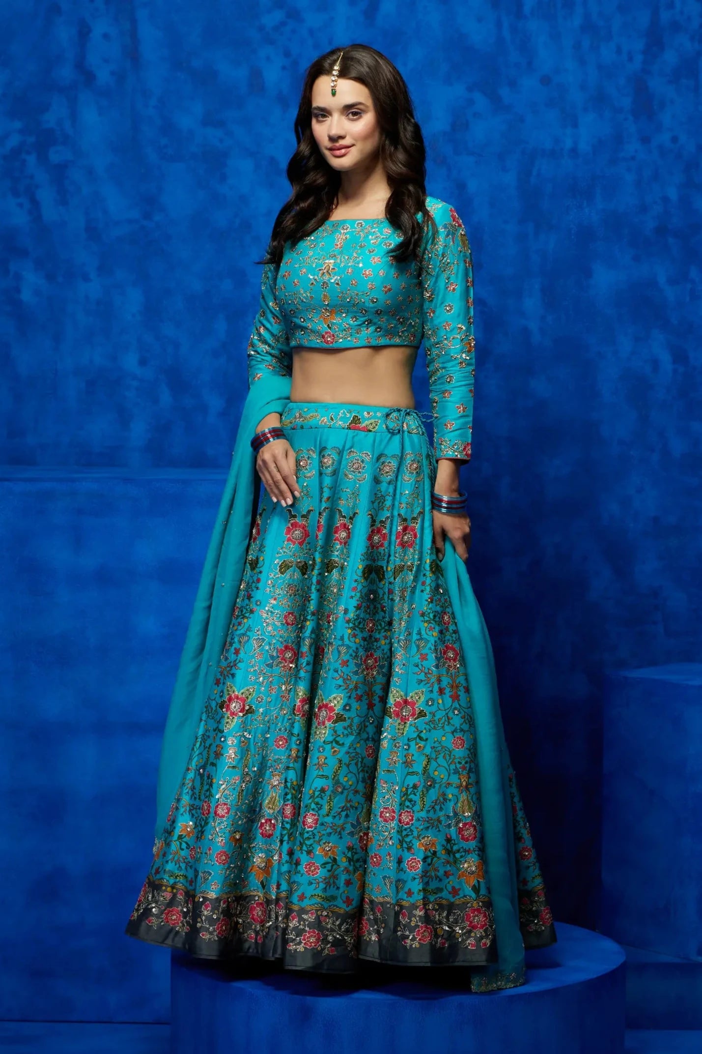 Embrace timeless elegance with this blue floral printed lehenga set. The vibrant turquoise hue, adorned with delicate floral prints, creates a fresh and enchanting look. The flowing lehenga, paired with a matching choli and dupatta, offers a graceful and flattering silhouette. Perfect for weddings, festive celebrations, or cultural events, this lehenga set combines traditional charm with contemporary style.