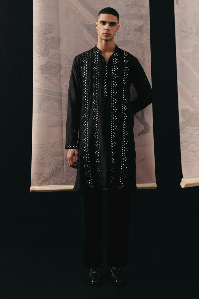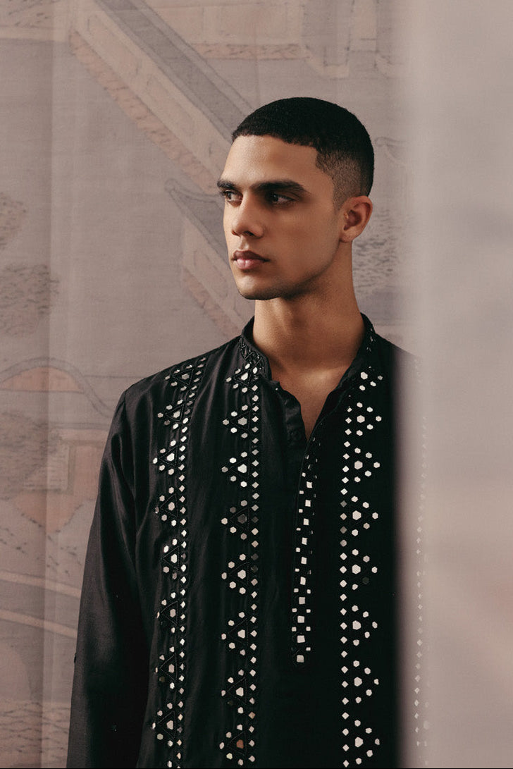 The Black Mirrorwork kurta set by Twenty Nine is a striking celebration of contemporary festive wear. Crafted in a deep black hue, this kurta set features intricate mirror embellishments that add dimension and luminosity to the silhouette. Designed for comfort and sophistication, the kurta set offers structured tailoring that enhances the overall fit while allowing effortless movement. Ideal for weddings, receptions, and celebratory gatherings, this kurta set blends traditional craftsmanship with modern aesthetics. The reflective detailing elevates the ensemble, making this kurta set a standout choice for evening occasions. Styled with minimal accessories, the kurta set commands attention through texture and craftsmanship alone. For men seeking a refined festive ensemble, this black kurta set delivers statement elegance with enduring appeal.