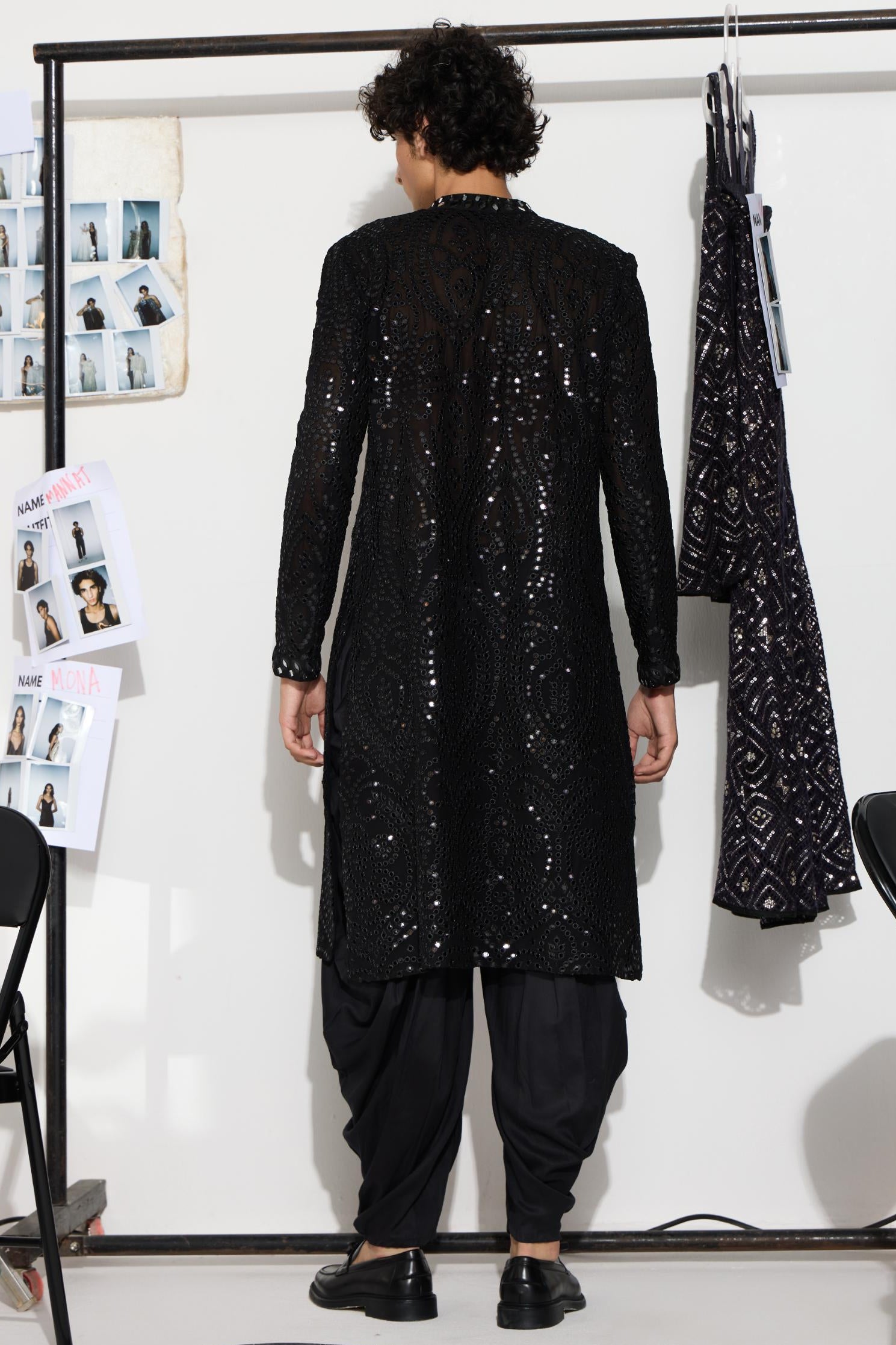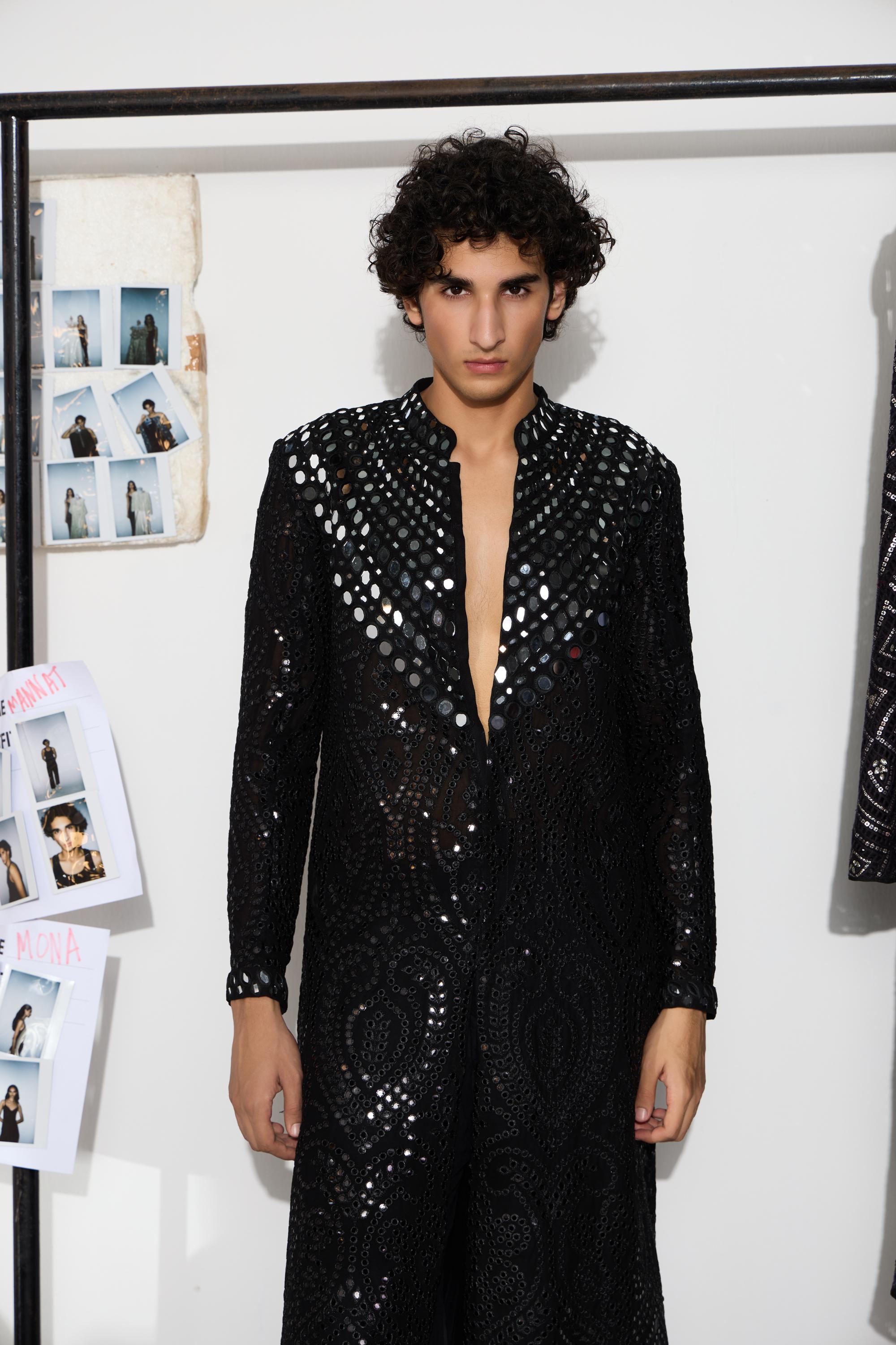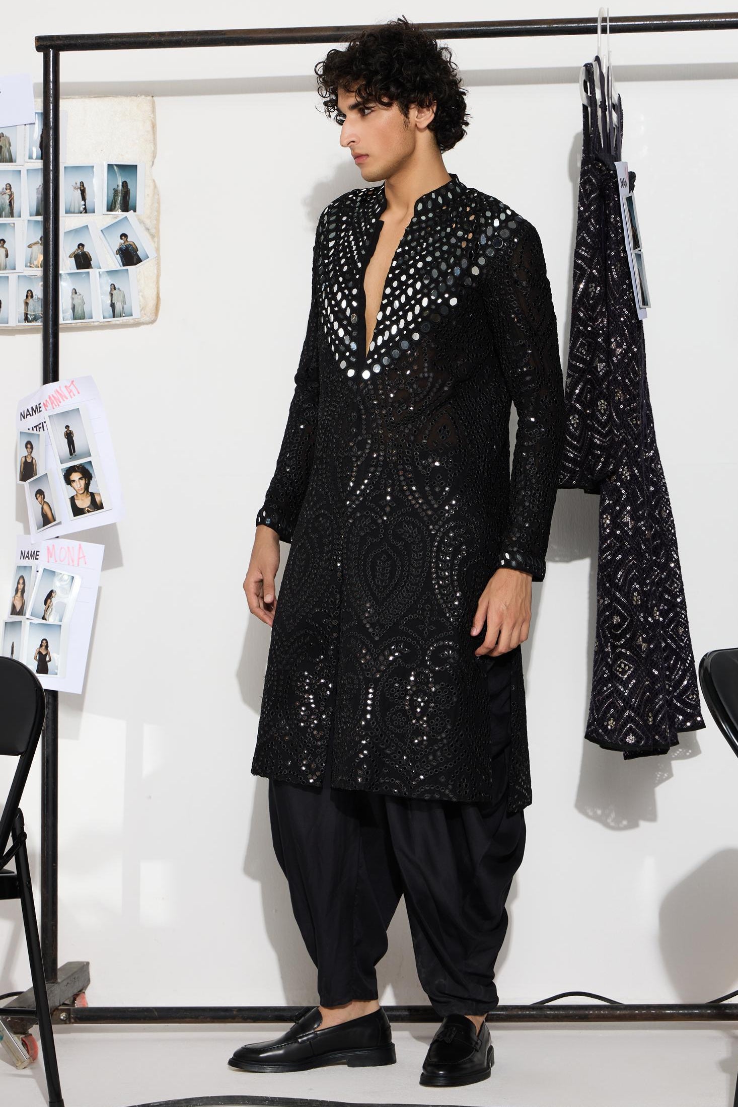 This black mirrorwork sherwani is perfect for wedding events and festive celebrations. The intricate mirrorwork adds opulence, while the structured silhouette ensures a regal appearance. Ideal for men who want to make a bold statement with traditional attire that blends contemporary elegance and classic charm.