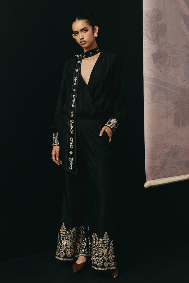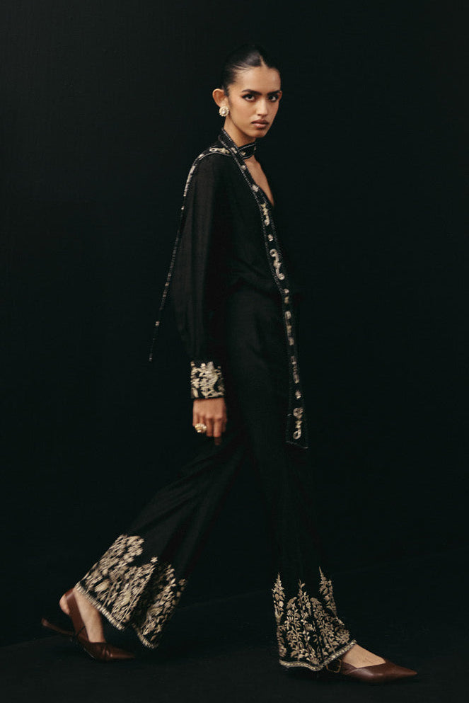 The Black Parsi Gaara Bow Tie Shirt with Palazzo palazzo set by Twenty Nine is crafted for contemporary elegance. Designed in a classic black hue, this palazzo set features intricate gaara embroidery across its tailored silhouette. The bow-tie detail enhances the statement appeal of the palazzo set. Perfect for festive evenings, this palazzo set balances structure with fluidity. The embroidery throughout the palazzo set highlights artisanal craftsmanship. This embroidered palazzo set is a refined choice for elevated modern celebrations.