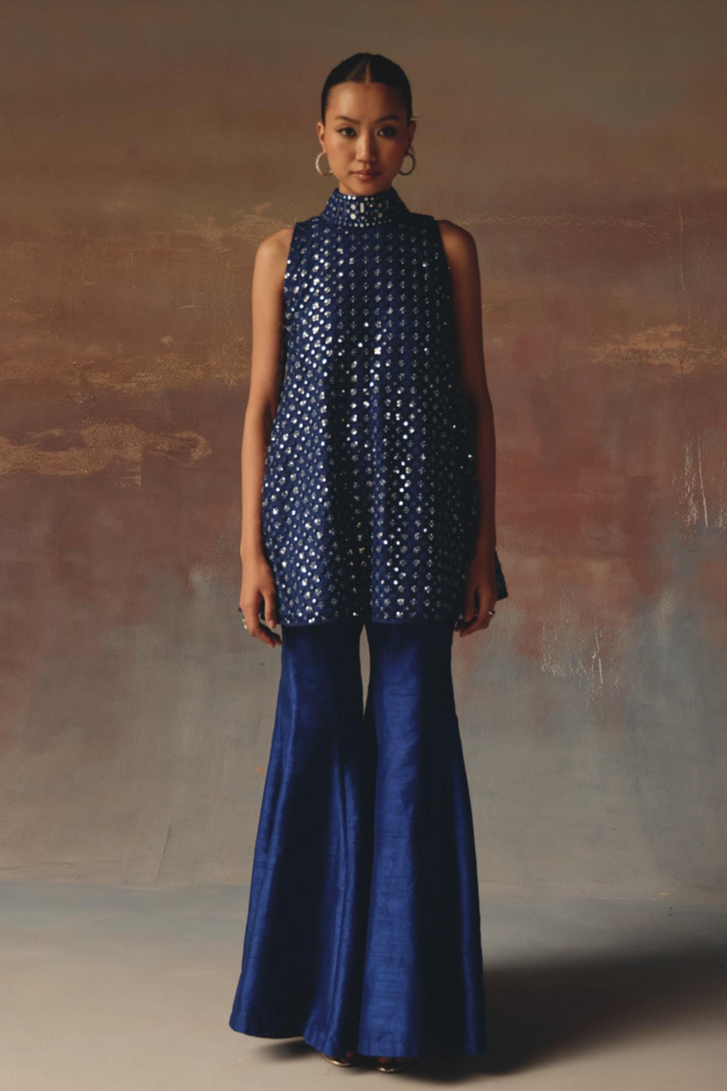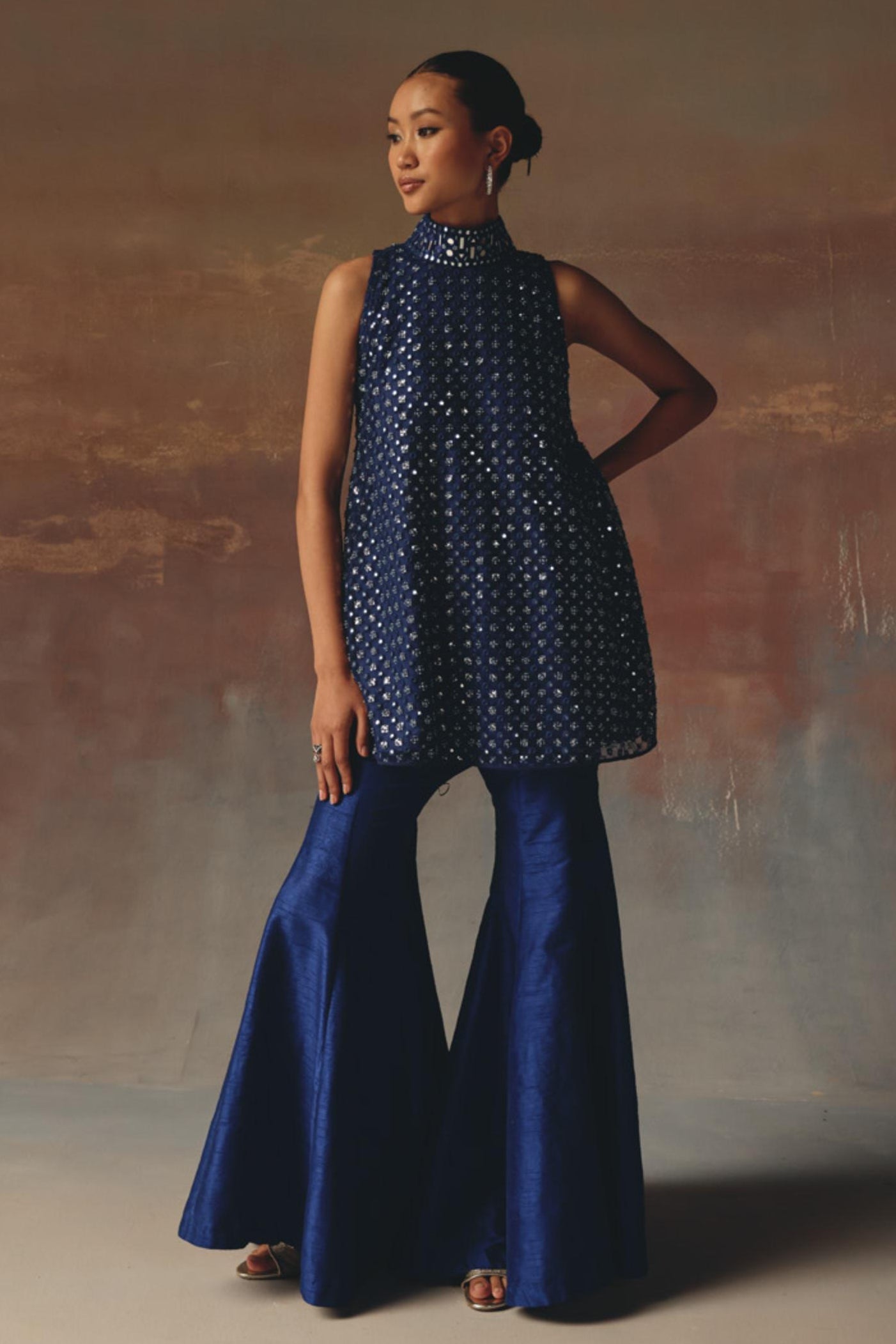 Designed for contemporary festive dressing, this blue short a-line top with bell bottom by Twenty Nine features clean lines and fluid movement. The a-line cut flatters the frame, while bell bottoms add retro-inspired flair. Ideal for daytime festivities, festive lunches, and celebrations.
