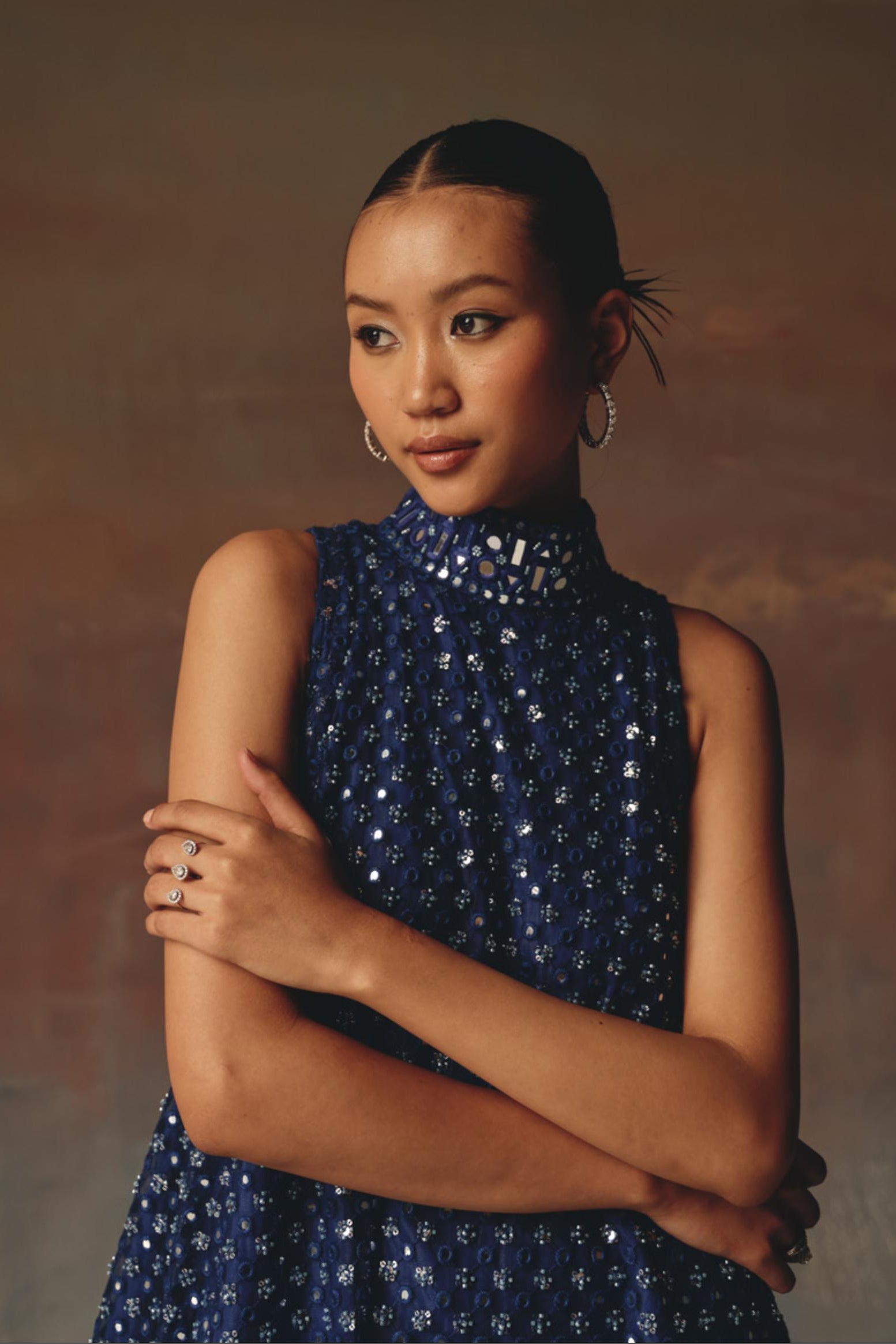 This blue a-line top set by Twenty Nine offers a youthful, modern take on festive silhouettes. The short a-line top balances perfectly with flared bell bottoms, creating an effortless yet statement-worthy look.