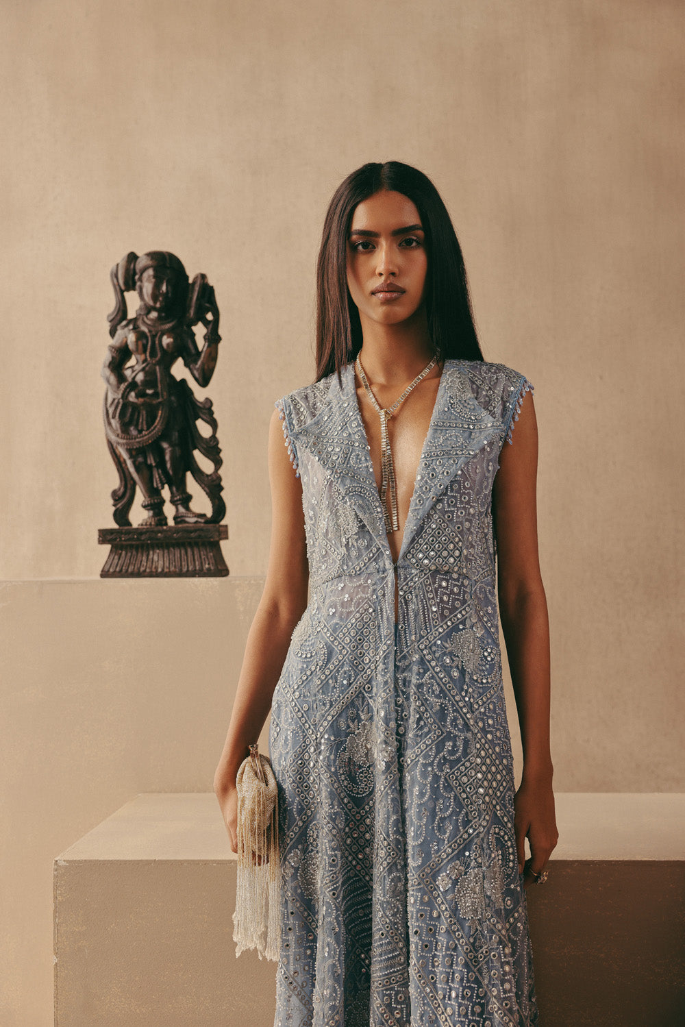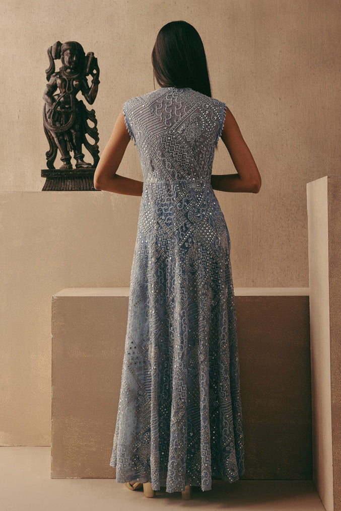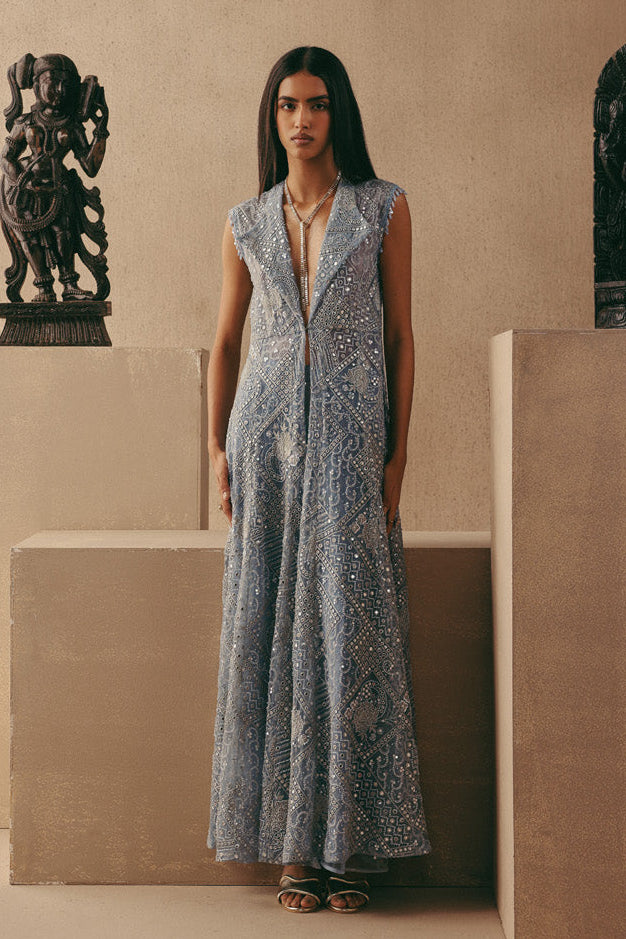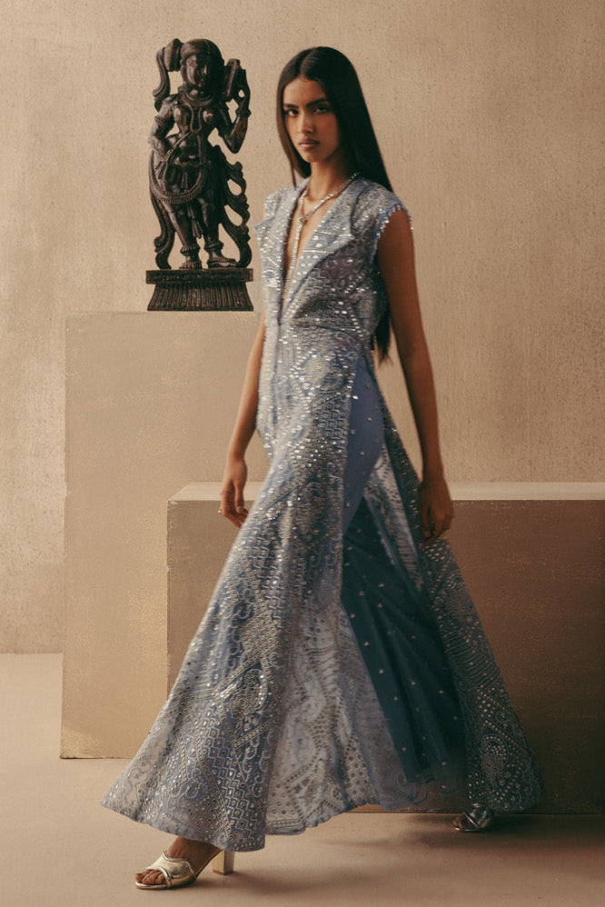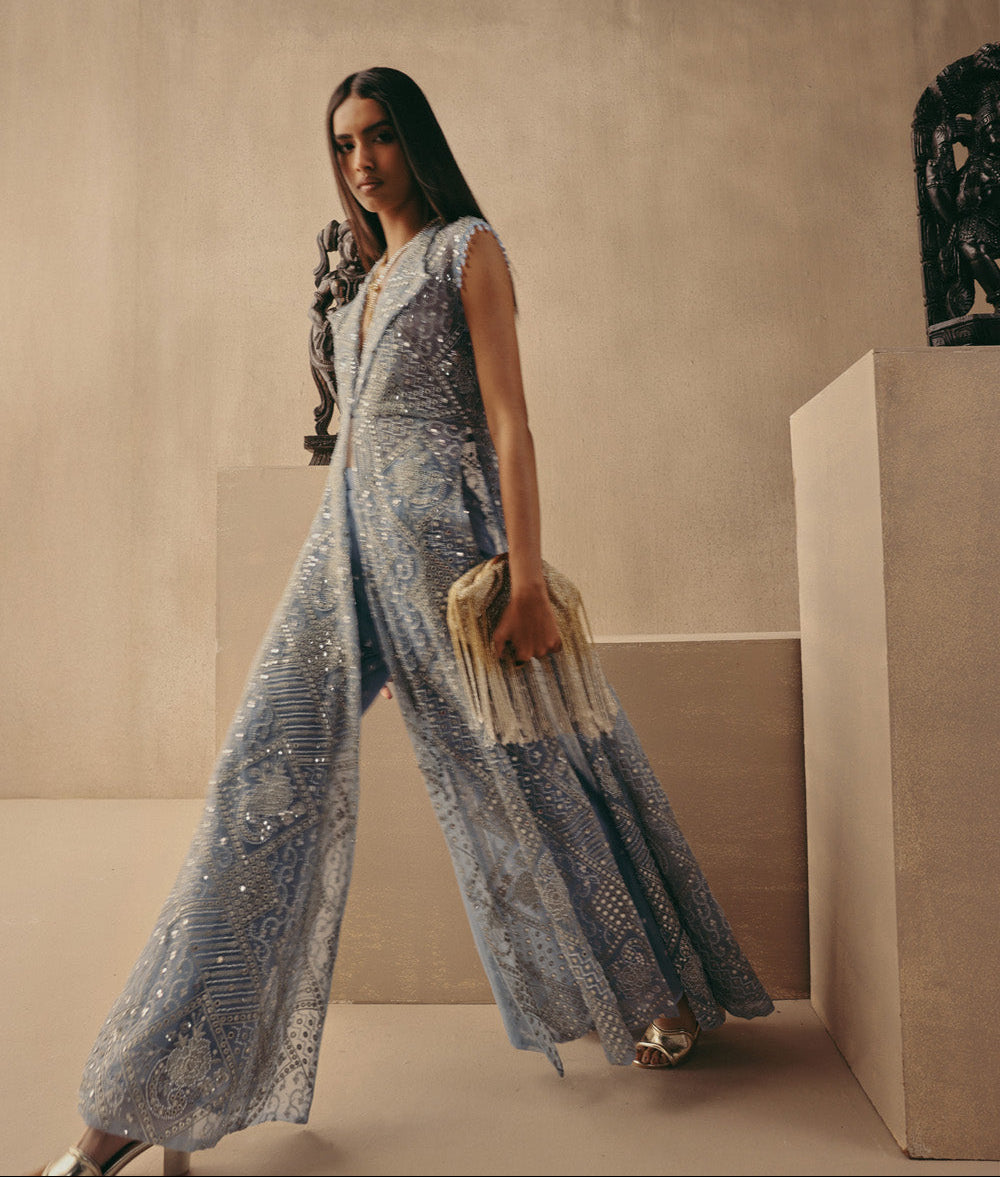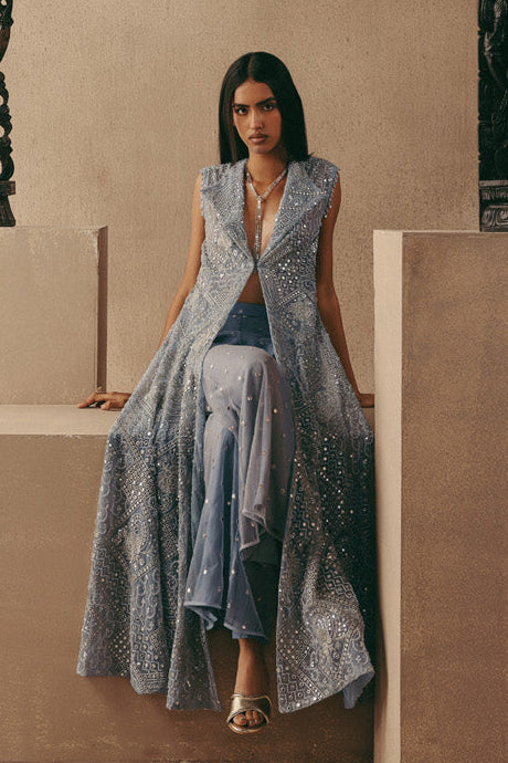 Elevate your occasion wardrobe with this striking blue mirrorwork jacket set by Twenty Nine. Designed with a structured wing collar long jacket paired with tailored pants, this ensemble blends contemporary tailoring with traditional craftsmanship. The intricate mirror detailing enhances the richness of the silhouette, making this mirrorwork jacket set a statement choice for festive evenings and cocktail celebrations. Crafted to offer both structure and fluidity, the jacket drapes elegantly while the pants ensure comfort and balance. This mirrorwork jacket set is ideal for wedding functions, sangeet nights, or reception soirées where refined glamour is essential. The blue hue adds depth and dimension, allowing the mirror embellishments to reflect light beautifully. Style this mirrorwork jacket set with metallic heels and minimal jewellery for a polished, high-impact look. Whether worn at a destination wedding or an upscale celebration, this mirrorwork jacket set delivers timeless elegance with a modern edge, redefining occasion wear for the contemporary woman.