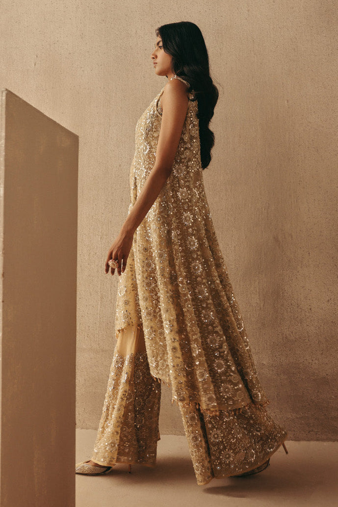 Make a regal statement with this gold mirrorwork sherwani set by Twenty Nine. Designed with an asymmetrical sherwani silhouette paired with tailored pants, this ensemble blends heritage inspiration with modern couture precision. The luminous gold base enhances the intricate detailing, making this mirrorwork sherwani set ideal for wedding festivities and grand receptions. The asym cut introduces contemporary structure, while the mirror embellishments amplify its festive character. This mirrorwork sherwani set is crafted to offer a sharp yet comfortable fit, ensuring ease during long celebrations. Perfect for cocktail evenings or ceremonial events, this mirrorwork sherwani set stands out for its refined tailoring and statement appeal. The coordinated pants complete the ensemble, balancing structure with elegance. Style this mirrorwork sherwani set with minimal accessories to let the craftsmanship shine. Twenty Nine’s design philosophy ensures that this mirrorwork sherwani set embodies celebration, tradition, and modern sophistication in one cohesive look.
