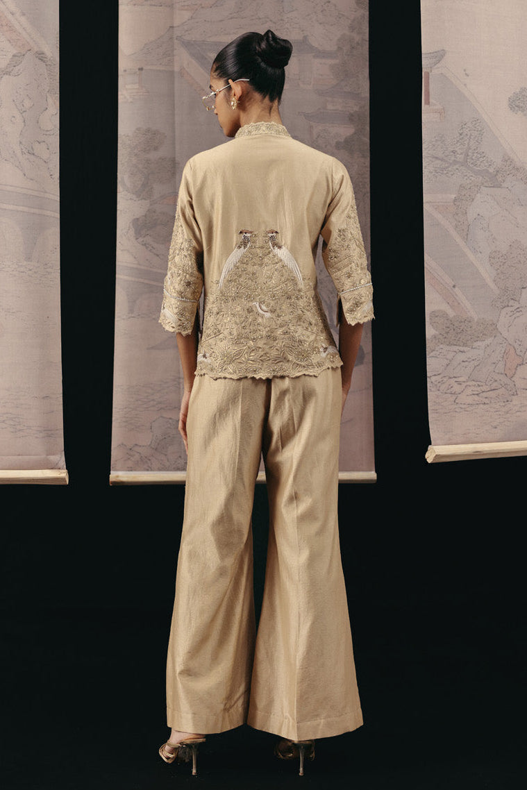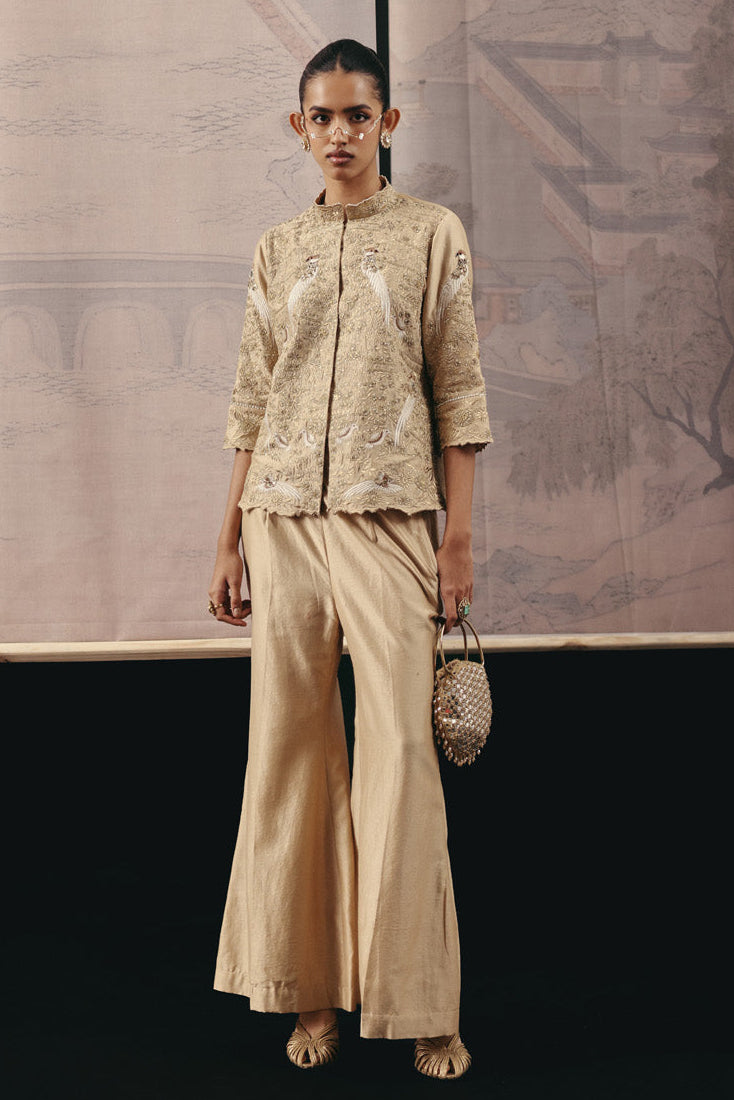 The Gold Zari Parsi Gaara Blazer with Palazzo blazer set is designed for power dressing with heritage charm. Ideal for wedding festivities and evening celebrations, this ensemble combines structured tailoring with detailed embroidery. The luminous gold tone ensures a commanding presence at any event.