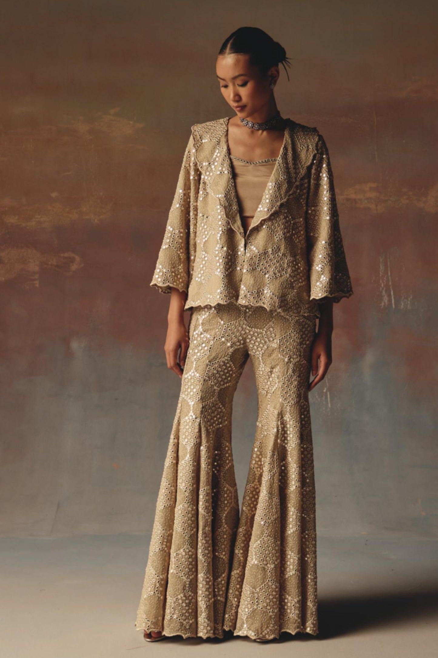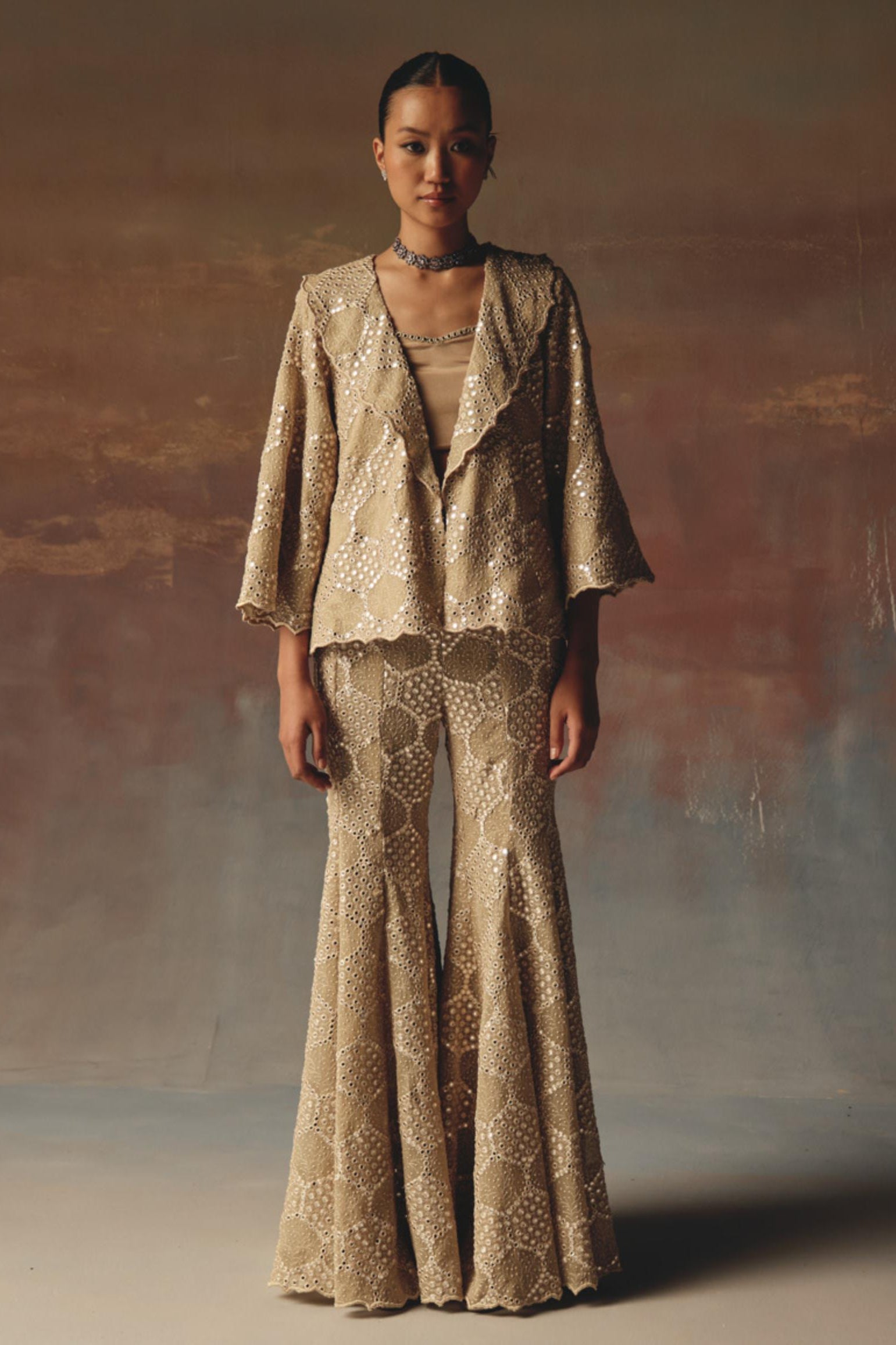 This golden scallop blazer set from Twenty Nine brings sharp tailoring together with festive detailing. The scalloped edges soften the structured blazer, while the bandeau and pants add modern versatility. A refined pick for elegant celebrations.