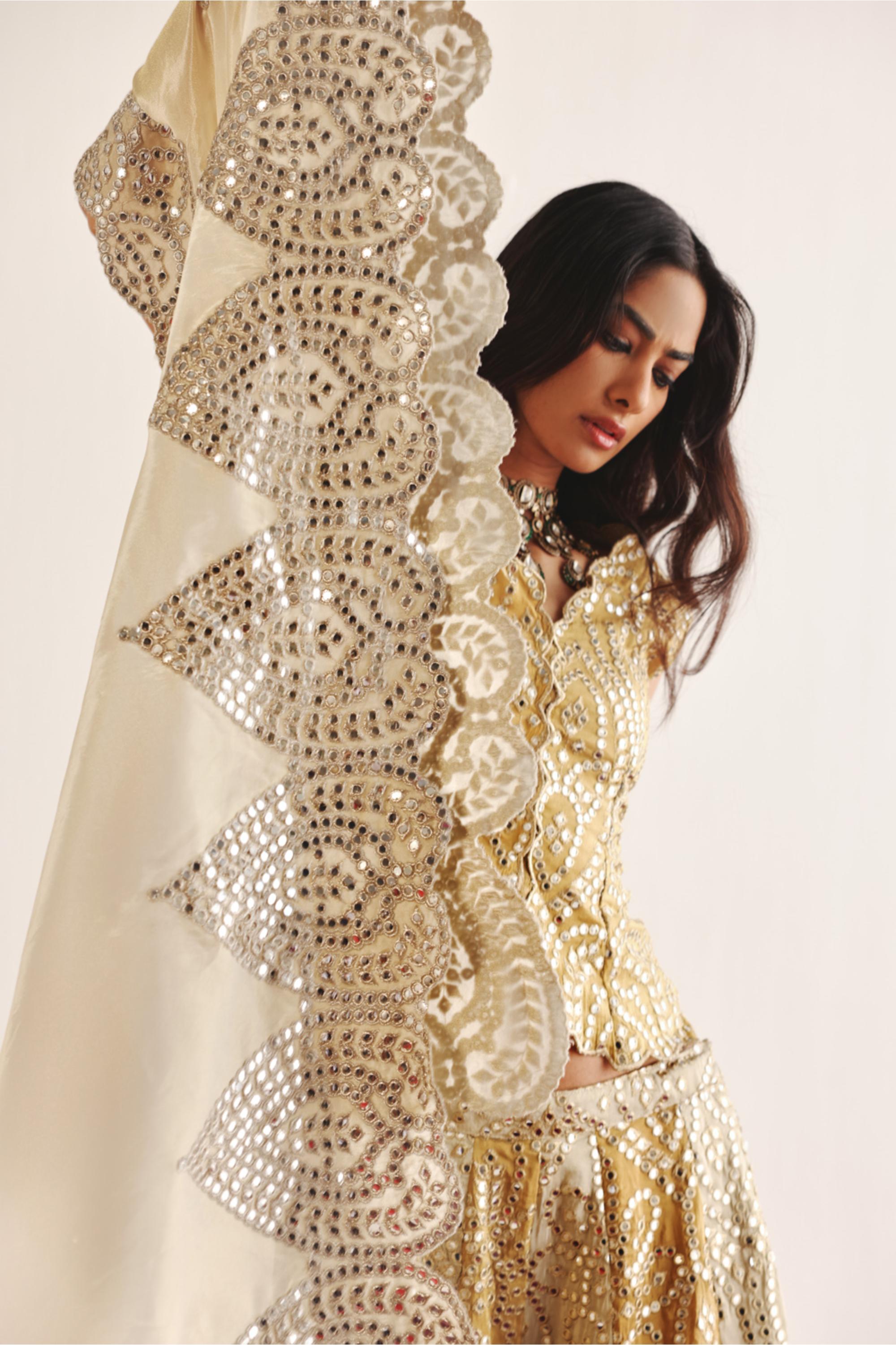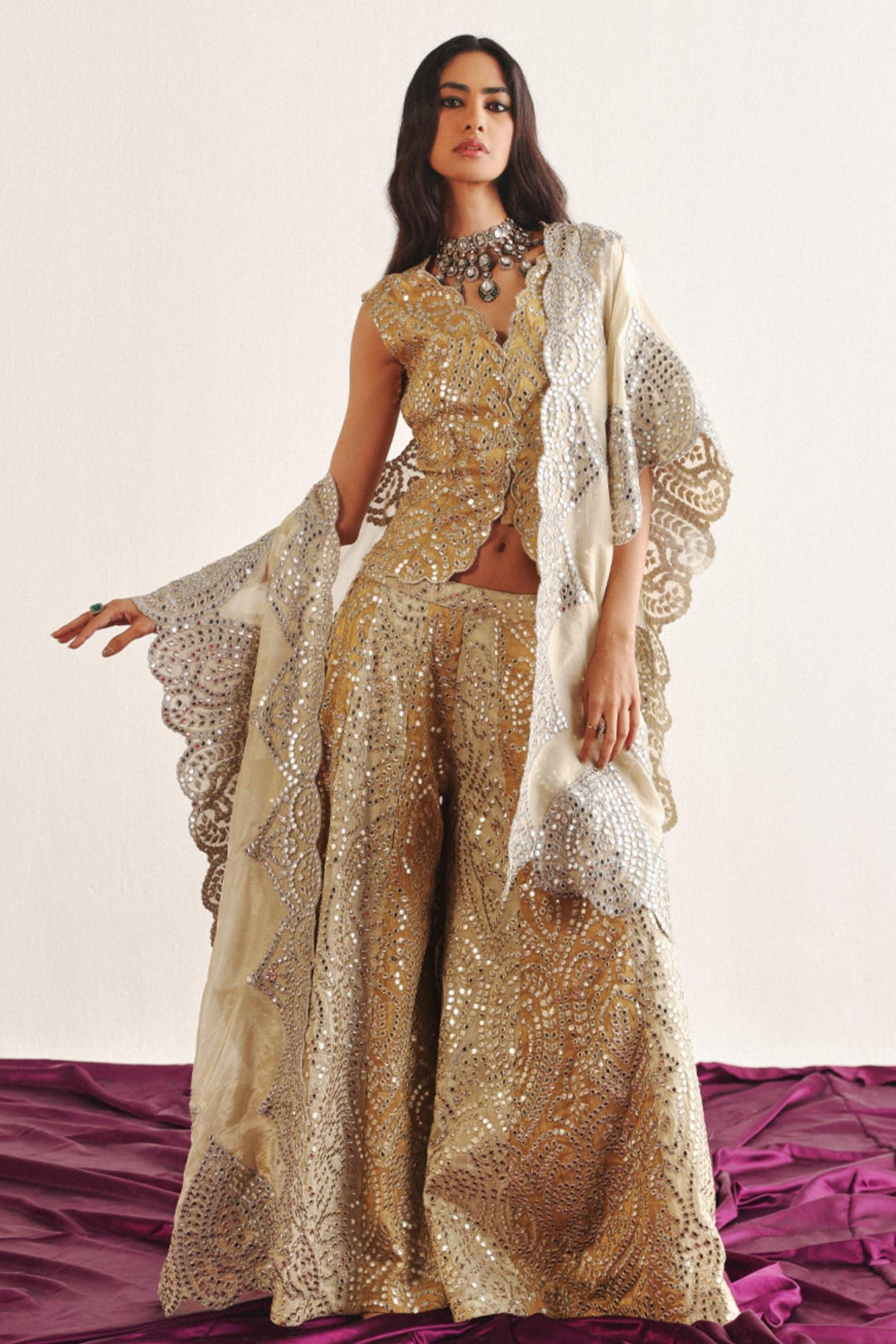 Vibrant and celebratory, the golden yellow flared sharara with cape is crafted for festive brilliance. The flared sharara offers dramatic movement, while the cape adds a contemporary layer. Ideal for haldi functions, sangeet nights, or wedding festivities, this ensemble ensures standout presence with effortless comfort.