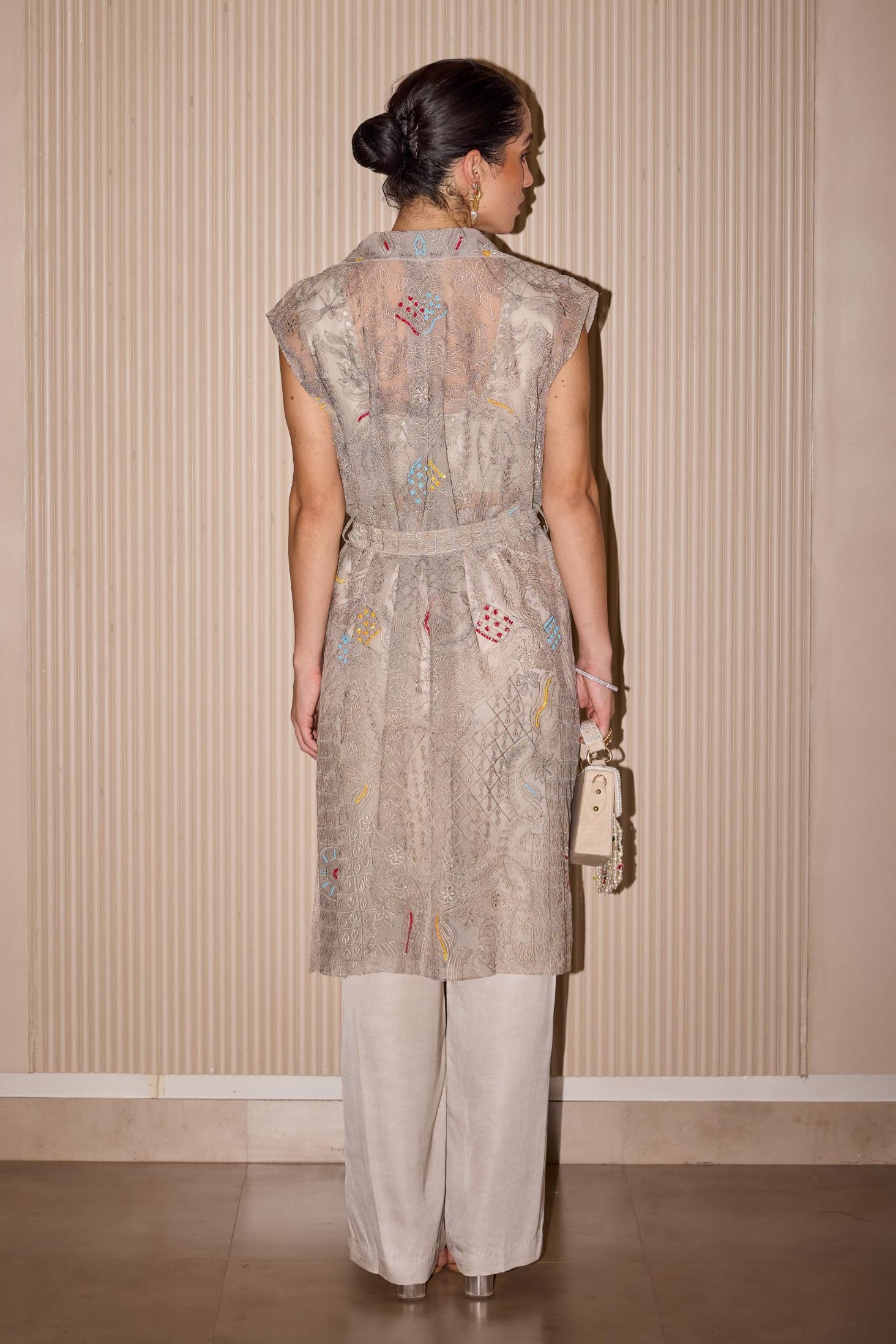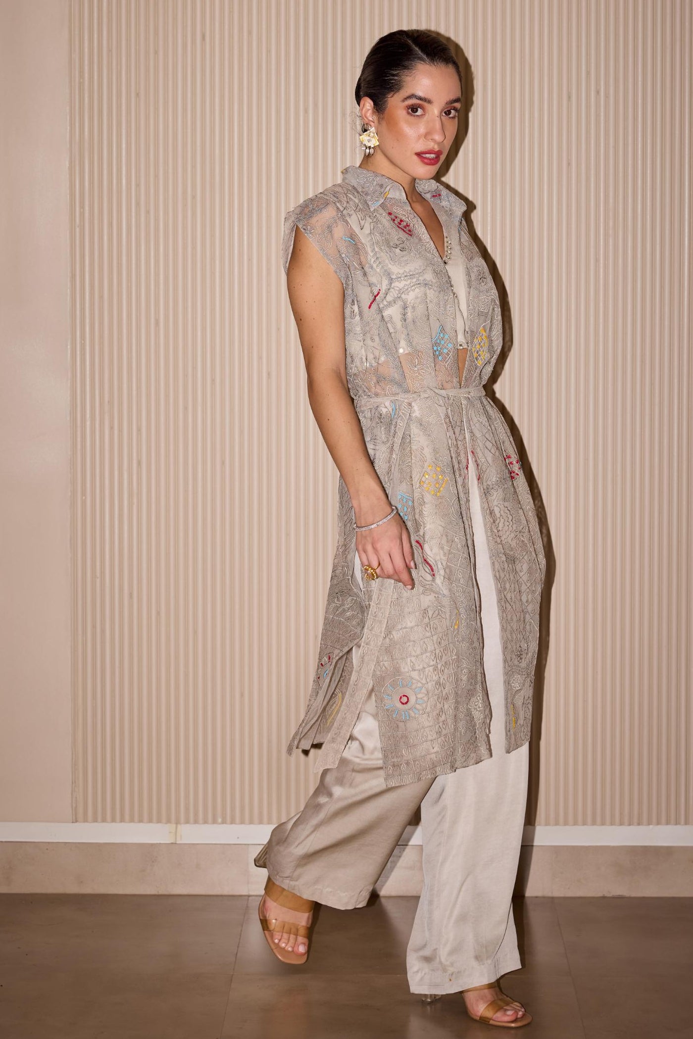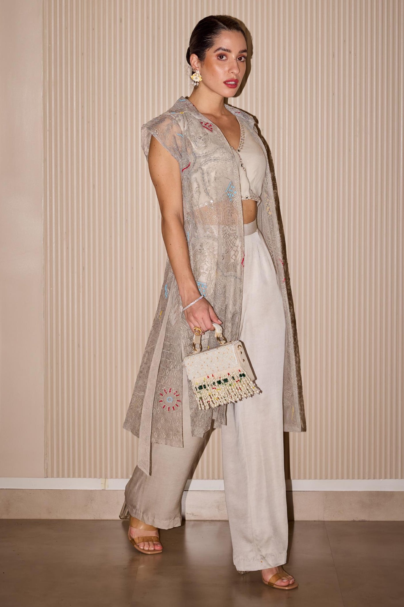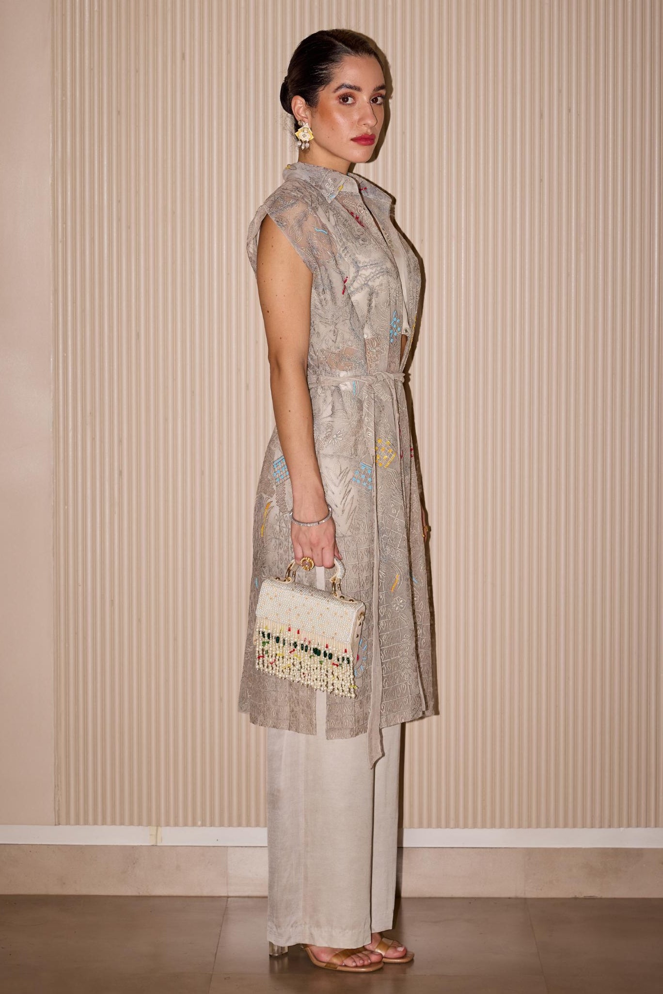 The ivory art deco trench coat set by Twenty Nine blends structured tailoring with statement design. Inspired by art deco aesthetics, this trench coat set is ideal for contemporary festive wear and evening occasions. The ivory palette adds versatility, making it suitable for modern celebrations and layered styling.