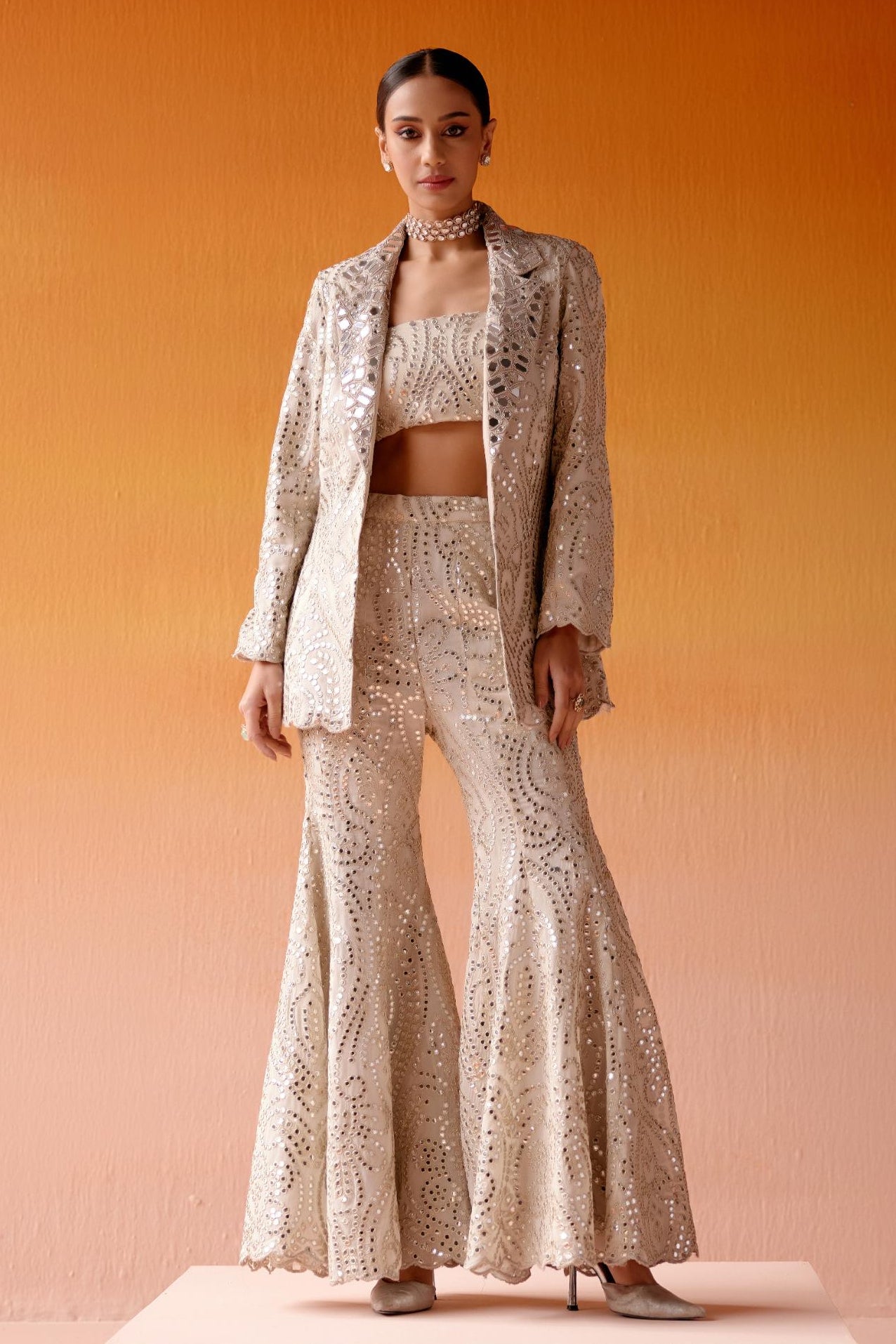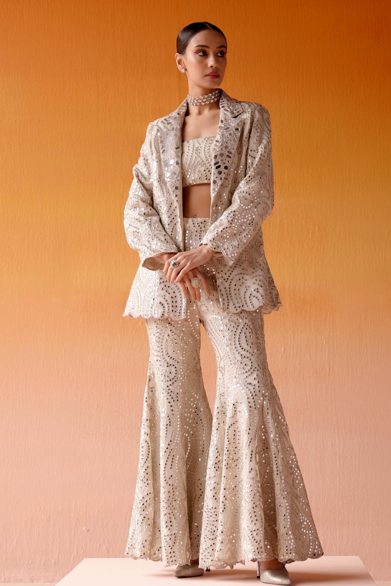 The ivory metallic aaina coat jacket set by Twenty Nine is crafted for Indian wedding occasions. This aaina scallop jacket set features reflective metallic accents and scalloped detailing. Designed for structured elegance, the ivory metallic aaina coat jacket set offers sophistication for festive celebrations. Ideal for wedding functions, the aaina scallop jacket set blends classic tones with modern craftsmanship. Styled with subtle accessories, the ivory metallic aaina coat jacket set completes an elevated wedding look.