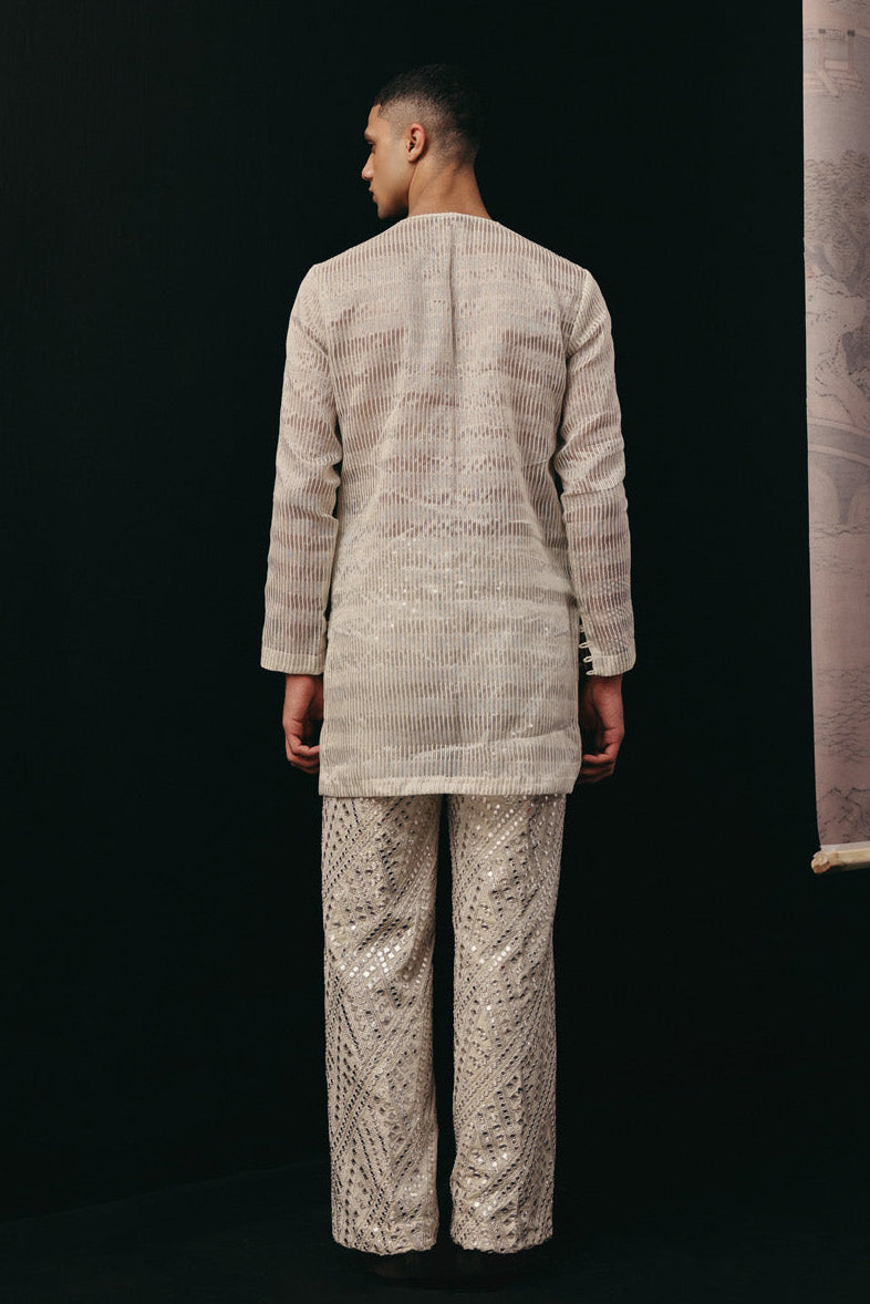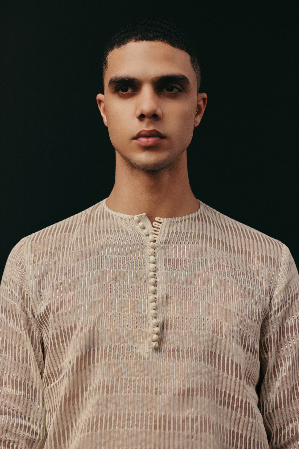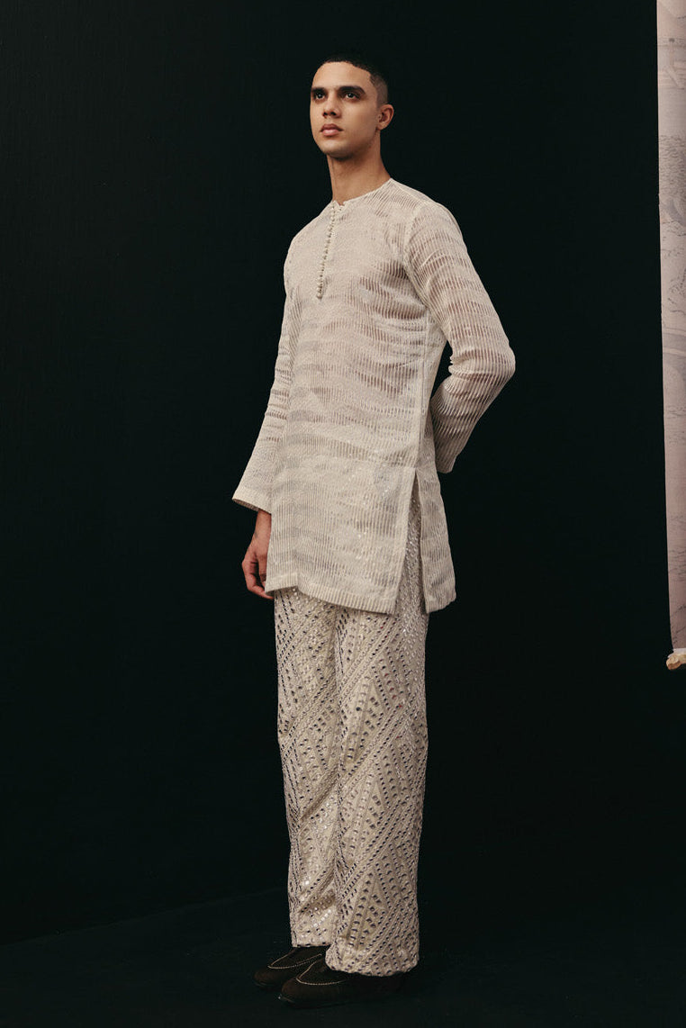 The Ivory Tissue Chanderi kurta set by Twenty Nine is tailored for refined daytime celebrations. Its lightweight texture and subtle sheen make it perfect for engagement ceremonies, festive brunches, and summer weddings. The breathable Chanderi fabric ensures comfort without compromising on sophistication. Style this kurta set with minimal footwear and understated accessories for a polished, effortless look. This piece speaks to those who appreciate craftsmanship, texture, and quiet luxury in traditional menswear.