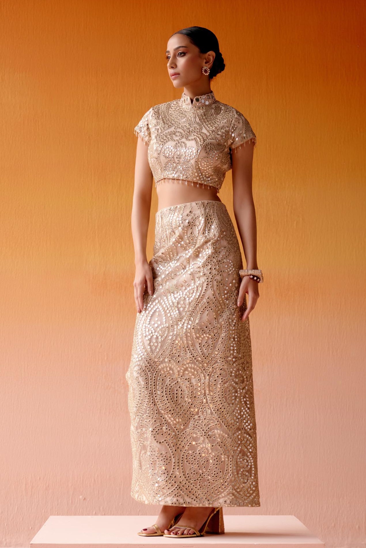 The Metallic Aaina Long Slit Skirt Set by Twenty Nine brings a contemporary edge to festive Indian wear. Featuring a sleek long slit skirt accented with metallic aaina detailing, the set is paired with a structured blouse for a modern silhouette. Designed to balance elegance and boldness, this ensemble is ideal for wedding festivities and evening celebrations. The reflective accents add movement and dimension, highlighting Twenty Nine’s modern design sensibility rooted in traditional craftsmanship.