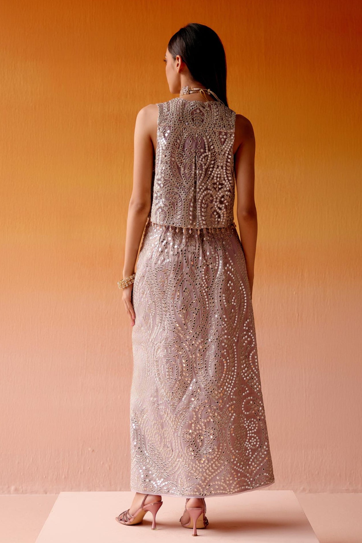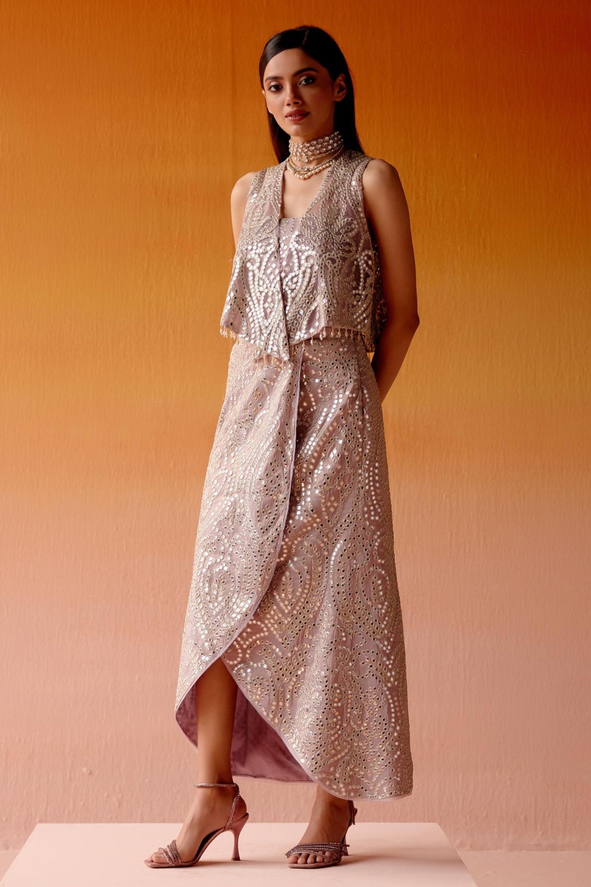 The Pink Aaina Overlap Skirt Set by Twenty Nine reflects a refined balance of tradition and modern elegance. Crafted with mirror-inspired aaina detailing, the ensemble showcases a structured overlap skirt paired with a contemporary blouse silhouette. The soft pink tone adds a romantic charm while maintaining a festive presence suitable for weddings and celebrations. Designed for fluid movement and visual depth, this set highlights Twenty Nine’s signature craftsmanship through metallic accents and clean tailoring. Ideal for bridesmaids, festive soirées, or wedding functions, the outfit offers a graceful yet statement-making appeal rooted in modern Indian design.