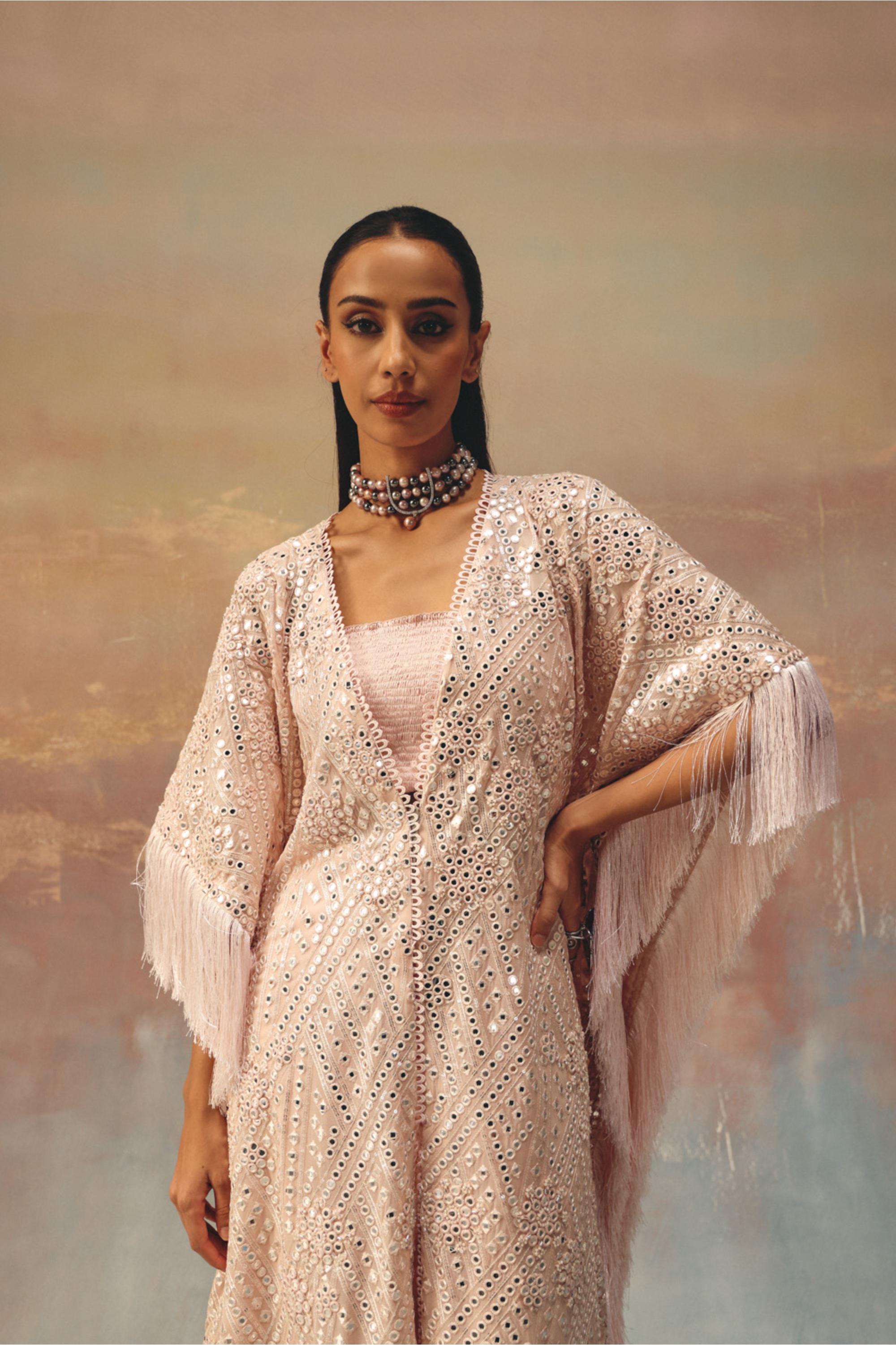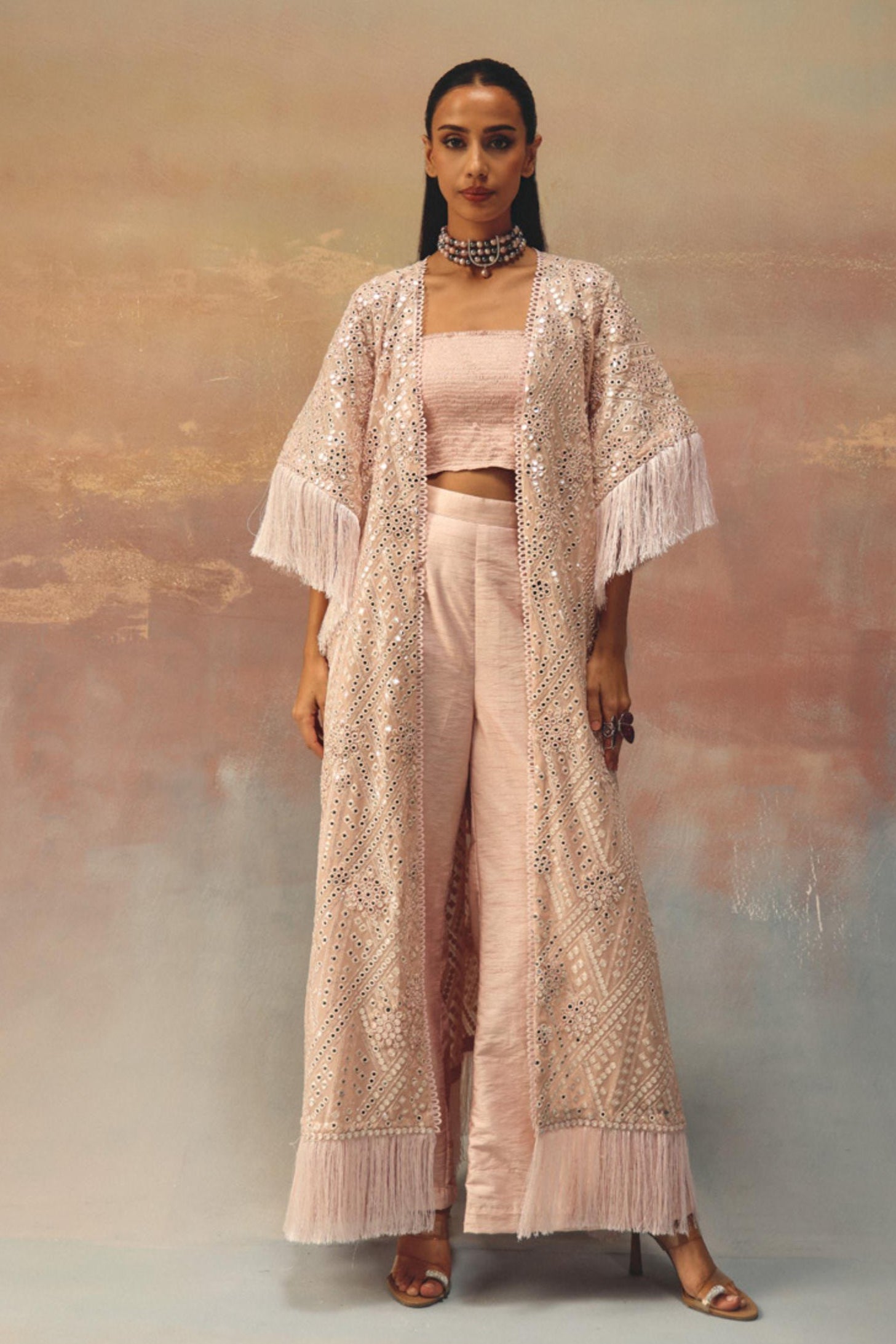 This pink kaftan set by Twenty Nine blends relaxed silhouettes with festive polish. The flowing kaftan drape offers comfort, while the bandeau and pants add structure and versatility.