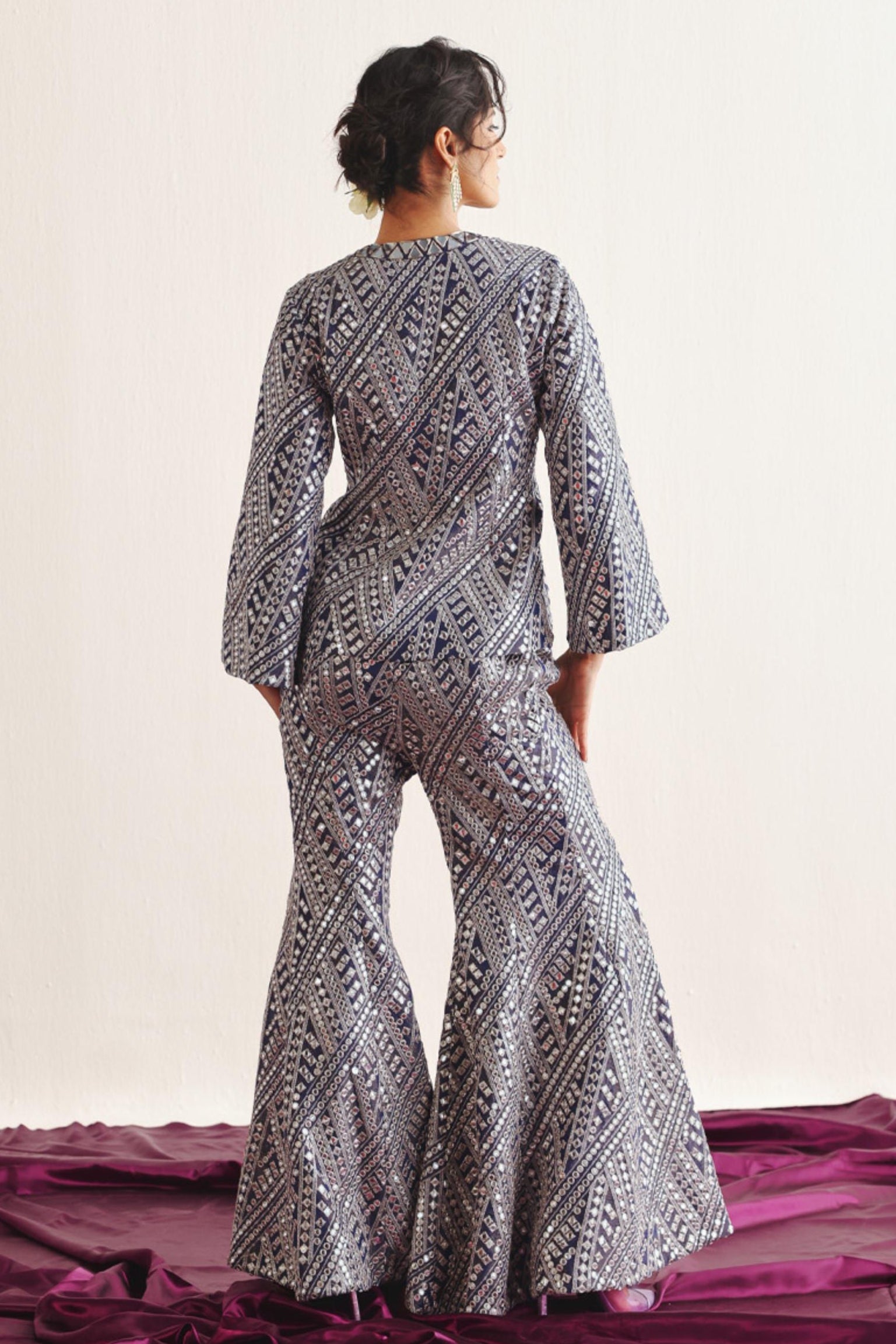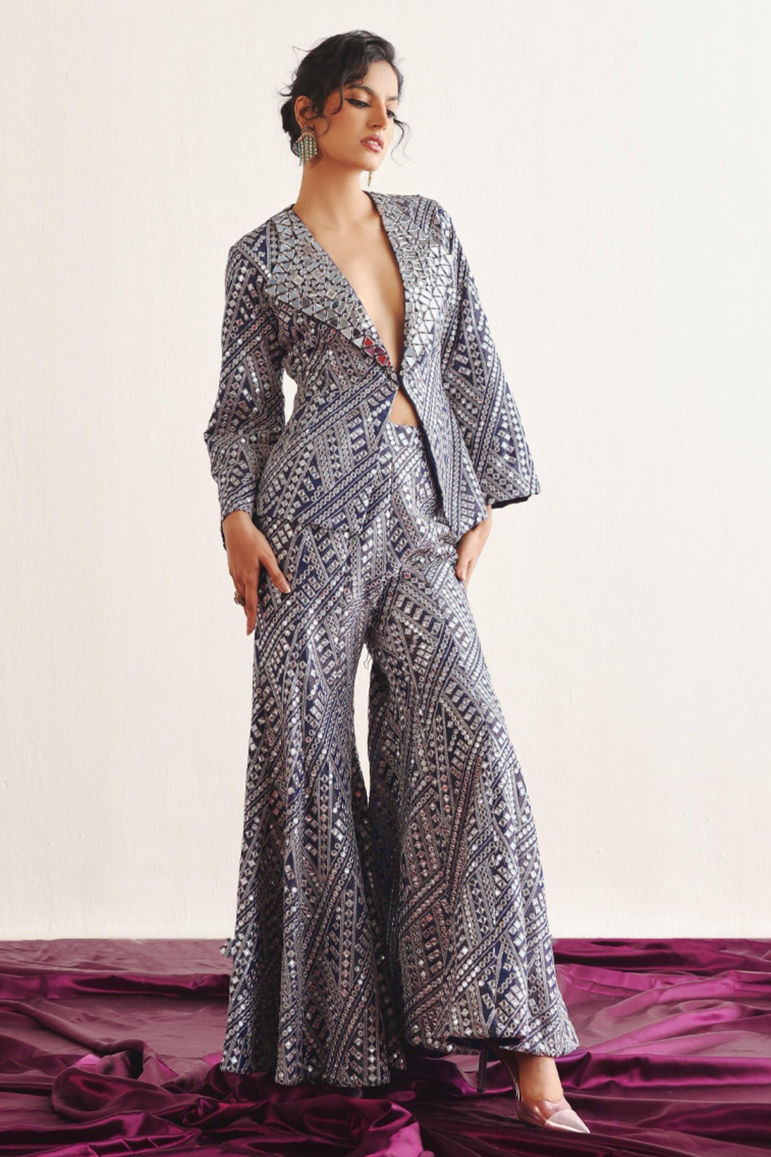 Modern and structured, the purple short blazer with bootcut pants is designed for contemporary festive styling. The cropped blazer adds sharp tailoring, while the bootcut pants balance the silhouette. Ideal for cocktail nights or modern wedding functions, this ensemble offers confident elegance with a fashion-forward edge.