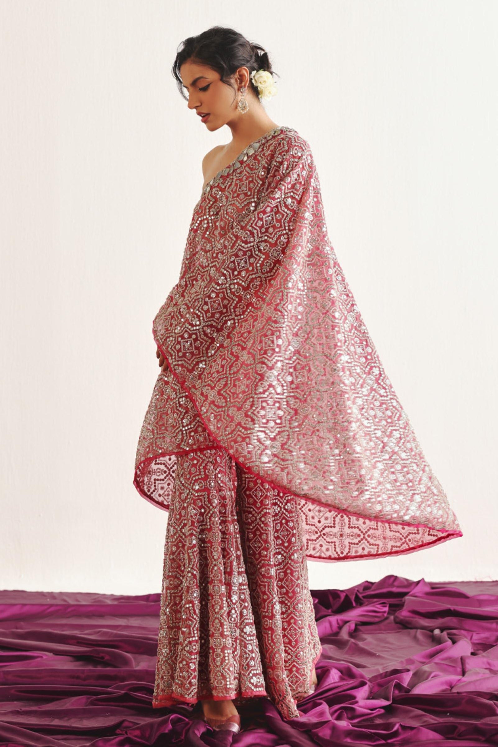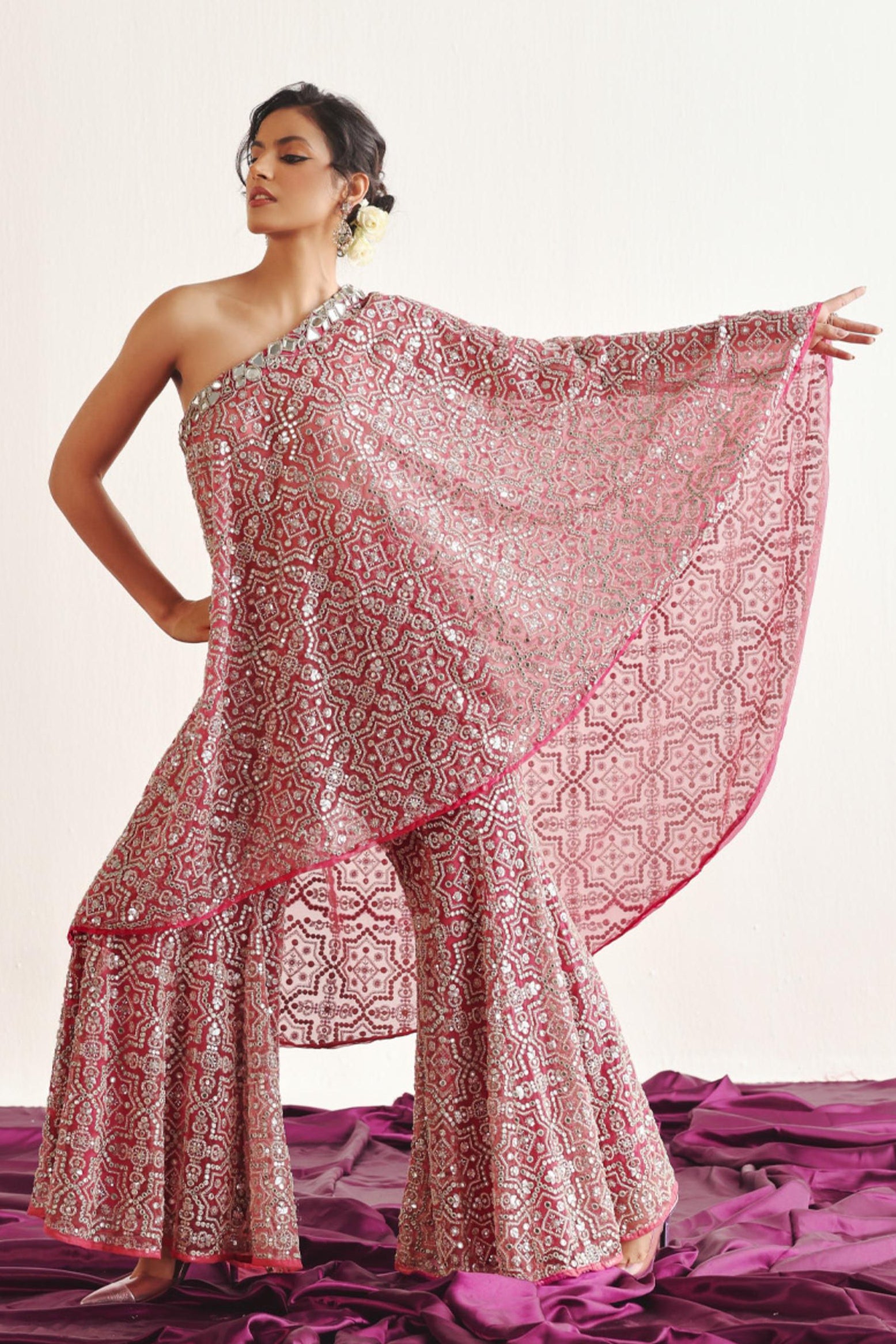 Crafted for bold festive evenings, the red hexagon one shoulder cape with pant is designed to make a striking statement. The asymmetrical cape adds drama, while the structured pants balance the silhouette beautifully. Ideal for sangeet nights, cocktail functions, or modern wedding celebrations, this ensemble reflects confidence and contemporary flair. Perfect for those who prefer standout silhouettes with refined detailing, it allows effortless movement and impactful styling for high-energy celebrations.