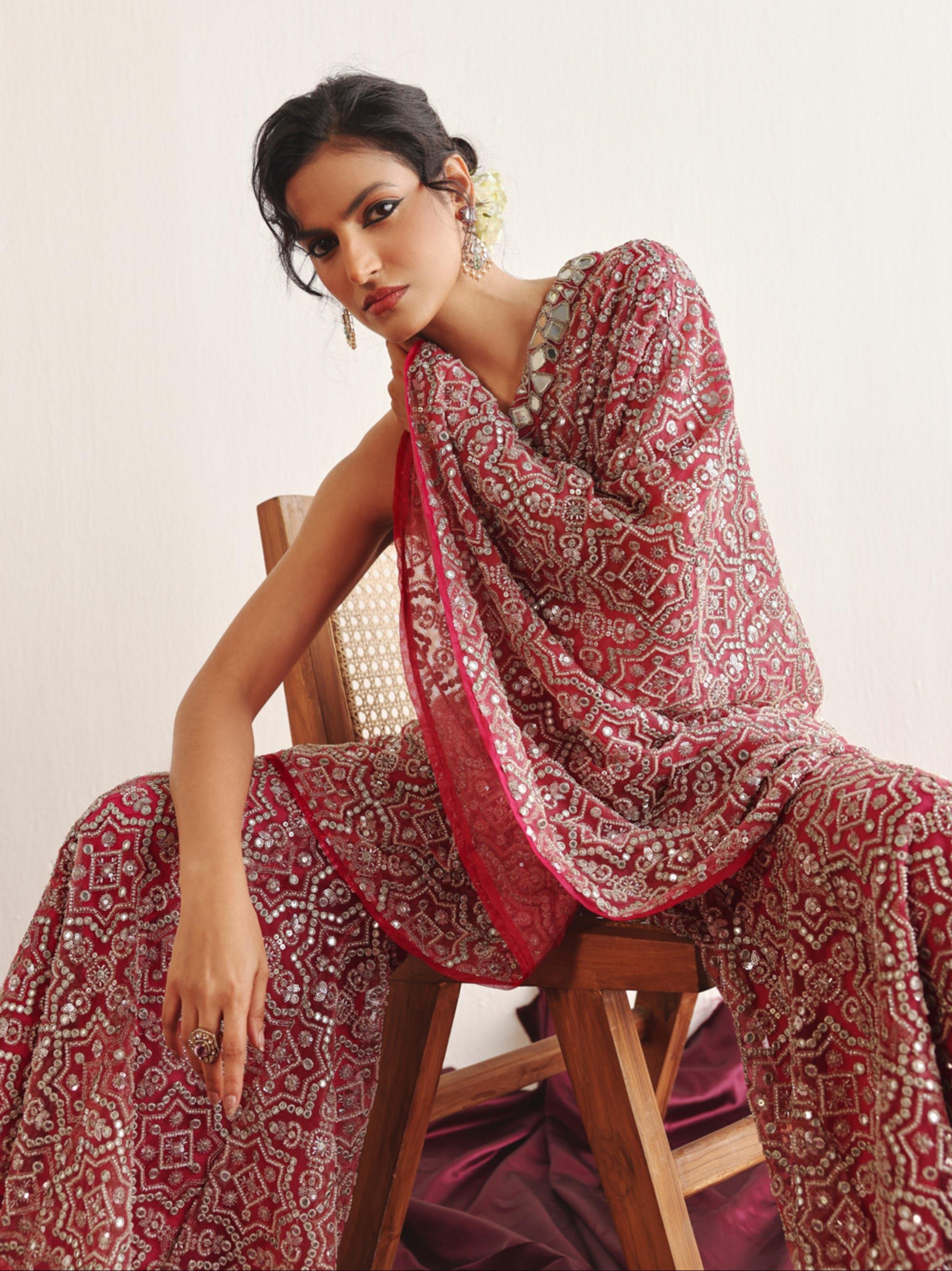 The red cape set is a contemporary festive essential designed for statement occasions. This red cape set features a one-shoulder hexagon cape paired with tailored pants, offering modern structure and fluidity. Ideal for weddings and festive evenings, the red cape set balances comfort and elegance. The bold hue enhances the red cape set, making it suitable for sangeet and cocktail celebrations. Designed for effortless movement, this red cape set allows versatile styling with minimal accessories. Whether styled boldly or subtly, the red cape set ensures a confident presence at every celebration.