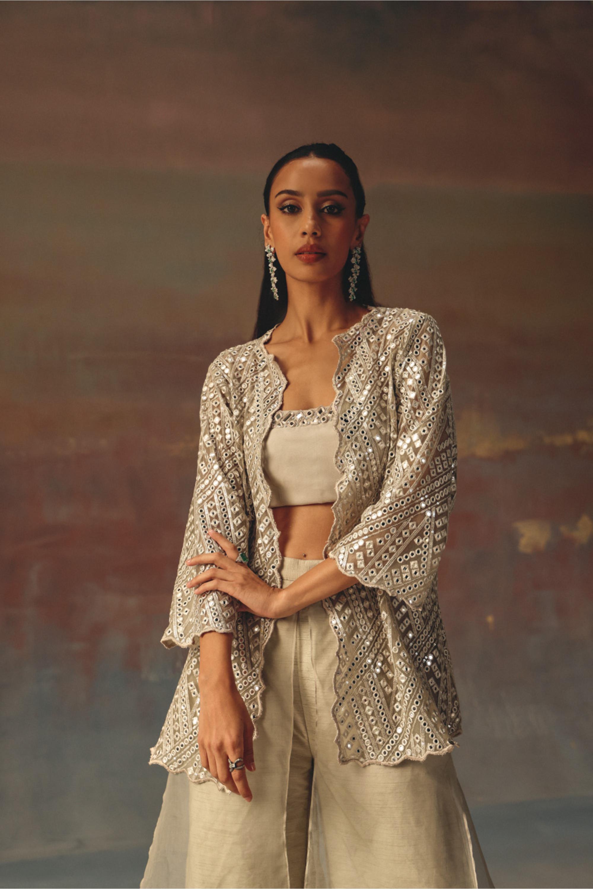 This silver scallop jacket set from Twenty Nine showcases refined craftsmanship and modern festive layering. The scalloped edges add texture, while the bandeau and palazzo complete the look with effortless balance.